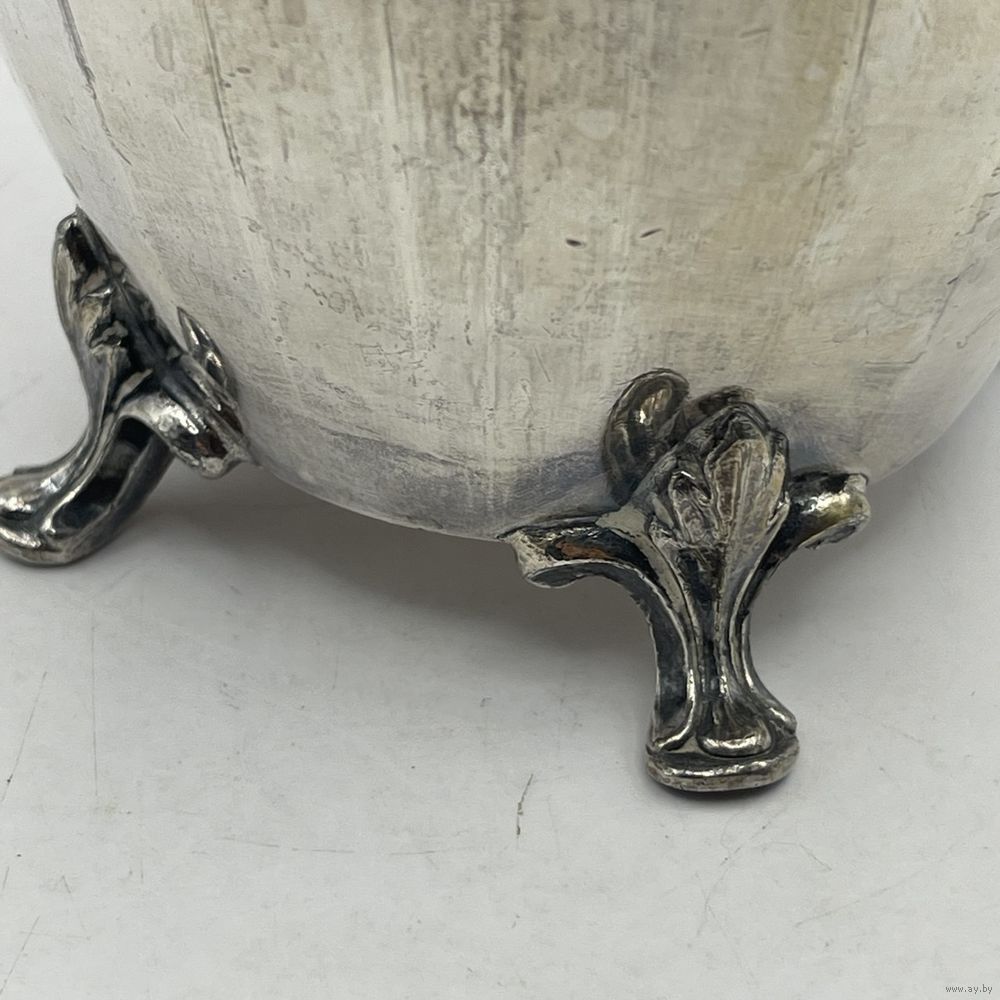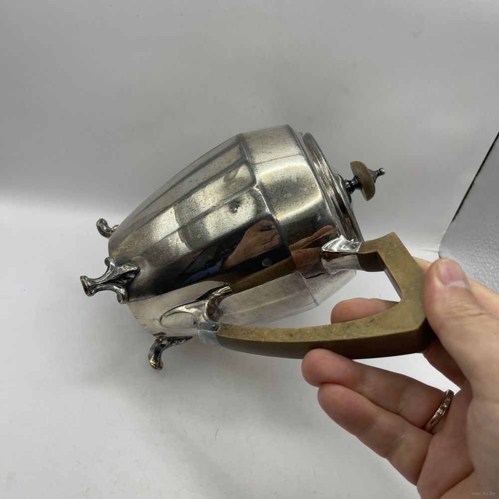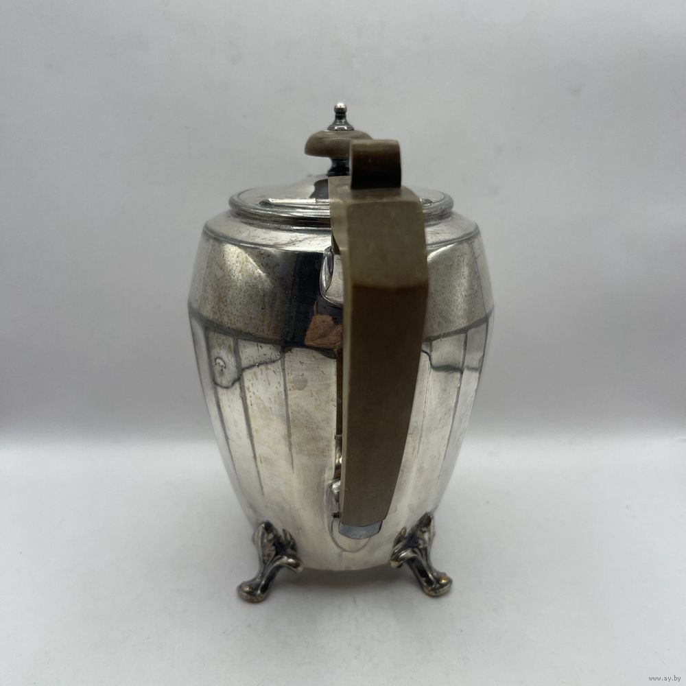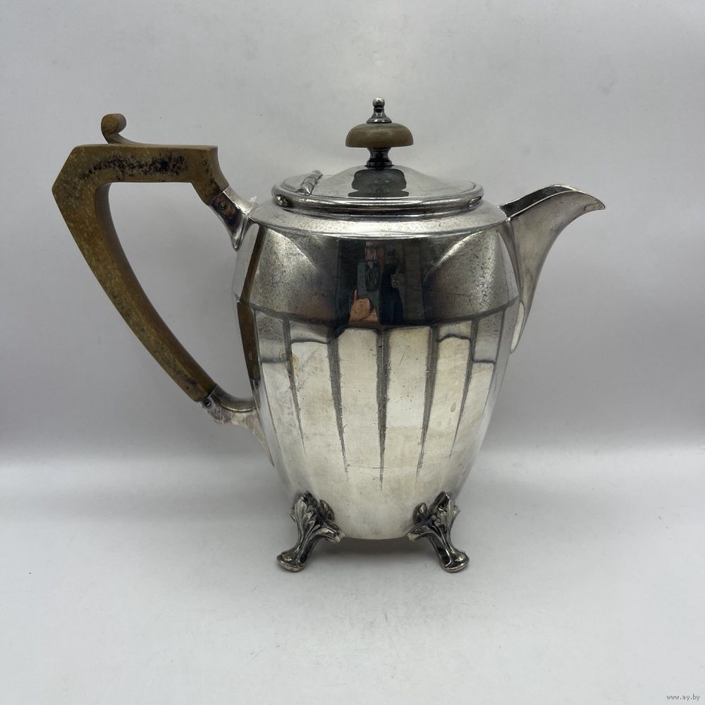 Антикварный чайник/кофейник SHEFFIELD из посеребренного металла в стиле Ар-деко, с откидной крышкой. На фигурных лапах с рельефным растительным декором у основания. Фигурная ручка ручной работы выполнена из ценных пород дерева. Англия. 1930-е г.г. Клейма. Высота 17 см, ширина ручка-носик 21 см, объем 0,9 л. Естественная патина, следы бытования.