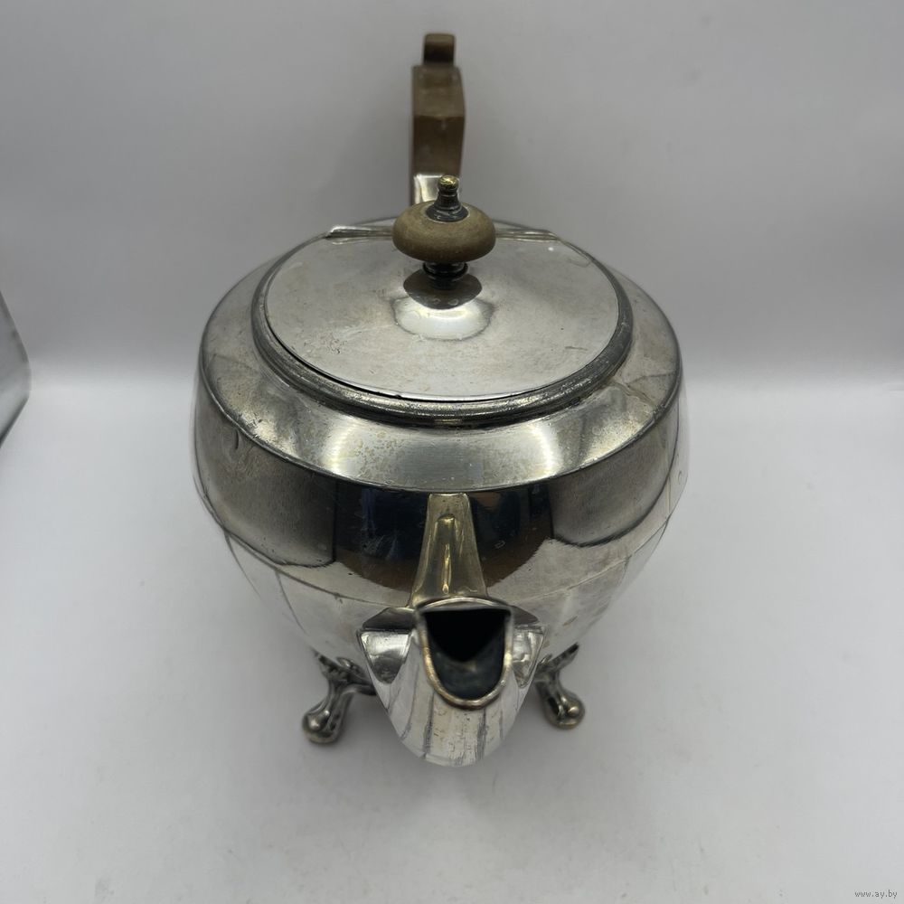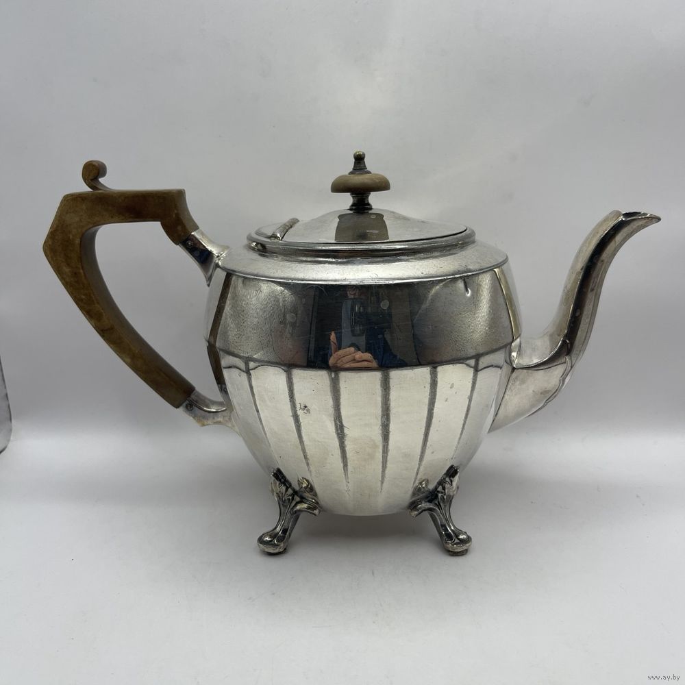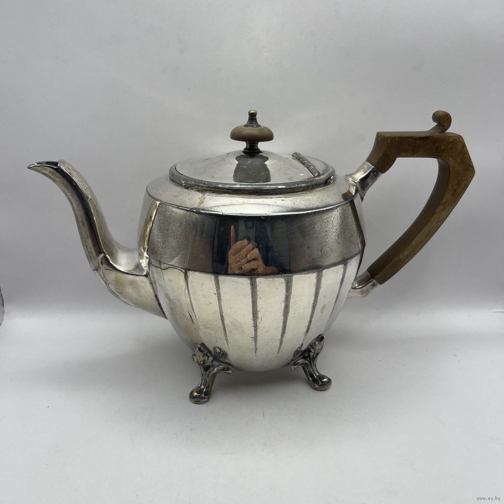 Антикварный чайник SHEFFIELD из посеребренного металла в стиле Ар-деко, с откидной крышкой. На фигурных лапах с рельефным растительным декором у основания. Фигурная ручка ручной работы выполнена из ценных пород дерева. С фильтром для заварки. Англия. 1930-е г.г. Клейма. Высота 15,5 см, ширина ручка-носик 26 см, объем 1,0 л. Естественная патина, следы бытования, незначительная вмятинка (см. фото).