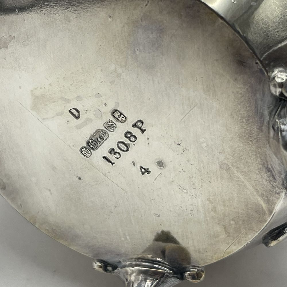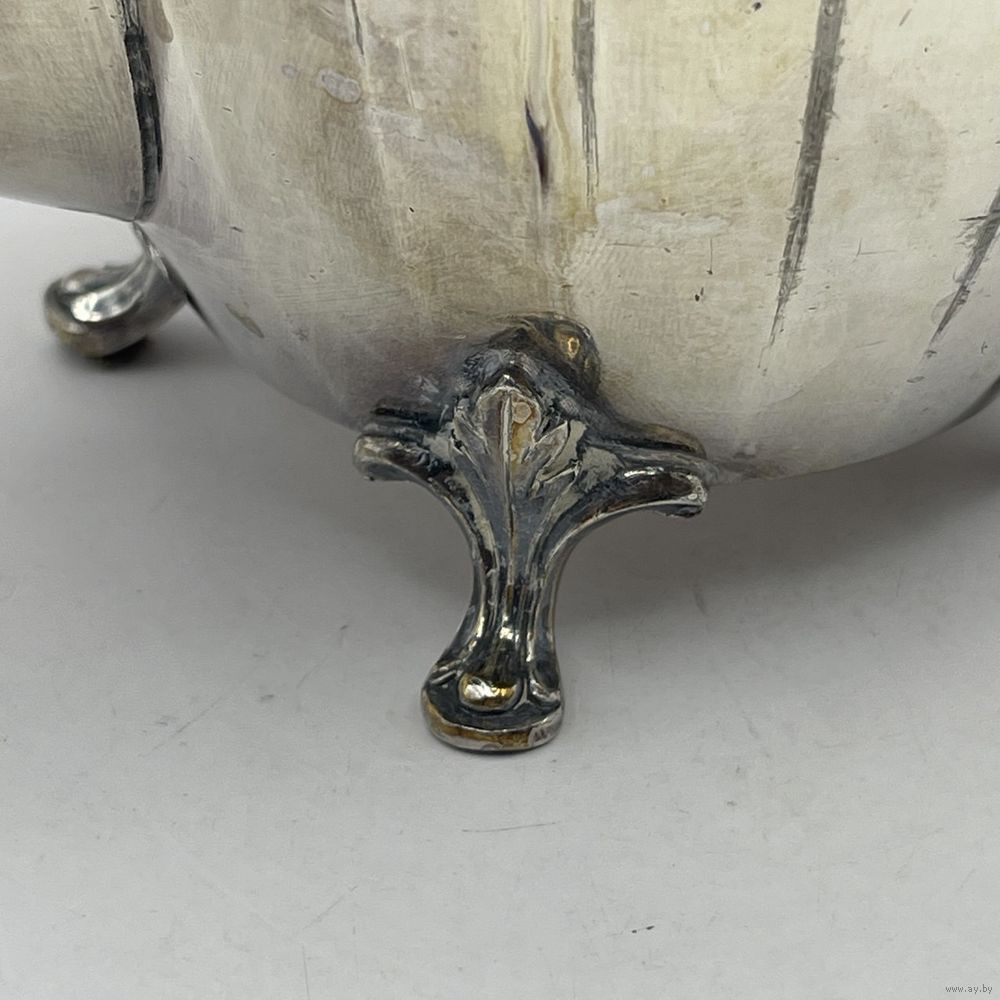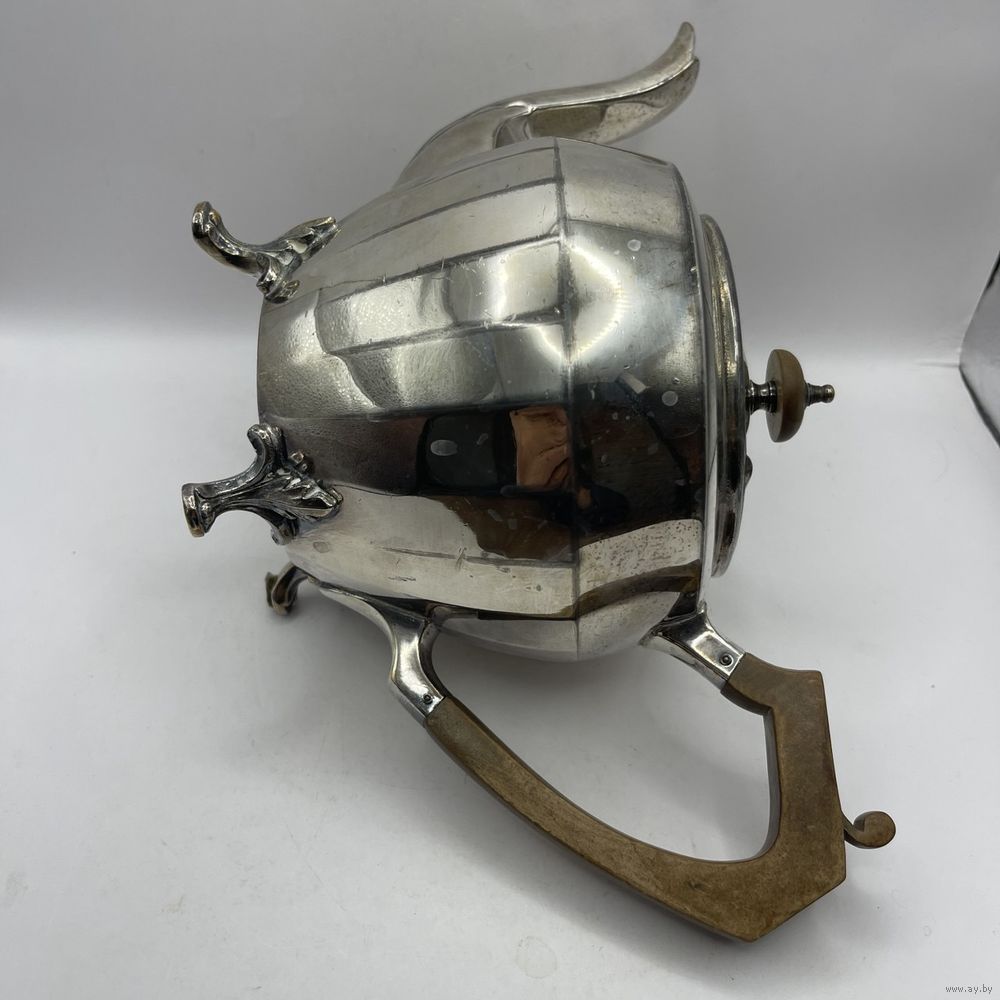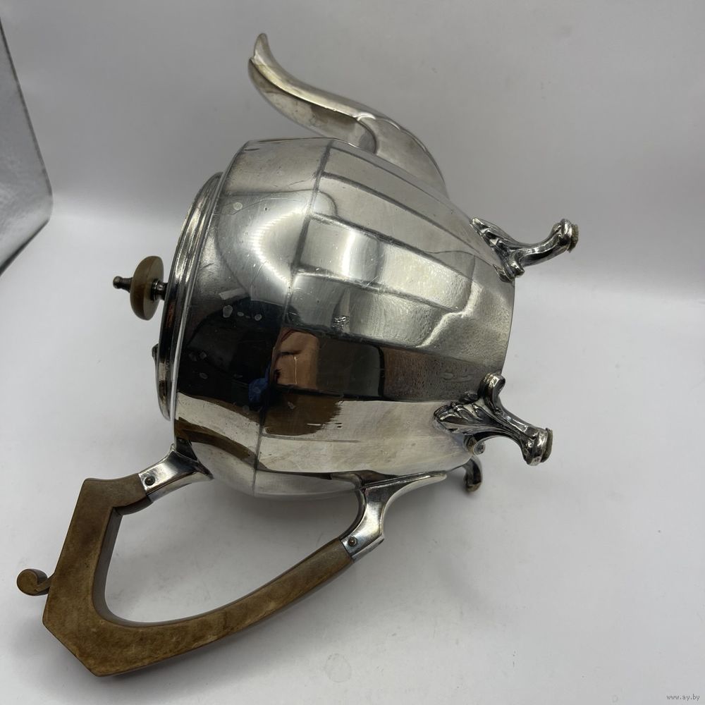 Антикварный чайник SHEFFIELD из посеребренного металла в стиле Ар-деко, с откидной крышкой. На фигурных лапах с рельефным растительным декором у основания. Фигурная ручка ручной работы выполнена из ценных пород дерева. С фильтром для заварки. Англия. 1930-е г.г. Клейма. Высота 15,5 см, ширина ручка-носик 26 см, объем 1,0 л. Естественная патина, следы бытования, незначительная вмятинка (см. фото).
