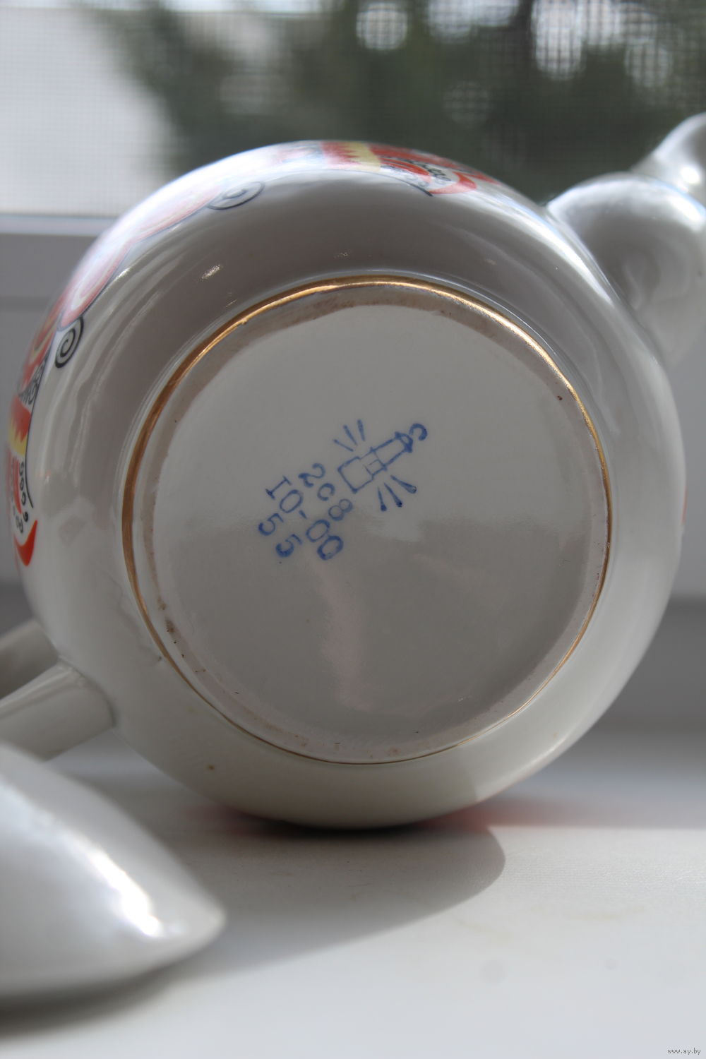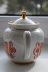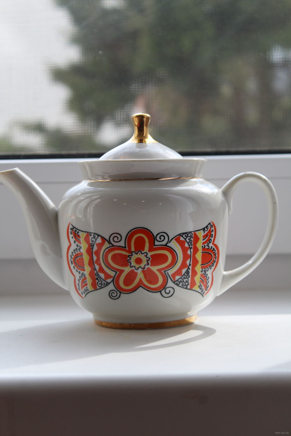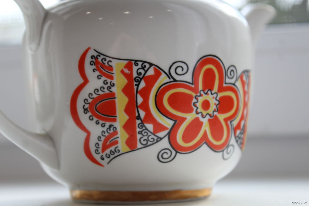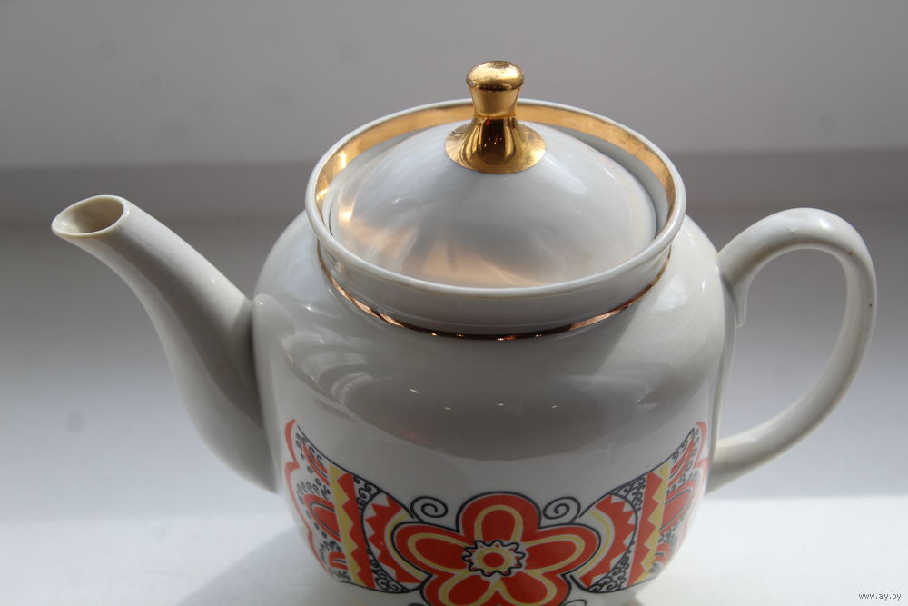 Редкий красивый чайник с золотым оформлением и цветастым ярким узором.