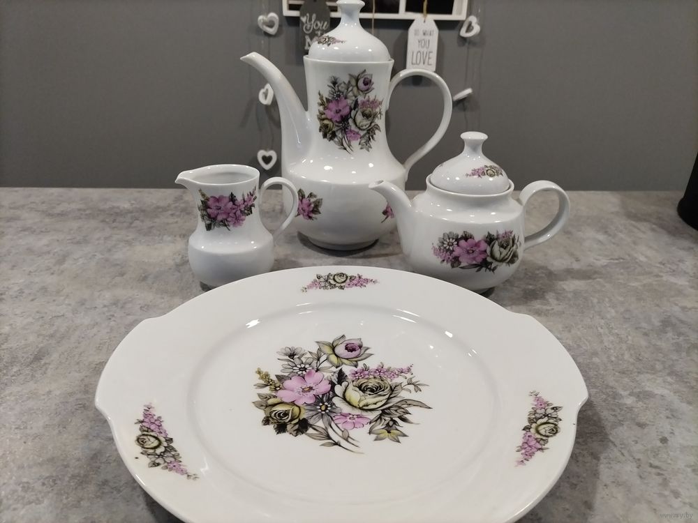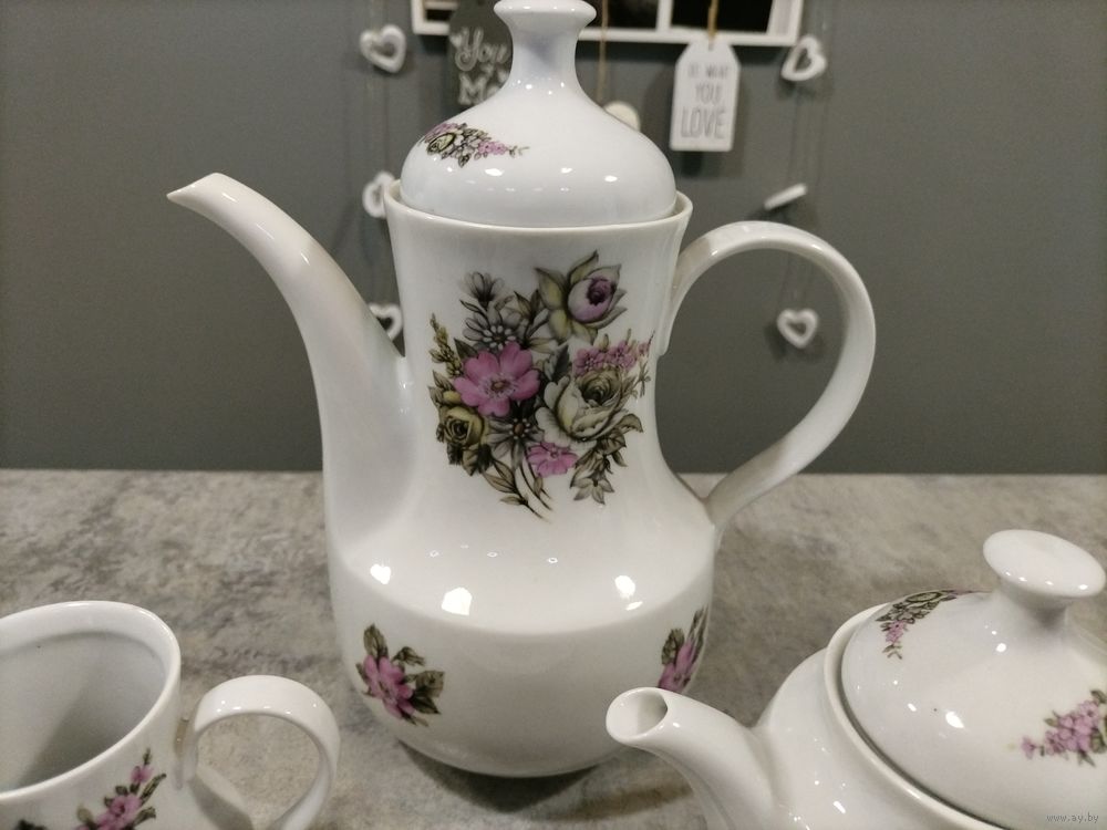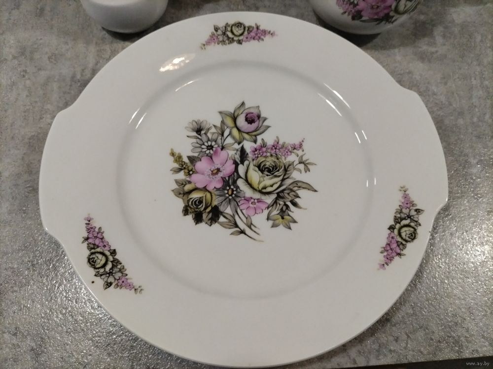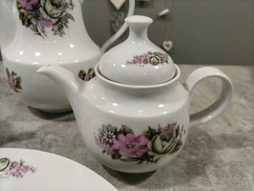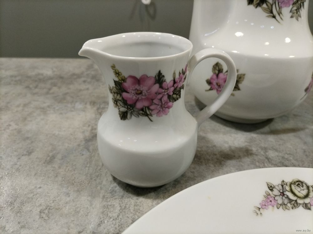 Без следов использования, без сколов. Можно по отдельности. Большой чайник 25 см высотой цена 30 руб, малый заварник 13 см высотой цена 20 руб., молочник 10 руб, блюдо диаметр 28 см, цена 25 руб.