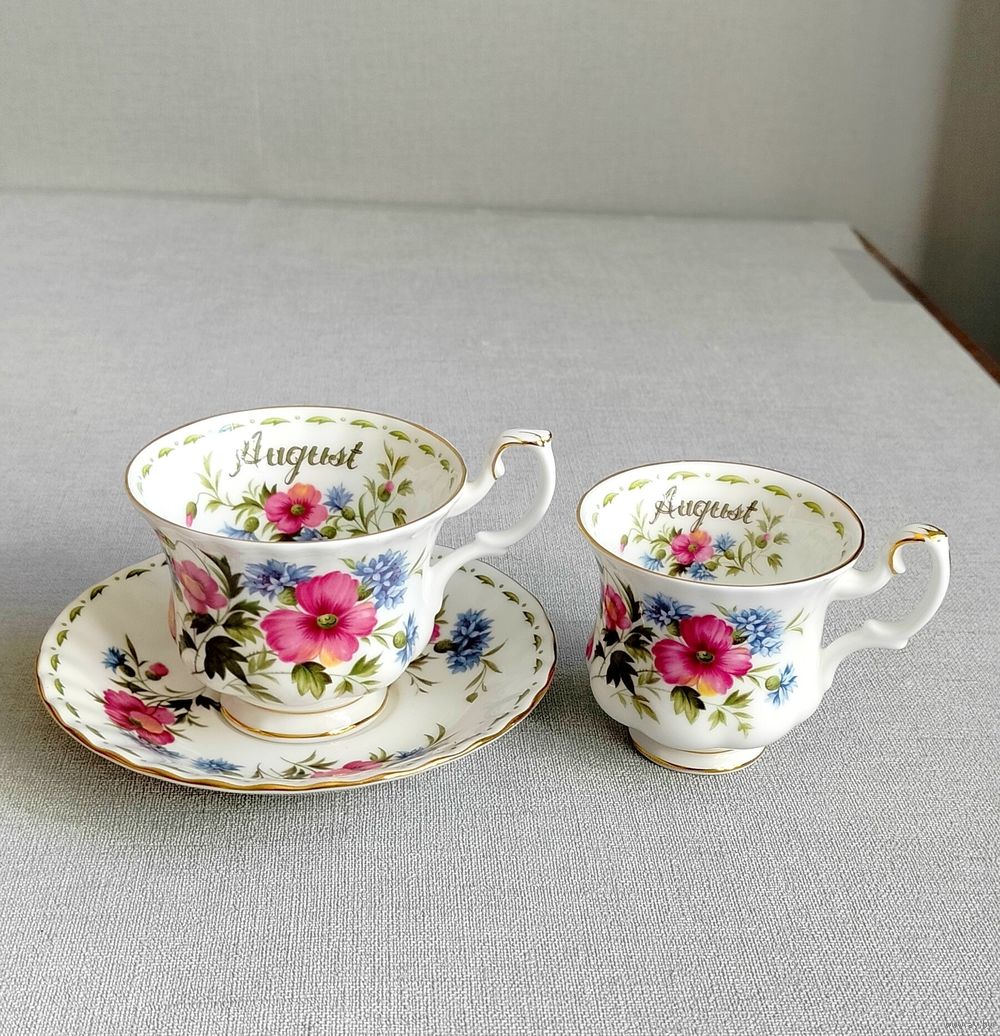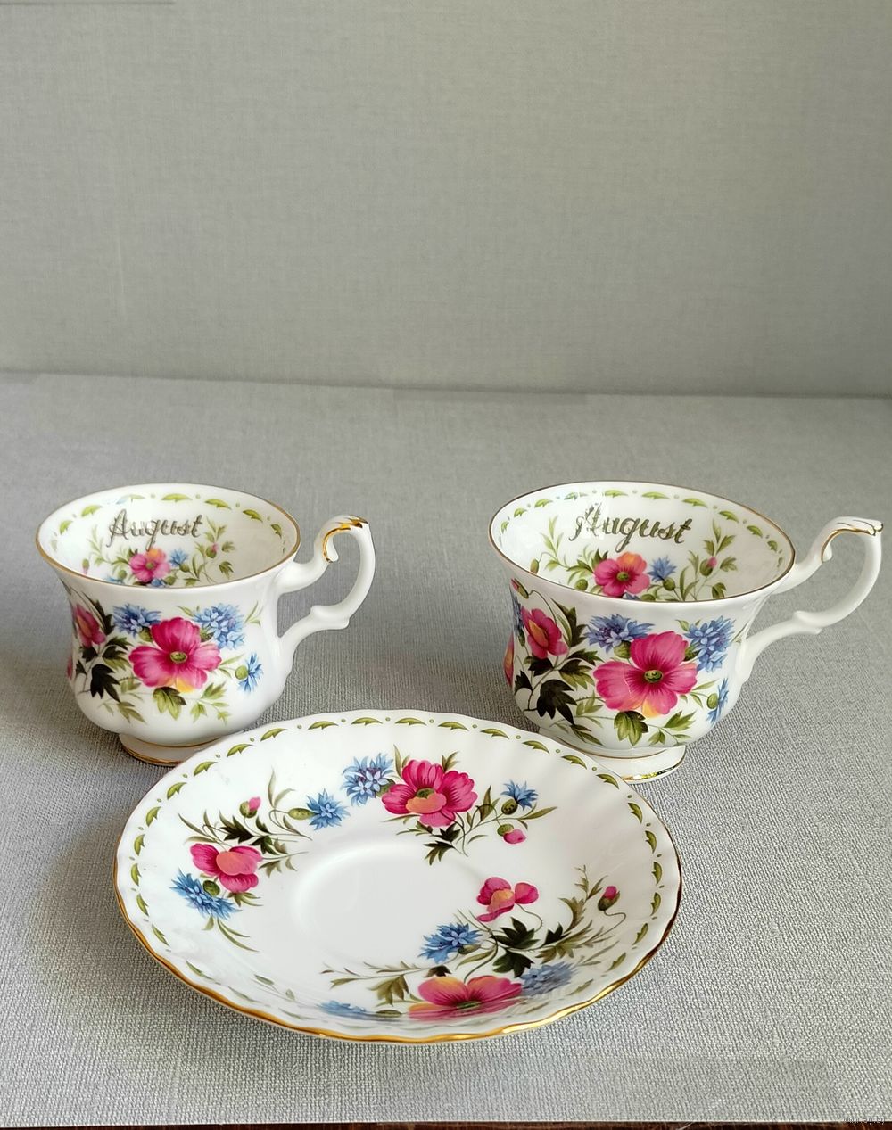 Одним лотом. Чайная и кофейная чашки с блюдцем от престижного бренда Royal Albert, Англия, 1970 года. Украшенные очаровательным цветочным мотивом и отделанные 22-каратной золотой окантовкой, чашки с блюдцем относится к серии «Цветок месяца» и олицетворяет месяц «август». Изготовлены из костяного фарфора ( клеймо - china bone – с англ. «костяной фарфор»)