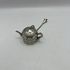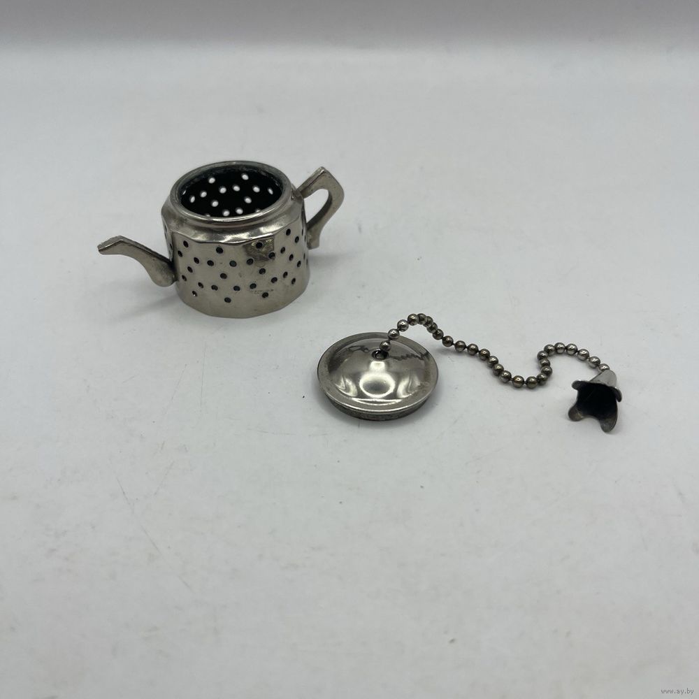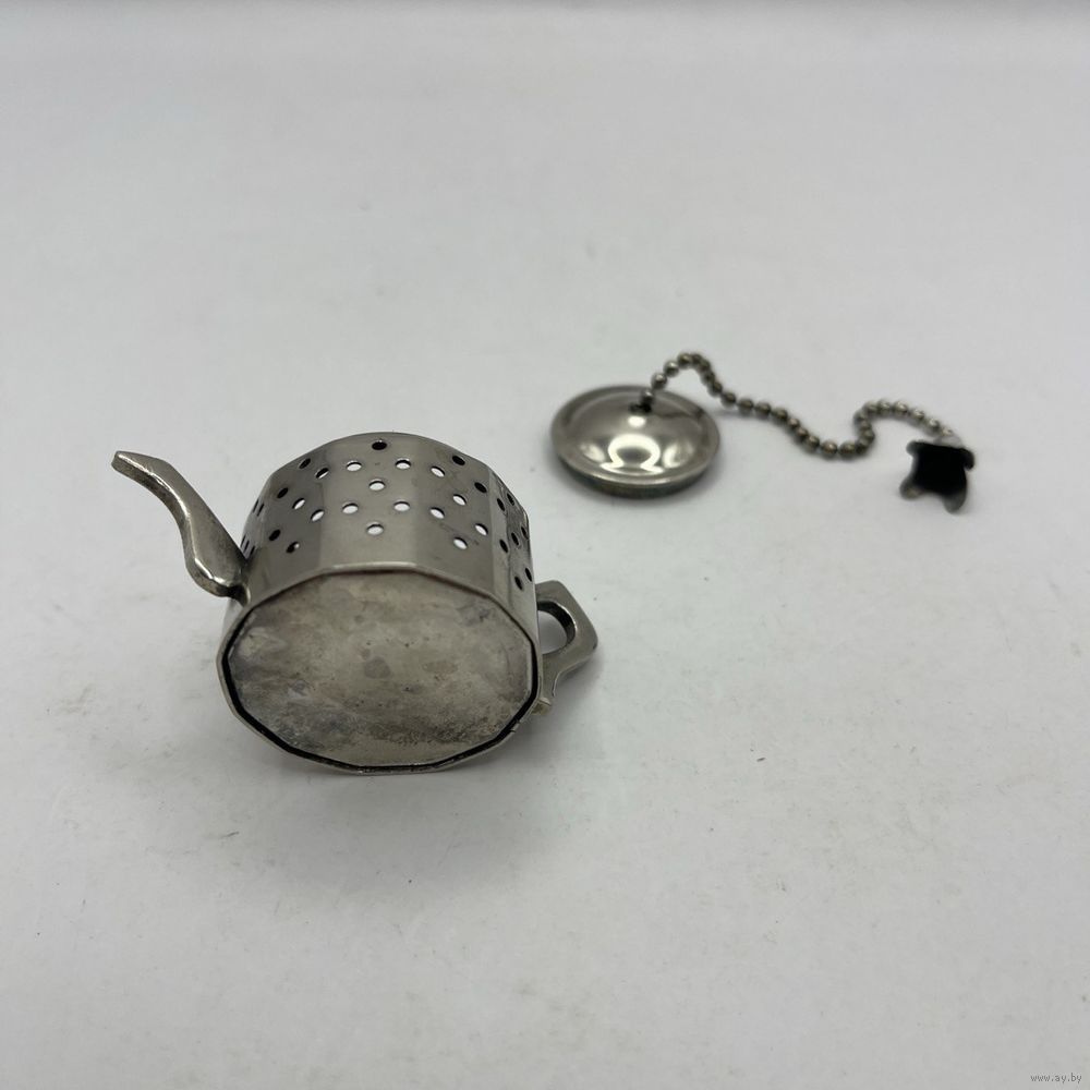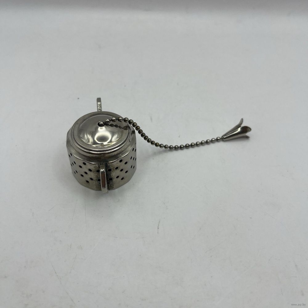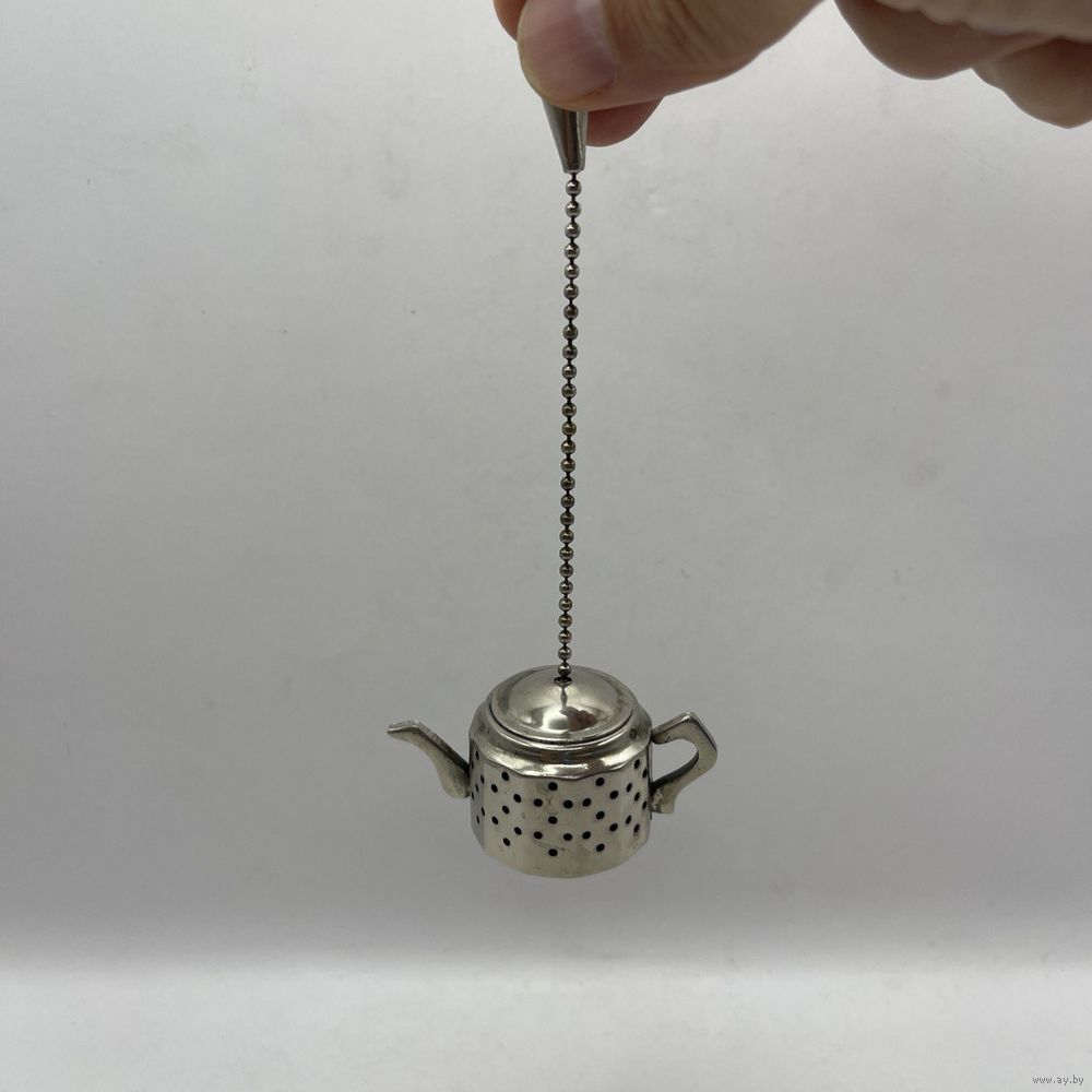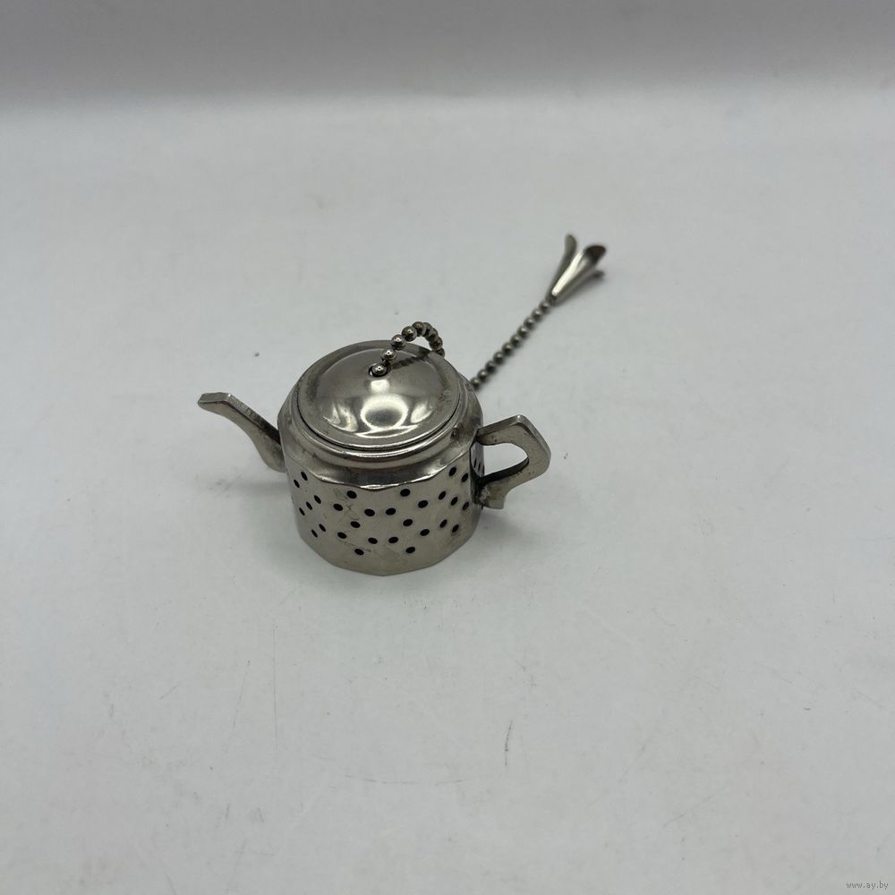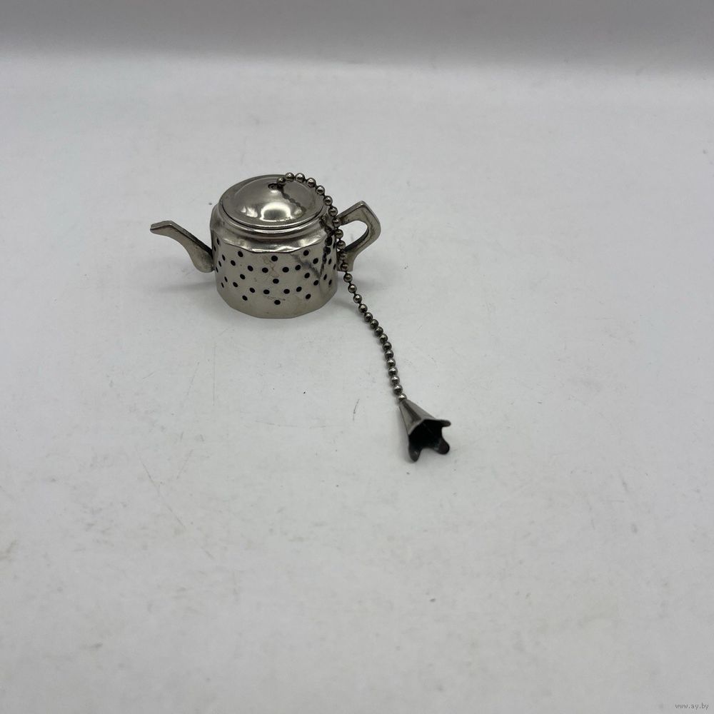 Винтажное ситечко для чая из посеребренного металла в виде миниатюрного чайника на цепочке с ограничителем. Бельгия. 1970-е г.г. Высота 2,5 см, диаметр 3 см. Ширина ручка-носик 6 см. Высота с цепочкой 12,5 см. Естественная патина.