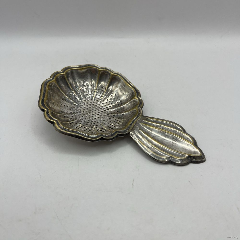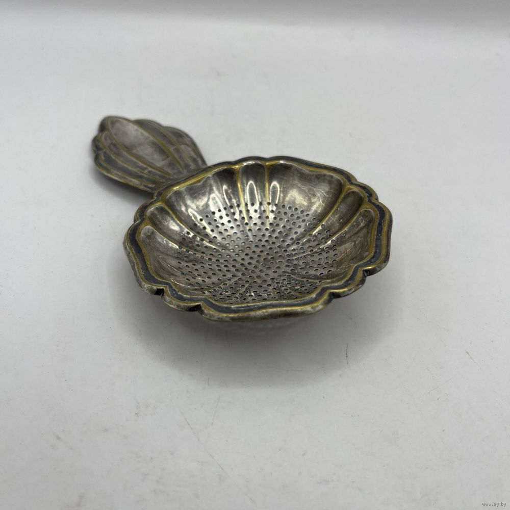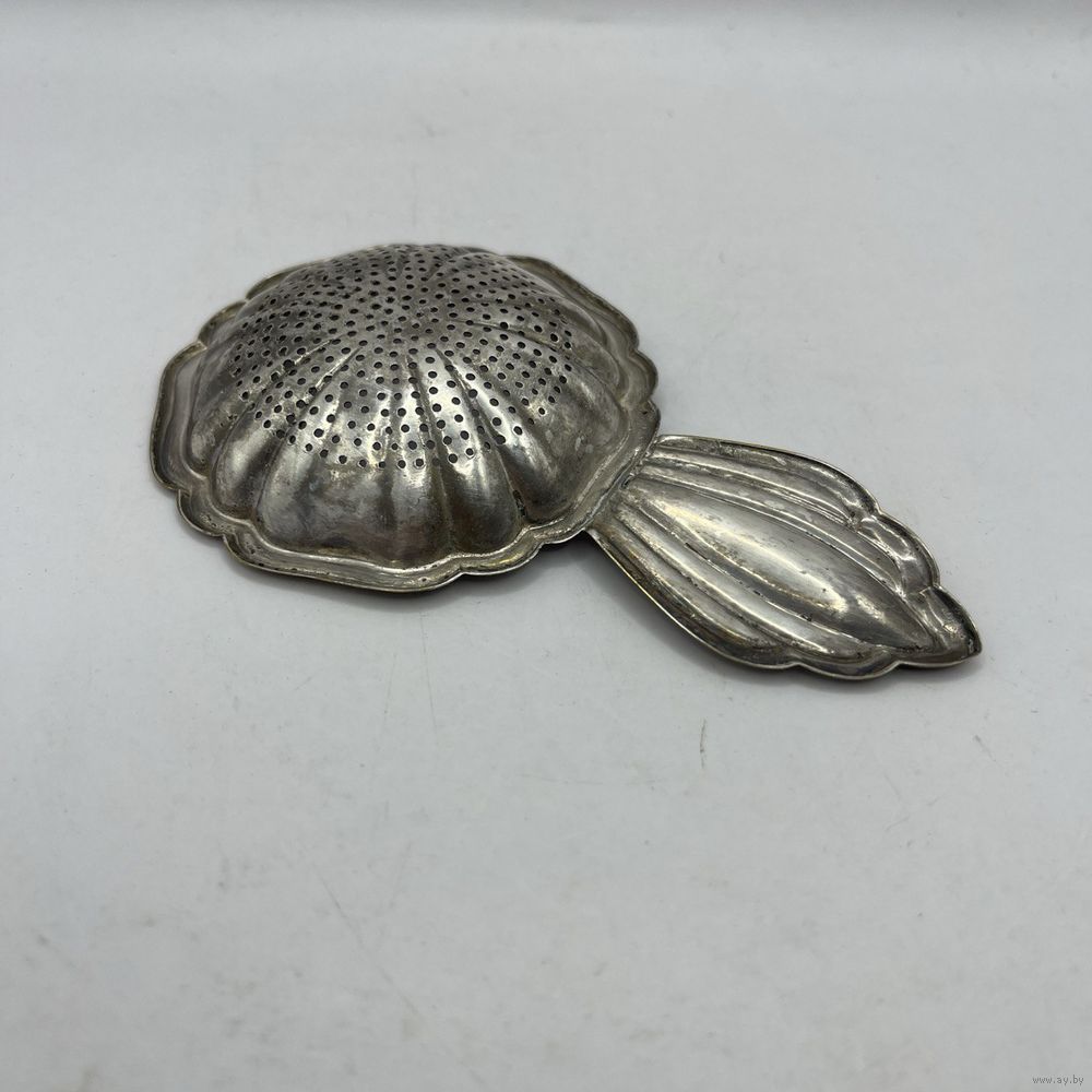 Антикварное ситечко для заварки из посеребренной листовой латуни. Чайное ситечко выполнено в форме цветка с фигурной рельефной ручкой. Франция. 1950-е г.г. Диаметр 7,5 см, длина по ручке 13 см. Естественная патина.