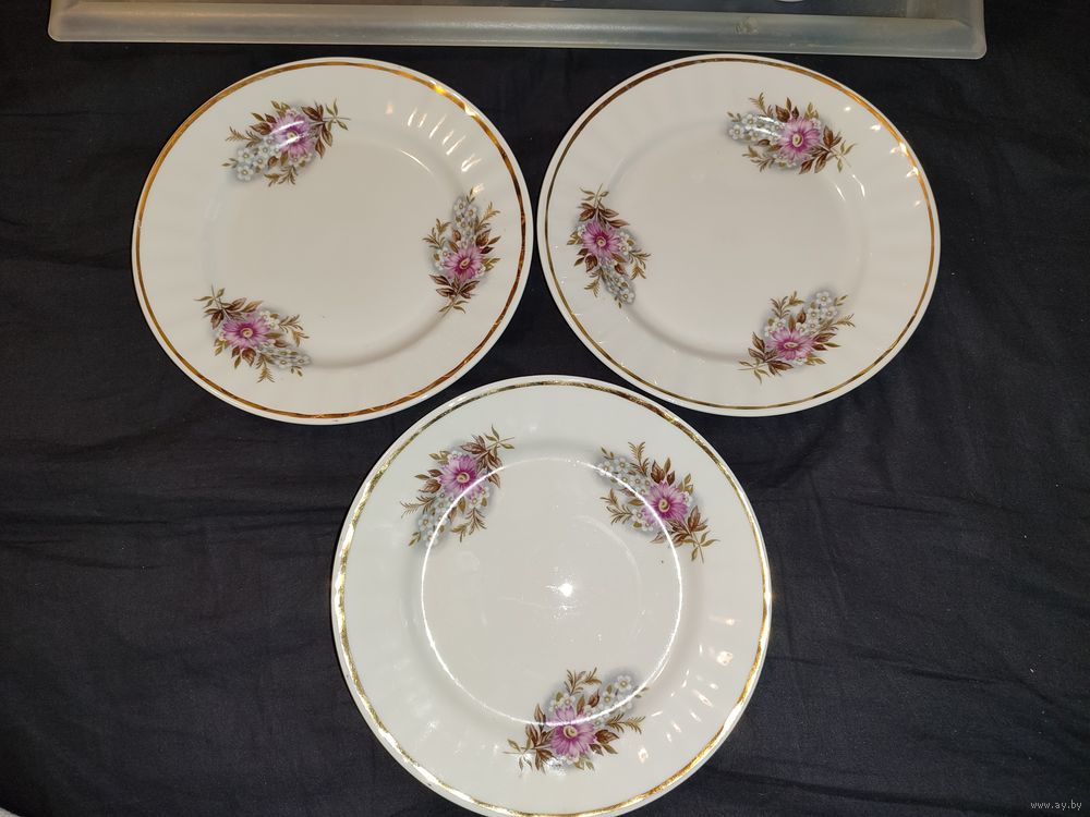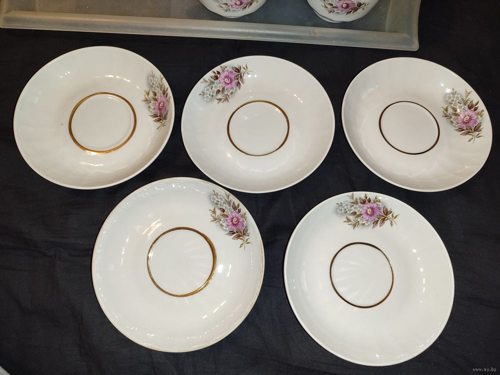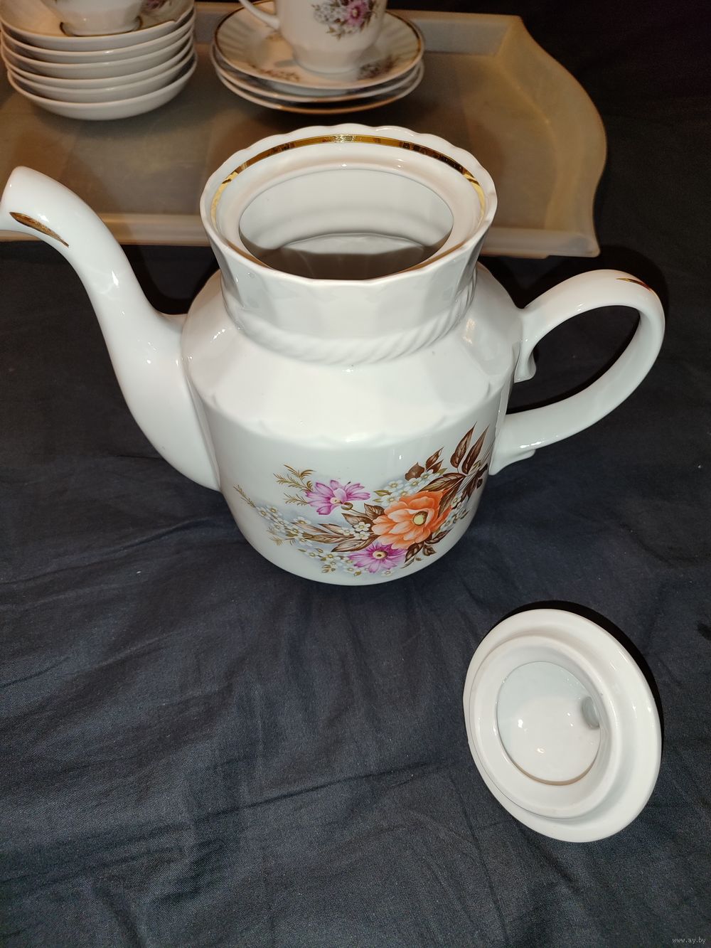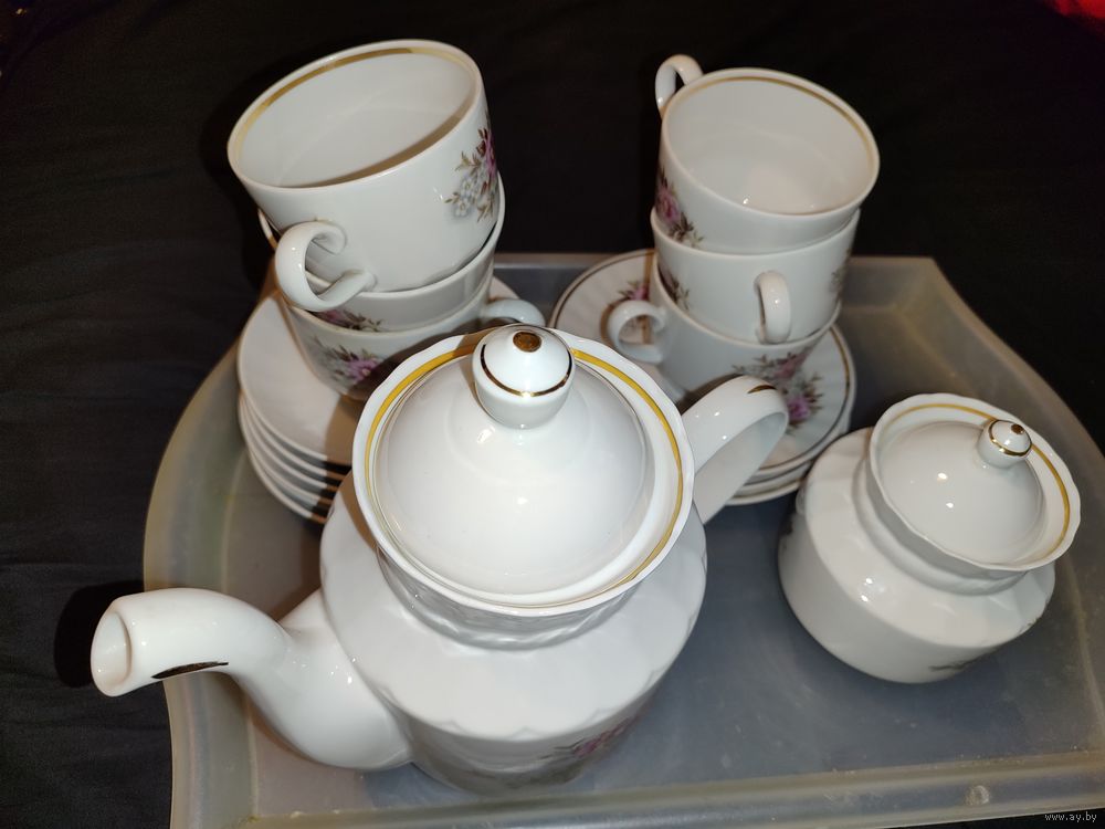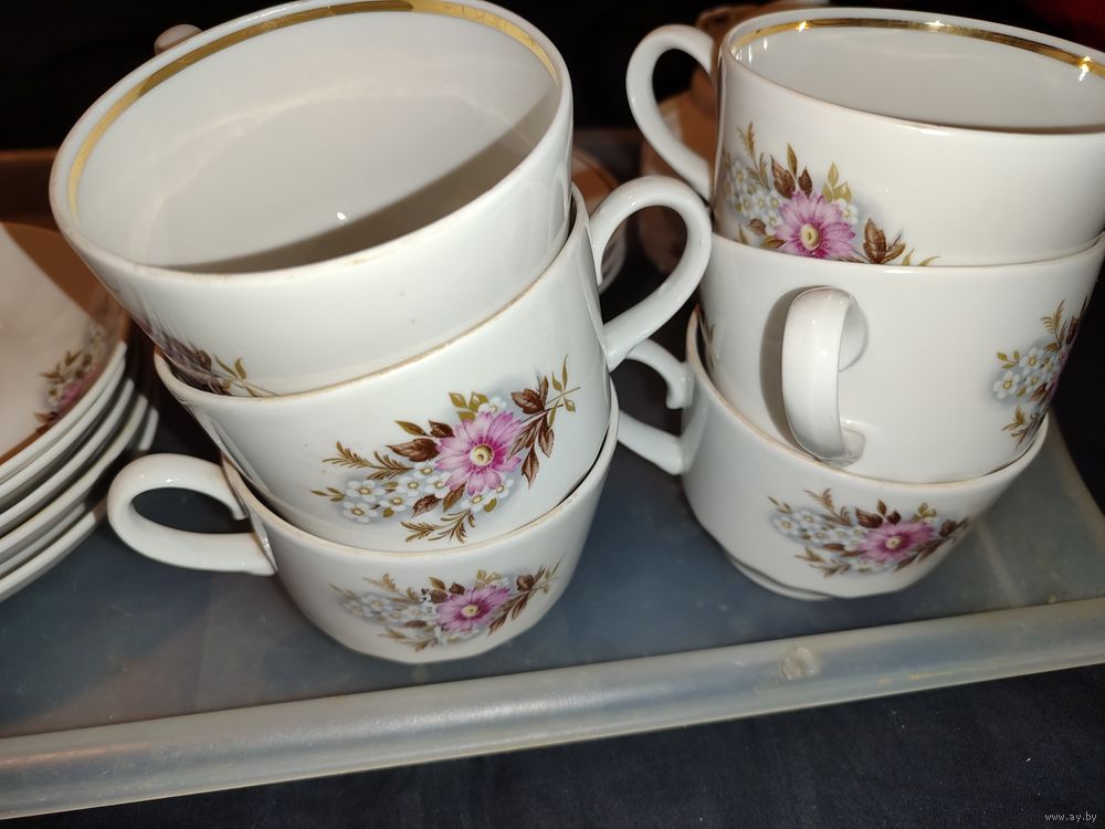 Сервиз чайный СССР на 6 персон, 6 чайных пар, чайник, сахарница, 3 тарелки.