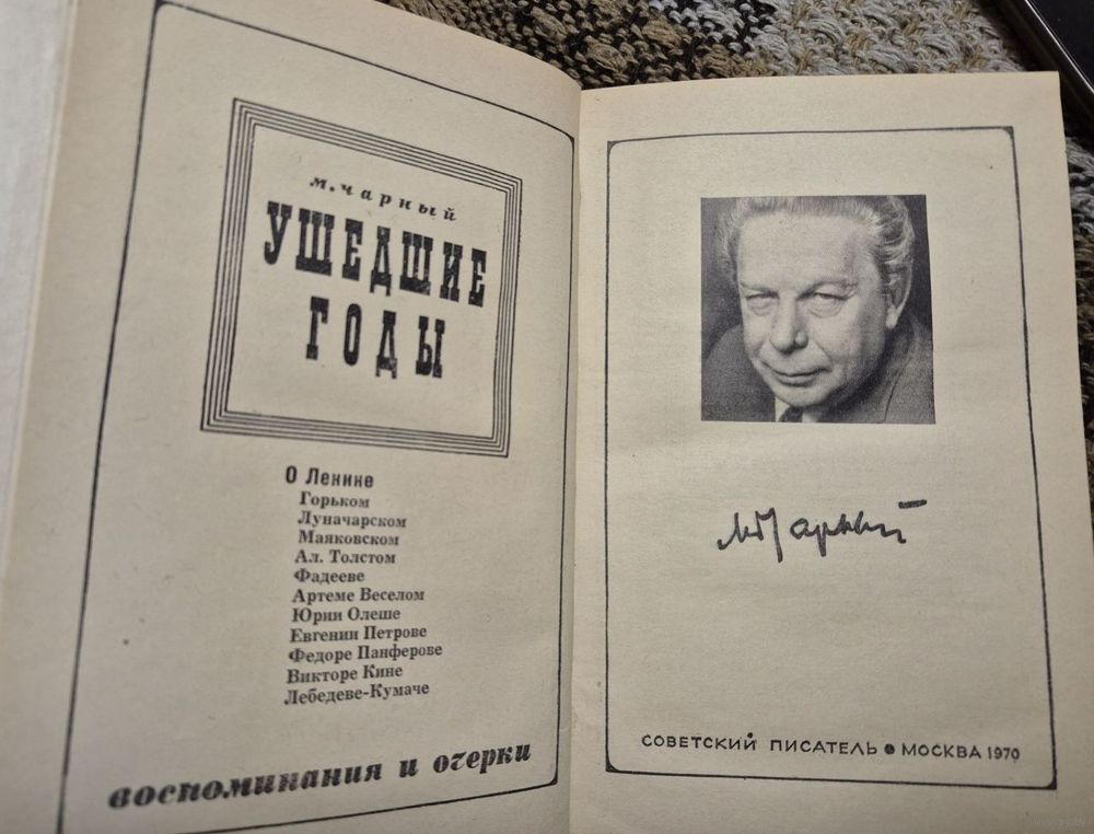 Чарный Марк. Ушедшие годы: Воспоминания и очерки, Ленин, Горький, Луначарский, Маяковский, Ал. Толстой, Фадеев, Артем Веселый, Юрий Олеша, Евгений Петров, Федор Панферов, Виктор Кин, Лебедев-Кумач. Москва Советский писатель, 1970г. 415стр