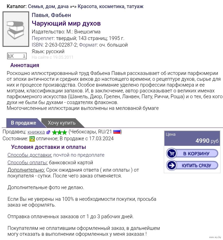 Роскошно иллюстрированный труд Фабьена Павья рассказывает об истории парфюмерии от эпохи античности и средних веков до настоящего времени; о рецептуре духов, сырье для них и процессе производства. Особое внимание уделено профессии парфюмера и ее мэтрам, классификации запахов. И, в заключение, автор рассказывает о великих именах парфюмерного искусства (Шанель, Диор, Герлен, Ланвен, Пату, Риччи, Роша) и о тех, без кого духи не были бы духами - создателях флаконов.
