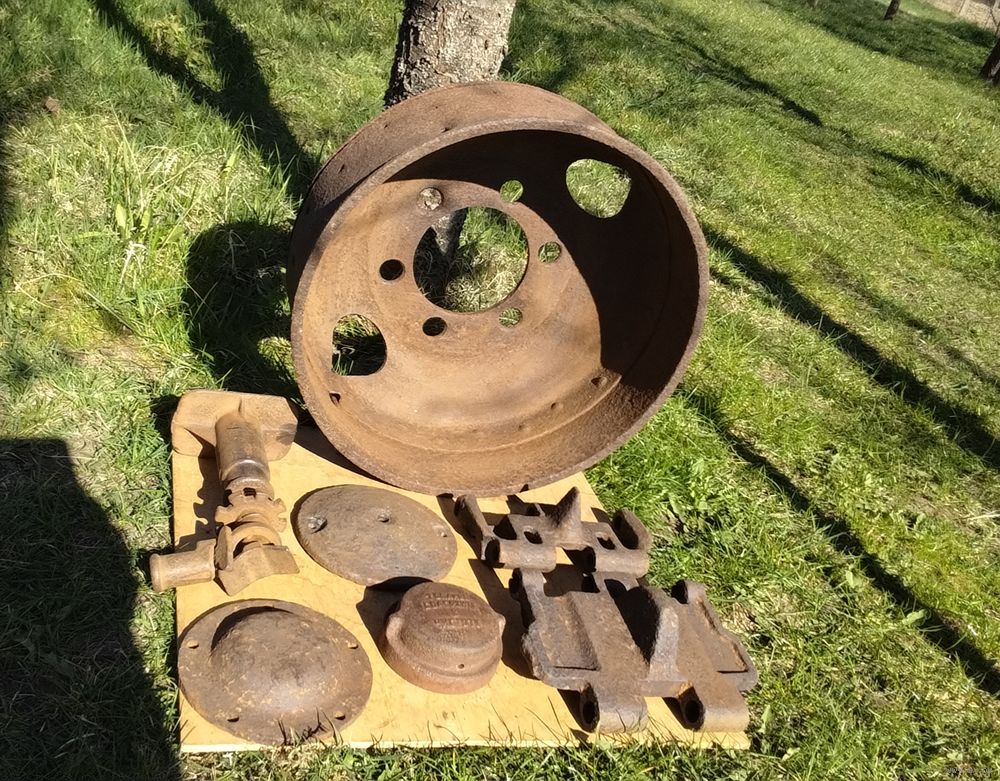 Колесный диск ЗиС 5 (первые выпуски-клепаный), траки КД-35,Т-26,ступичные крышки катков БТ-7м,КВ-1,крышка топливного бака Т-34-76. Винтовой домкрат.