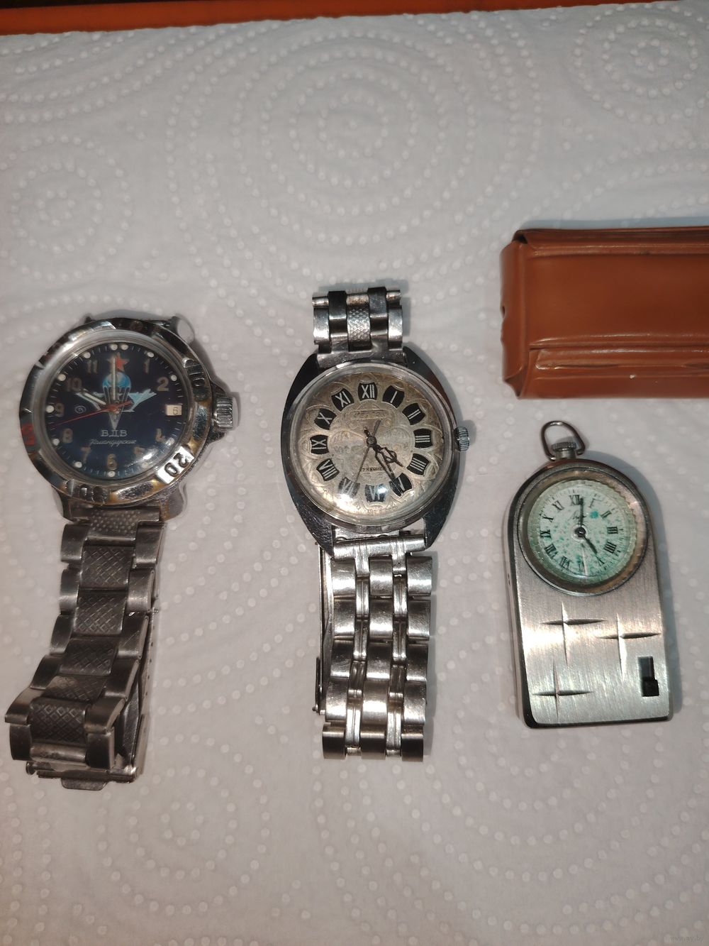 Часы СССР. Командирские,профилактика,Новое бронь стекло.На уверенном ходу!!!! Вторые наручные,идут не идут,наверное цепляется стрелка.Нужно смотреть. Третие карманные с будильником,не на ходу.Не накручивается завод. Луч (ПЕРЕЦ) с красной секундной стрелкой.На ходу.Нужна батарейка.Стекло чуть пашарпаное. Браслеты,2 из них новые.