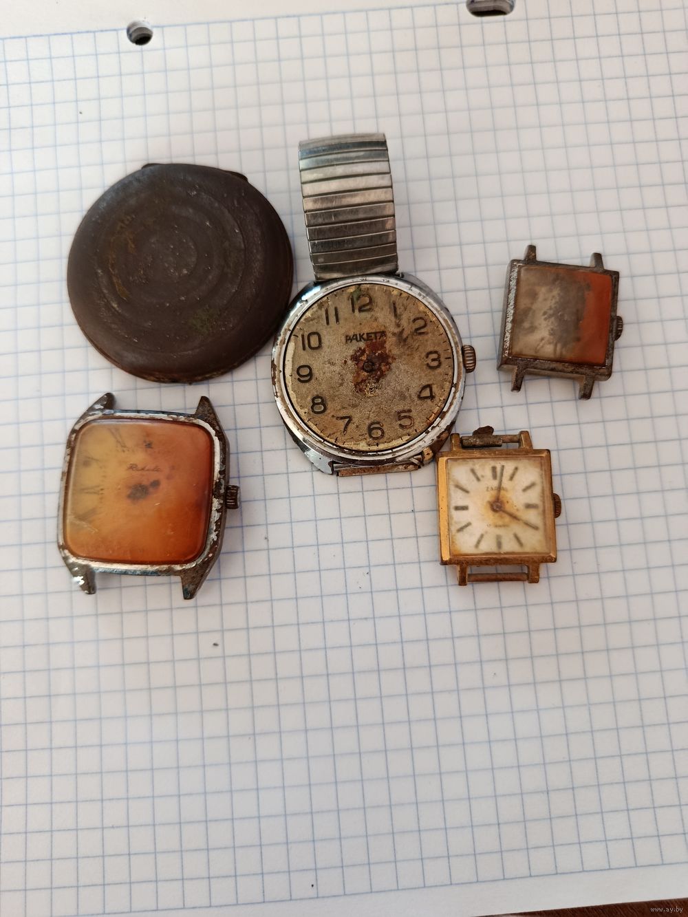 Советские часы (все не исправные) и латунный корпус от старых карманных часов.
