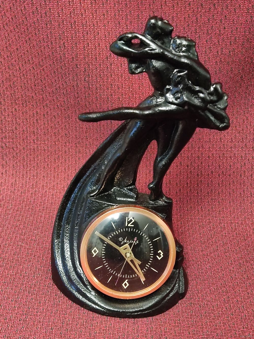 Часы Балет. Касли (Куса?). 1960-е г.г. Чугун. Клеймо. Высота 21,5 см. Основание 11 х 9 см. Вес 2,0 кг. Часы на уверенном ходу. Реставрирована ось заводной ручки. Все работает. Состояние на фото.