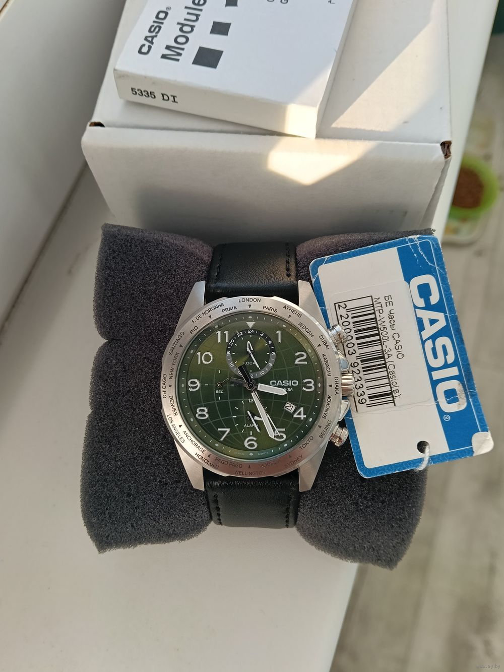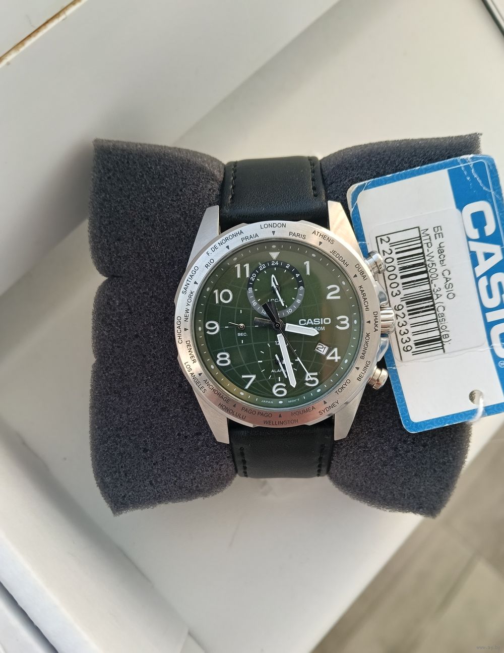Кварцевые часы. Водостойкость WR 50. Центральные часовая, минутная и секундная стрелки. Мировое время - 24 часовых зоны (24 города). Будильник. Индикатор низкого заряда батареи. Зеленый циферблат с часовыми индексами в виде штрихов и цифр. Стрелки и метки с люминесцентным покрытием. Корпус выполнен из нержавеющей стали. Размеры корпуса 44 мм х 50 мм, толщина 12 мм. Устойчивое к возникновению мелких механических повреждений минеральное стекло.