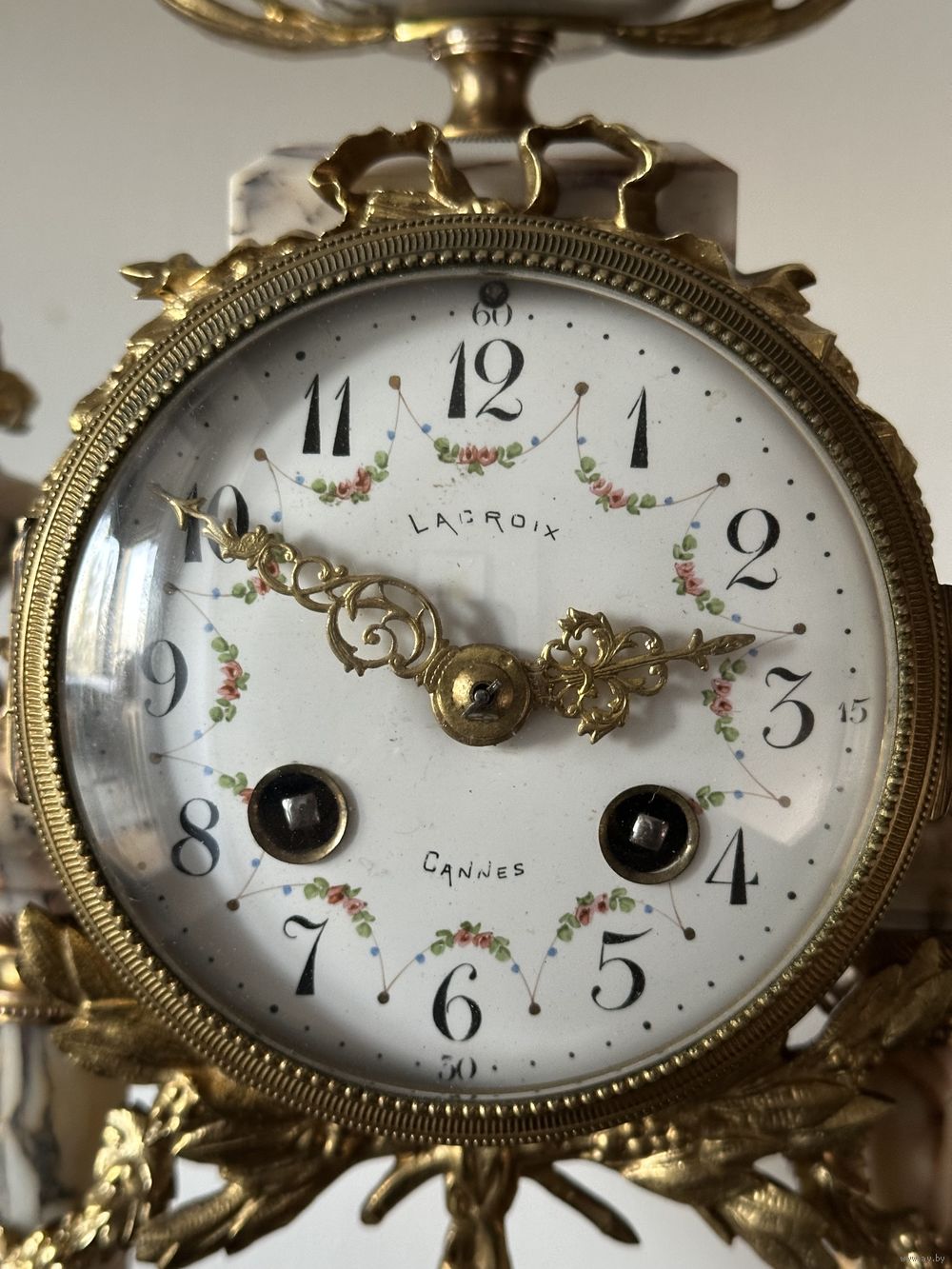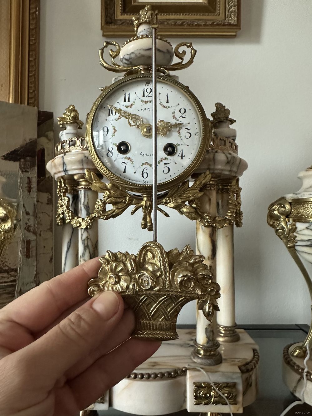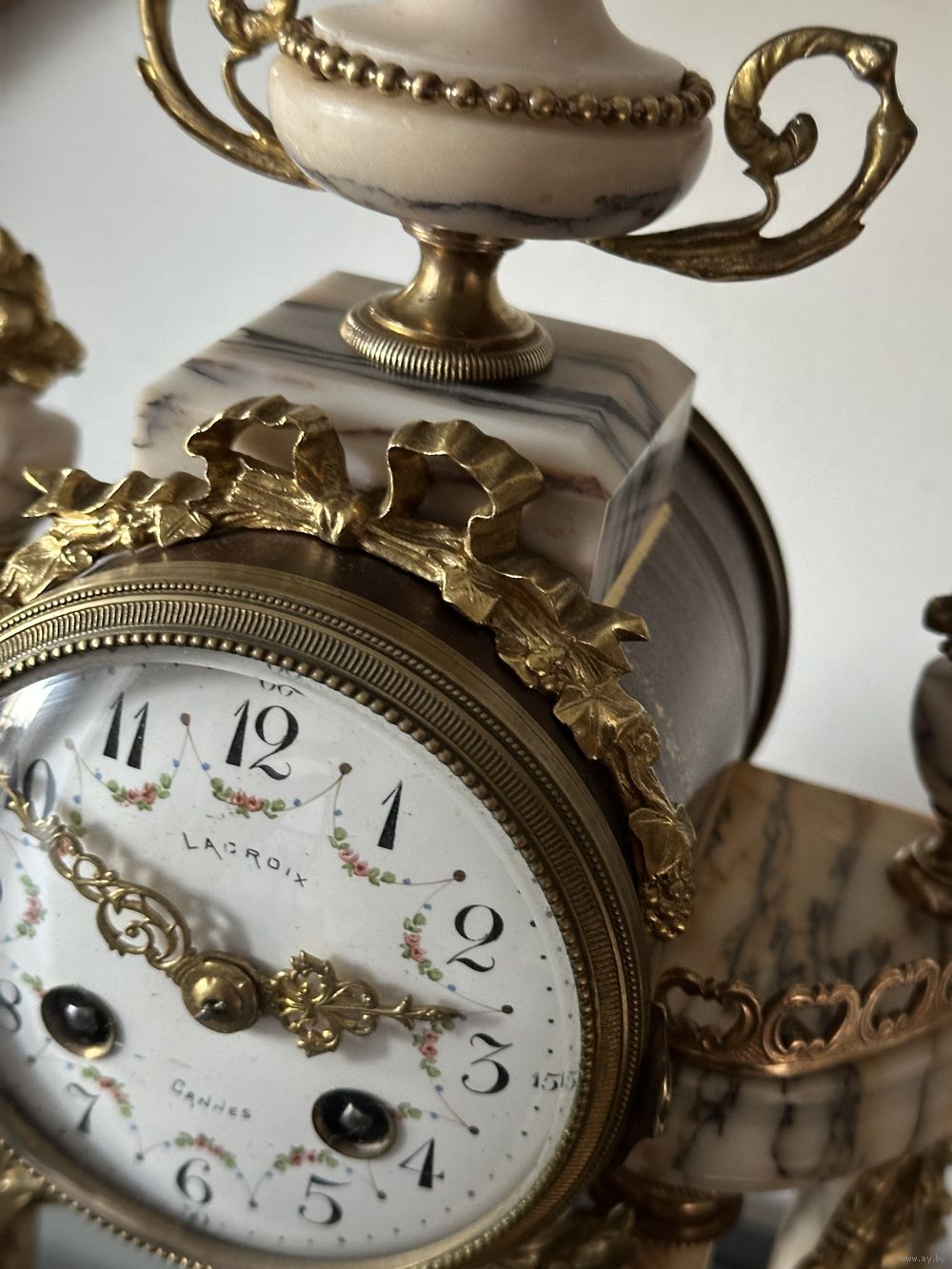 Старинные каминные часы, каминный гарнитур с двумя декоративными вазонами. Lacroix, Cannes.