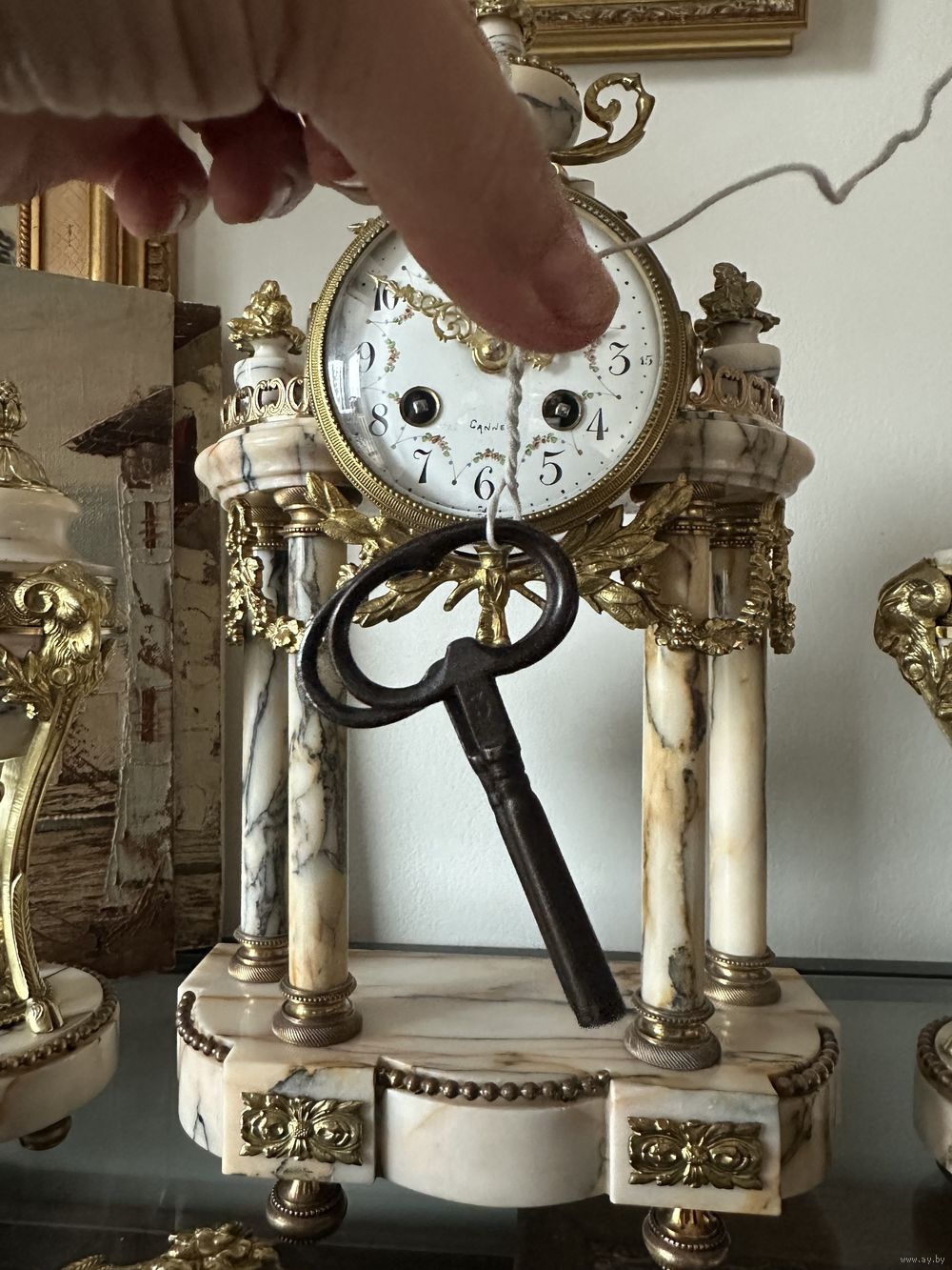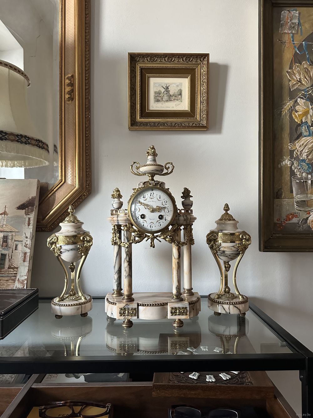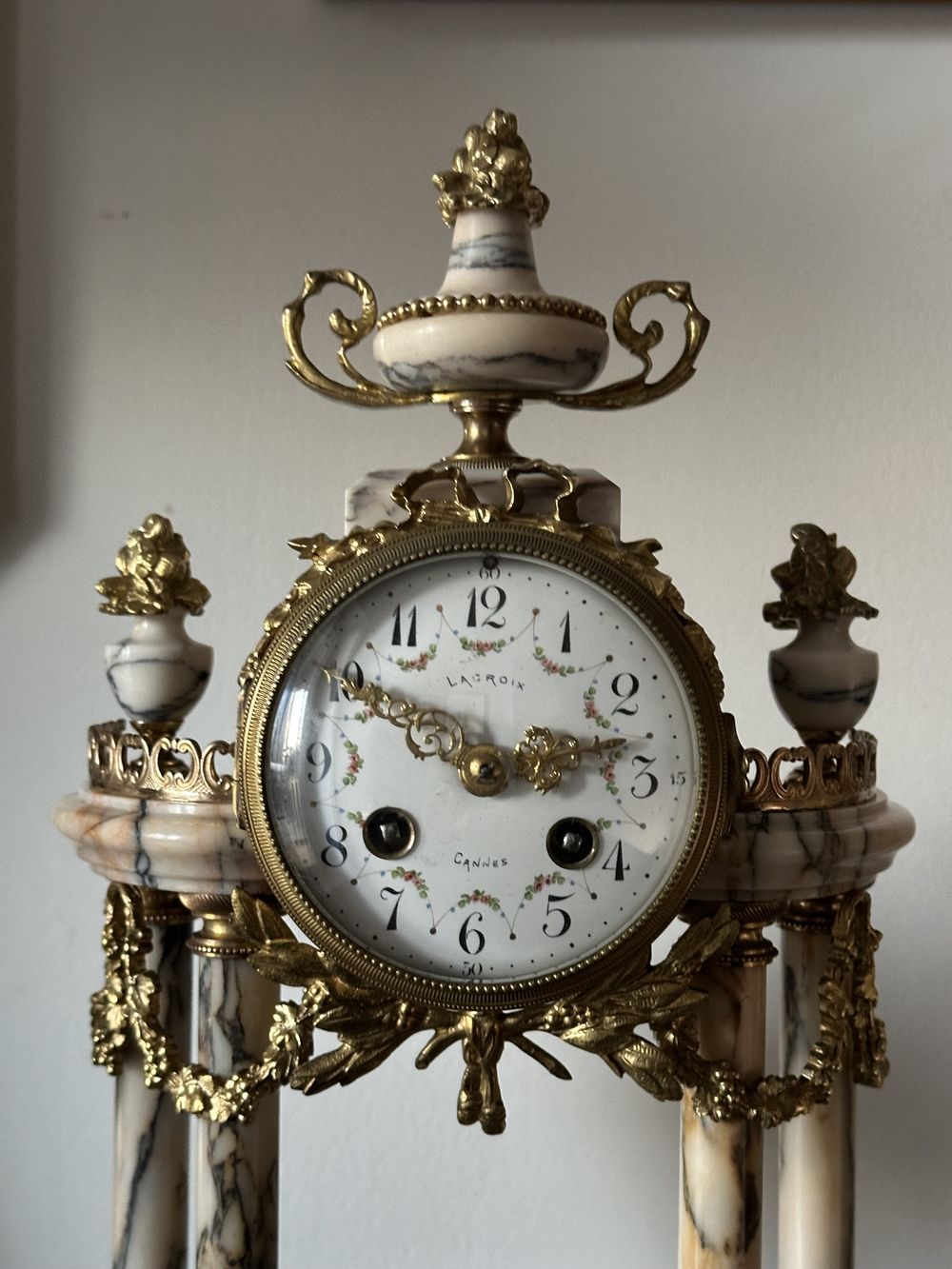 Старинные каминные часы, каминный гарнитур с двумя декоративными вазонами. Lacroix, Cannes.