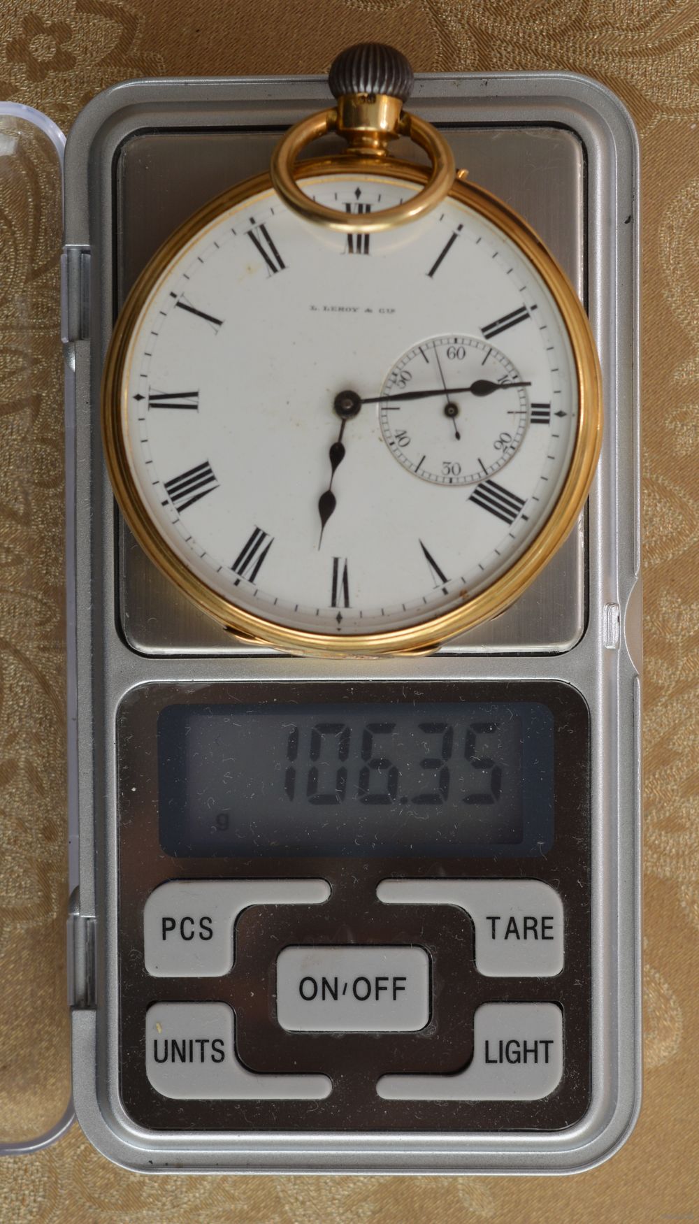 Антикварные карманные часы "L.Leroy & GIE" в золотом (18К) корпусе. Диаметр корпуса - 53 мм. Проба 18К соответствует 750 в метрической системе. Конец ХIX - начало ХХ века. На ходу. Не чистились. Общий вес - 106,35 гр.