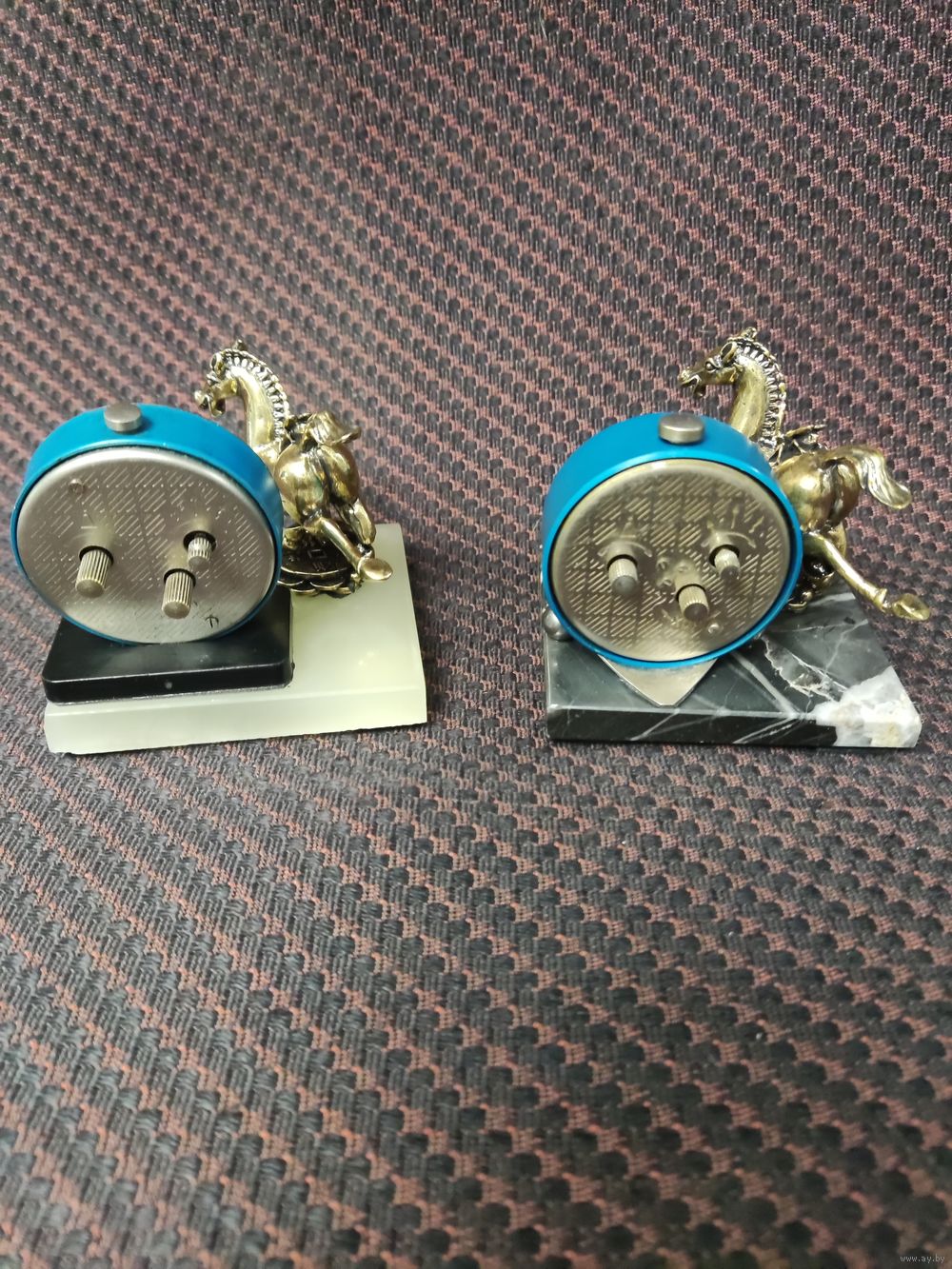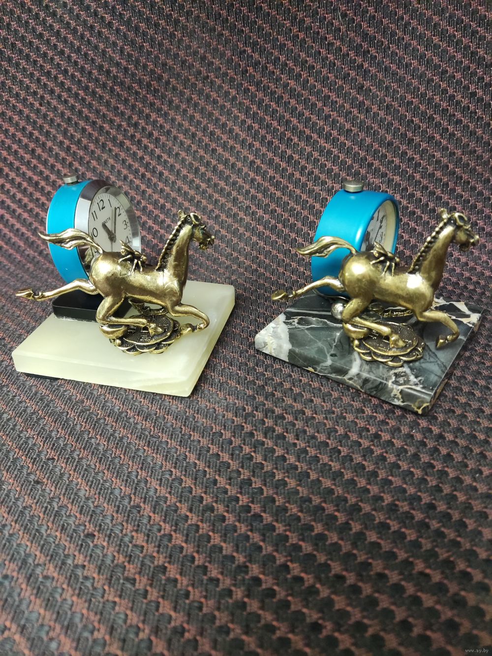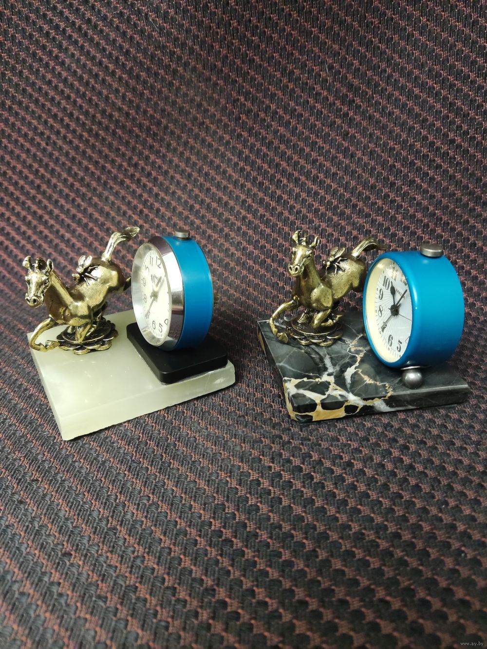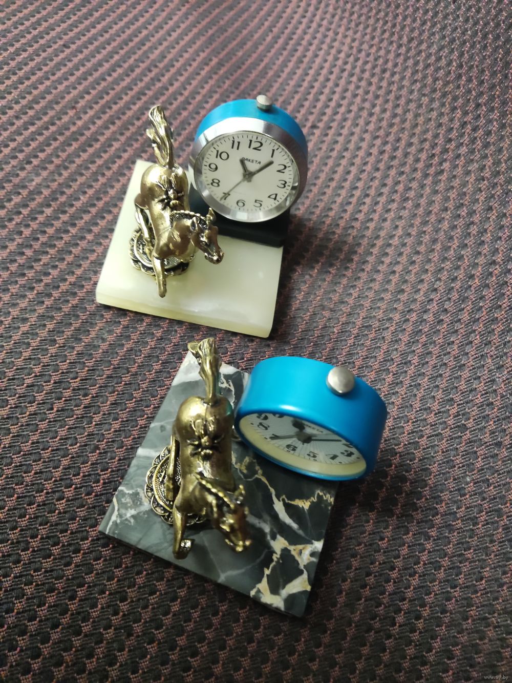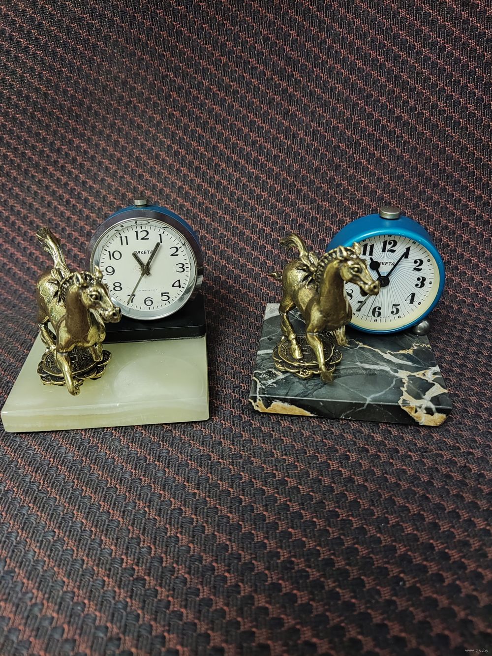 Часы миниатюрные, Лошадки. Будильник Ракета механические СССР. Полностью рабочие, обслужены. Инсталляция: Лошадки, в наличии 2 шт., бронза. Н=5,5 см. Основание – камень оникс (Италия) 7 х 7 х 1 см. Подкладки из замши. Превосходный подарок к наступающему году Лошади!