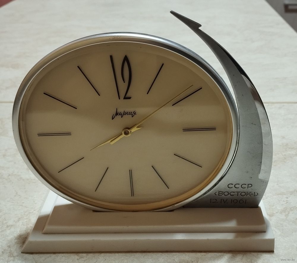 Винтажные советские настольные механические часы «Молния», выпущенные в честь первого полета человека в космос. Посвящены полету Юрия Гагарина на корабле «Восток-1», который состоялся 12 апреля 1961 года.