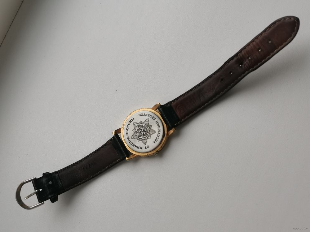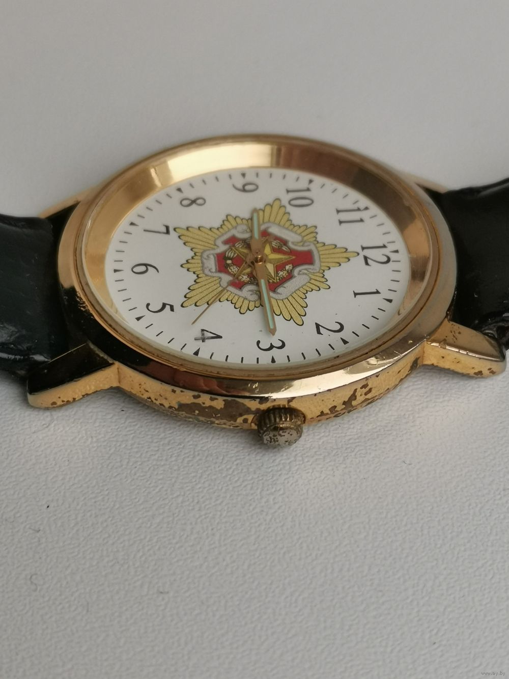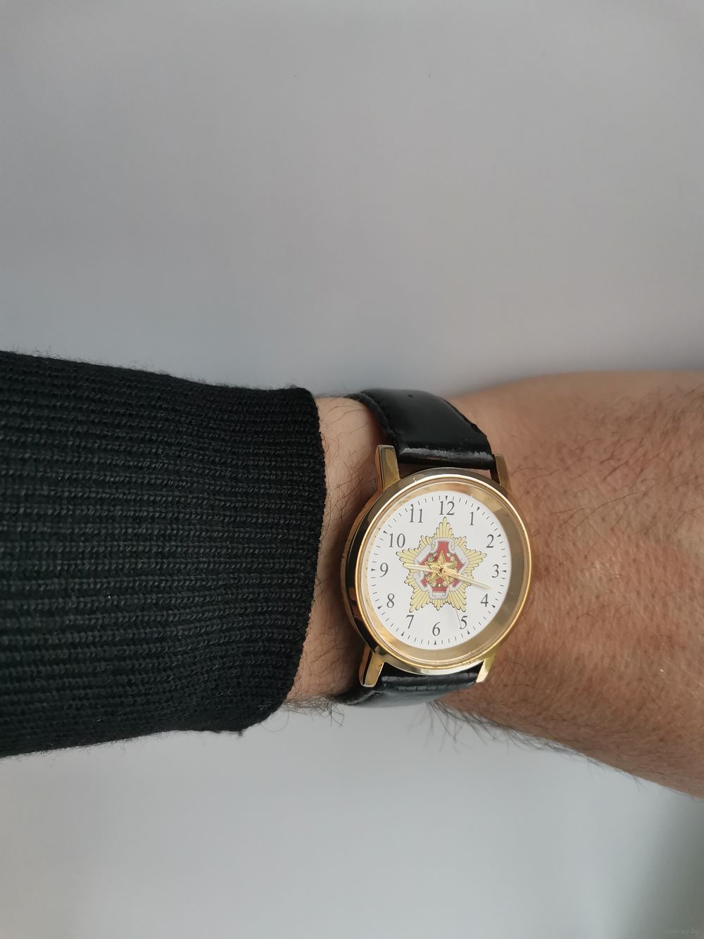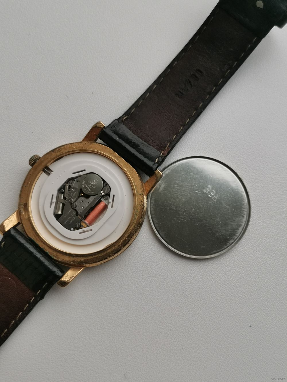 См. Фотографии. Часы рабочие, в продаже со вставленной батарейкой и добротным кожаным ремнем. Возможно, позолоченные, но местами отшелушения... | |