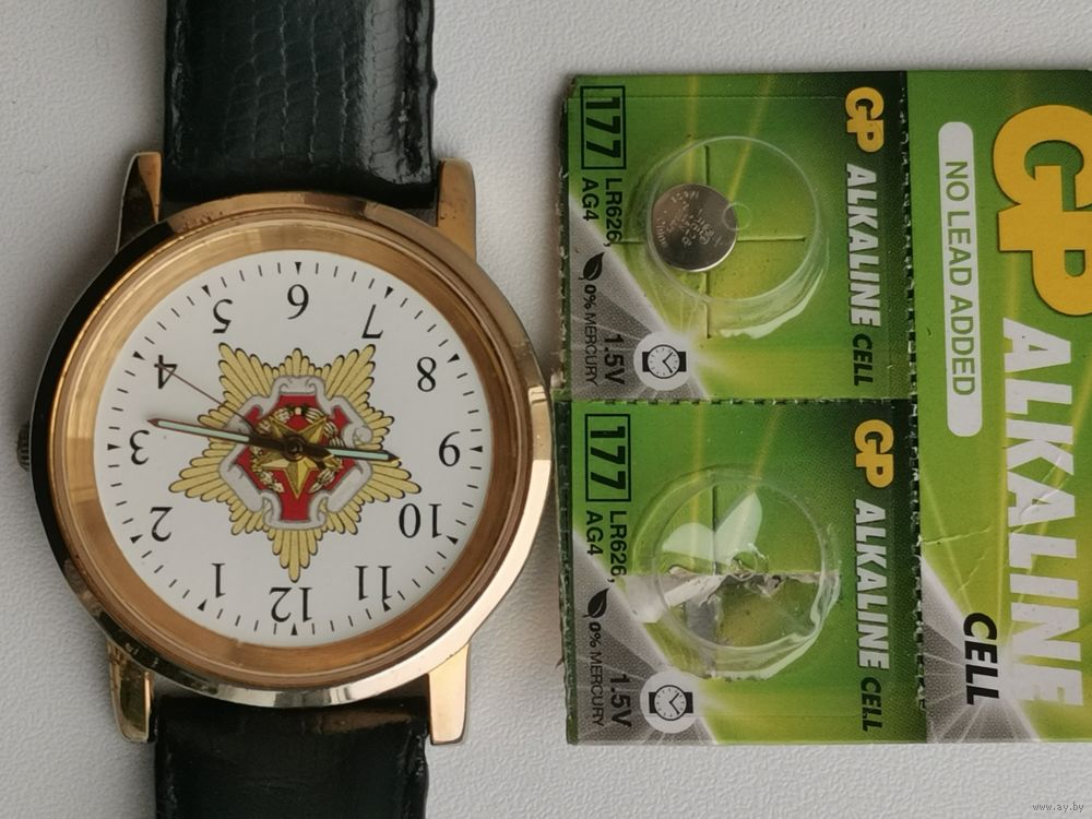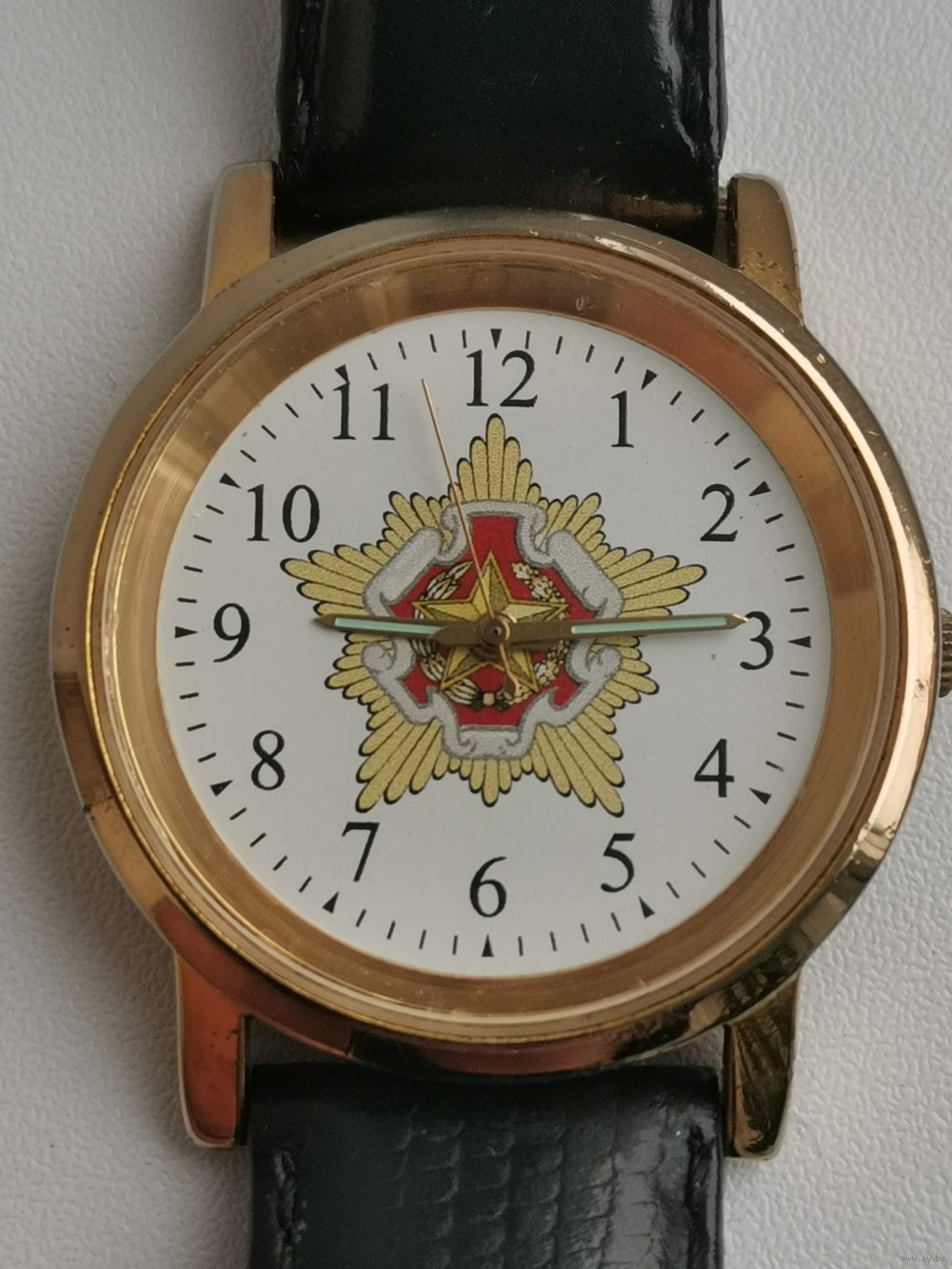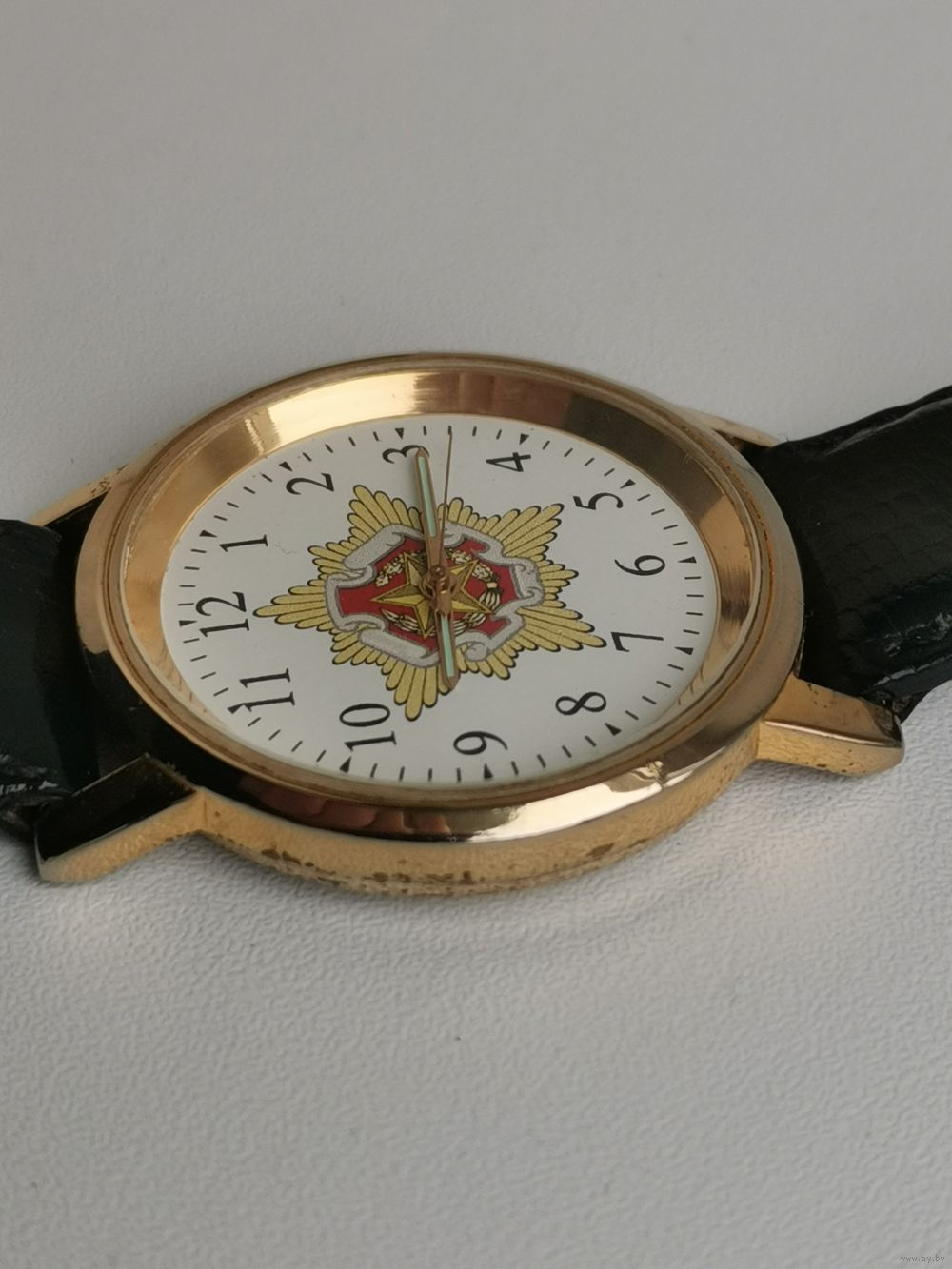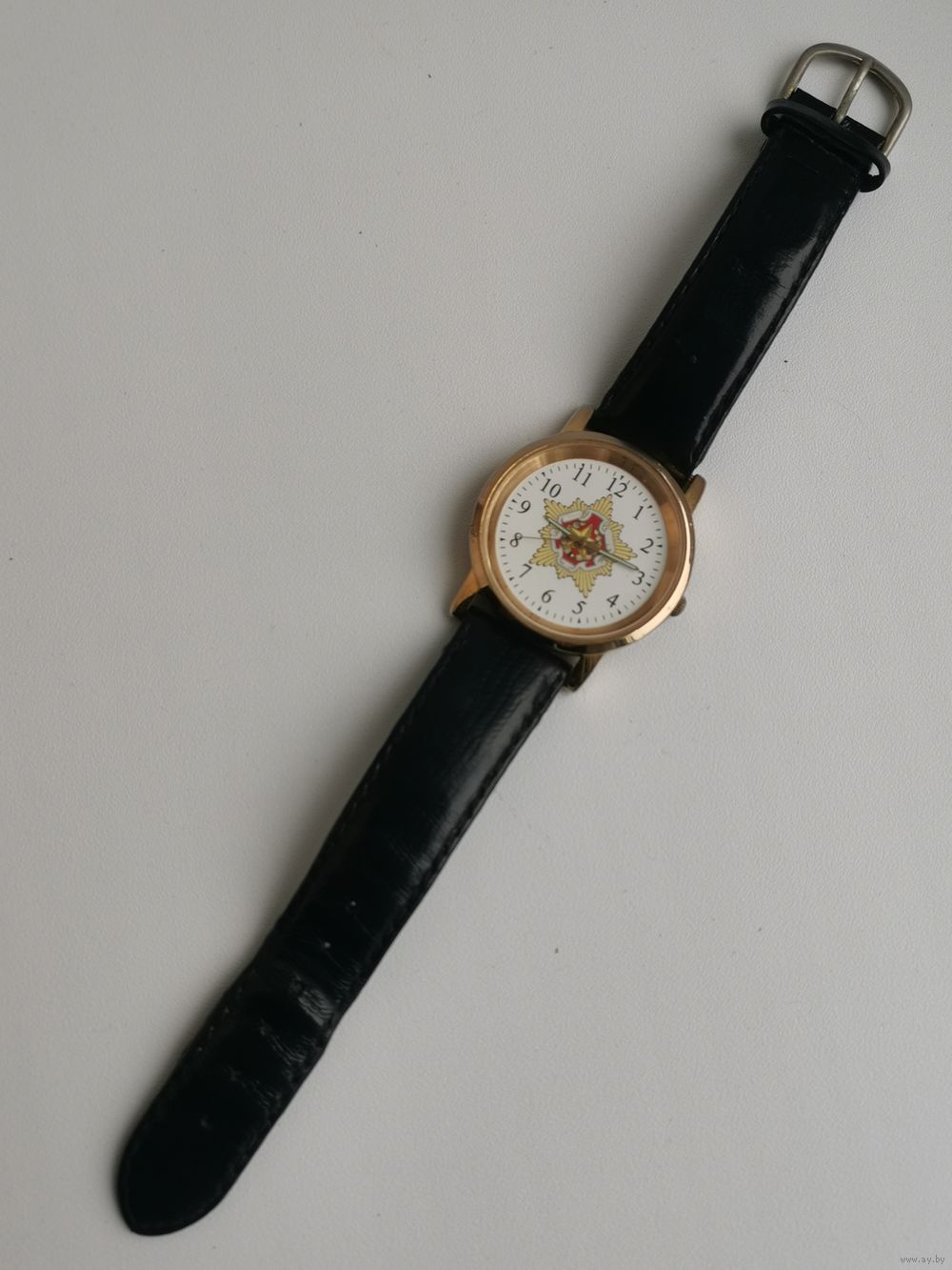 См. Фотографии. Часы рабочие, в продаже со вставленной батарейкой и добротным кожаным ремнем. Возможно, позолоченные, но местами отшелушения... | |