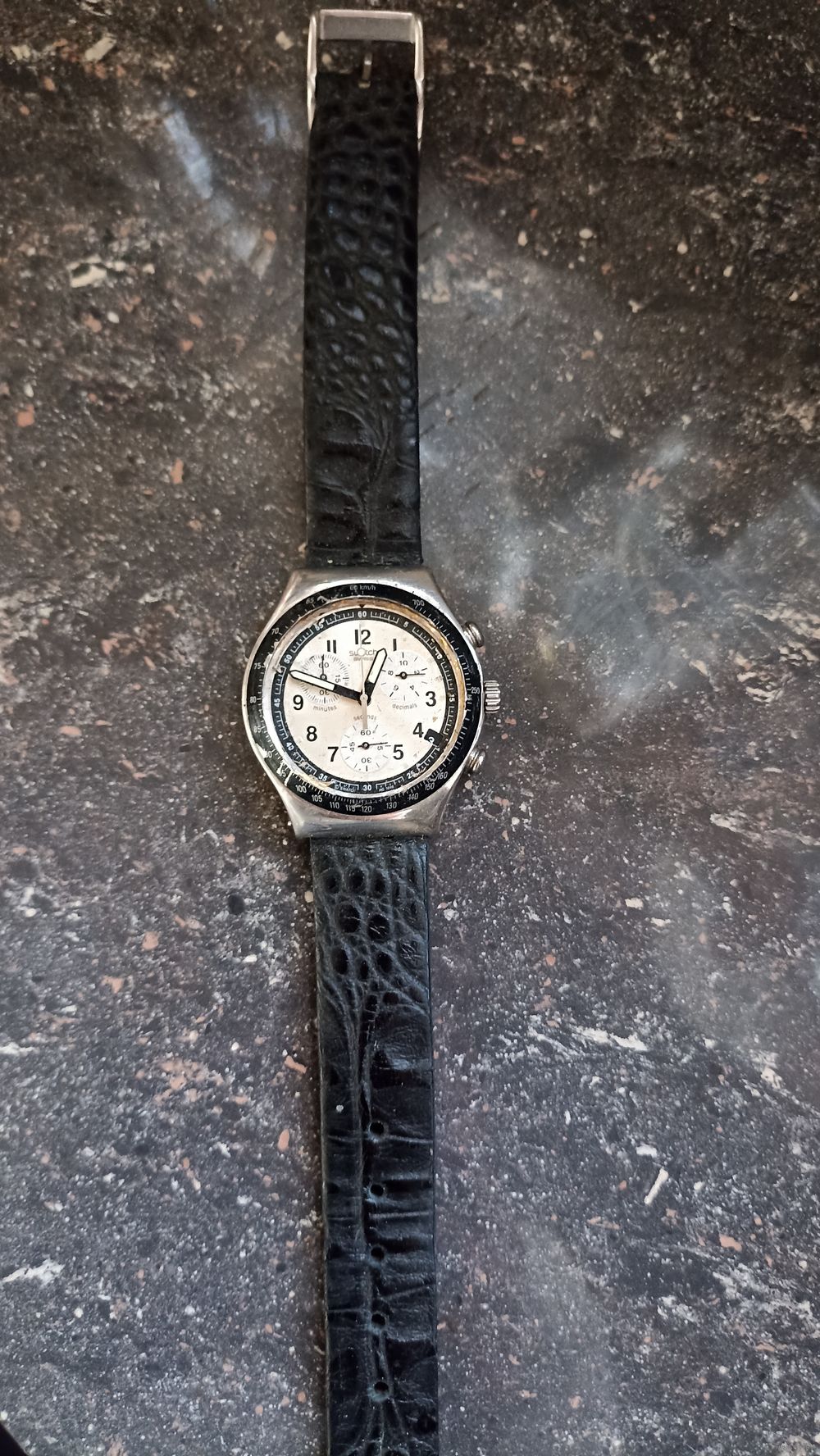 Часы на ходу, хронограф работает. Отсутствует стекло. Ремешок с фирменной клипсой, оригинал