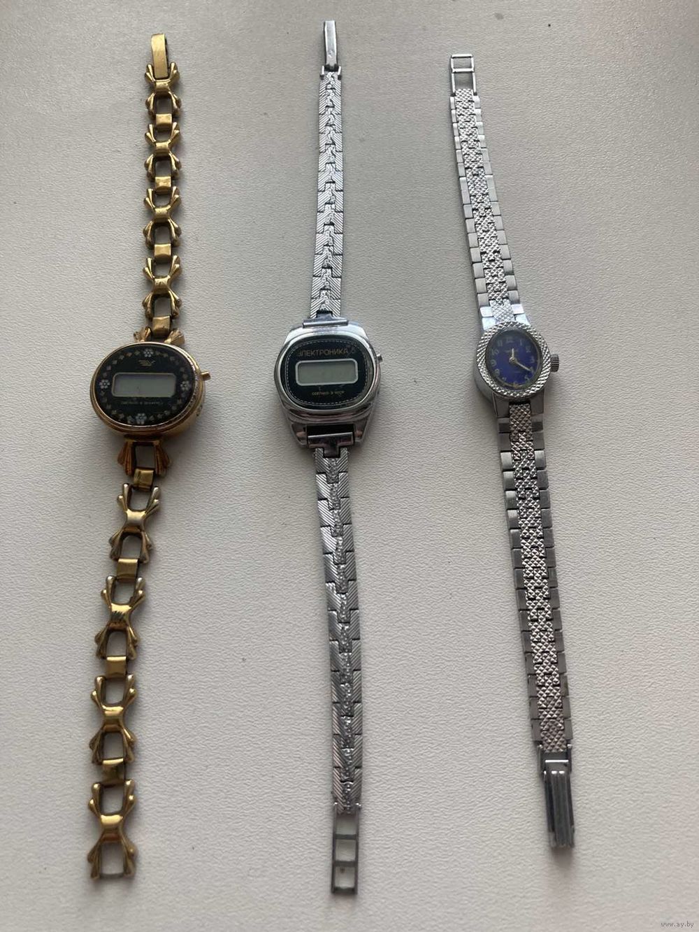 Часы наручные, СССР. "Чайка" механические, двое часов "Электроника" (на одних из которых, клеймо "Знак качества"). Часы нерабочие. В ремонте не были, возможна незначительная неисправность. Внешний вид отличный. Все трое часов с оригинальными, родными металлическими браслетами. Цена 20 руб./шт. Отправлю любой почтой.