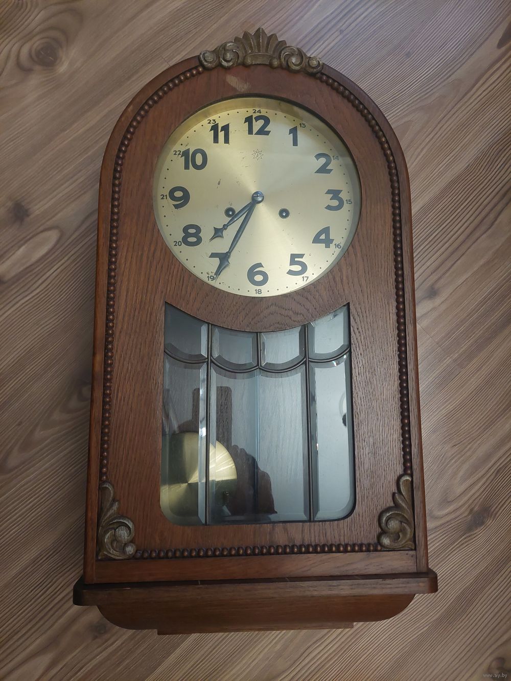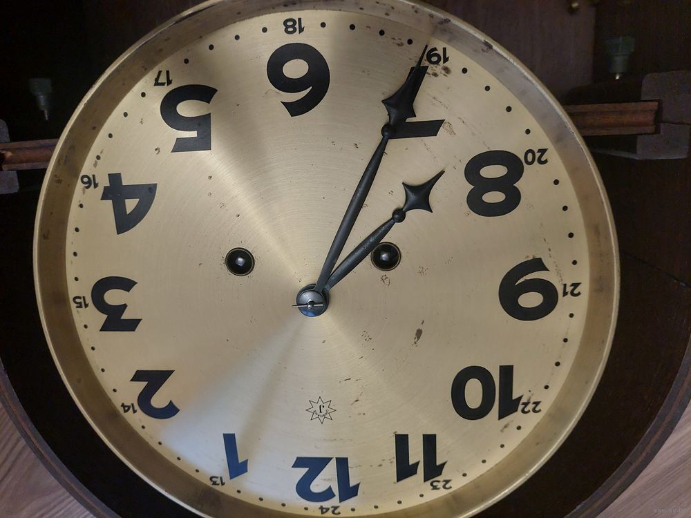 Родной сбор. Коробка без проблем. Стекло с фацетом. Ход есть.(как долго и как точно не знаю).циферблат- 220 мм. Размеры 660-320-155