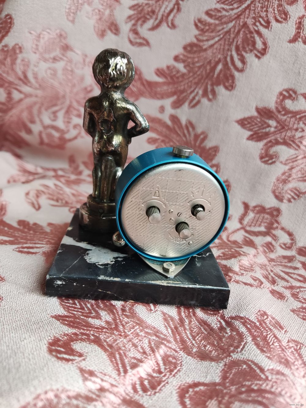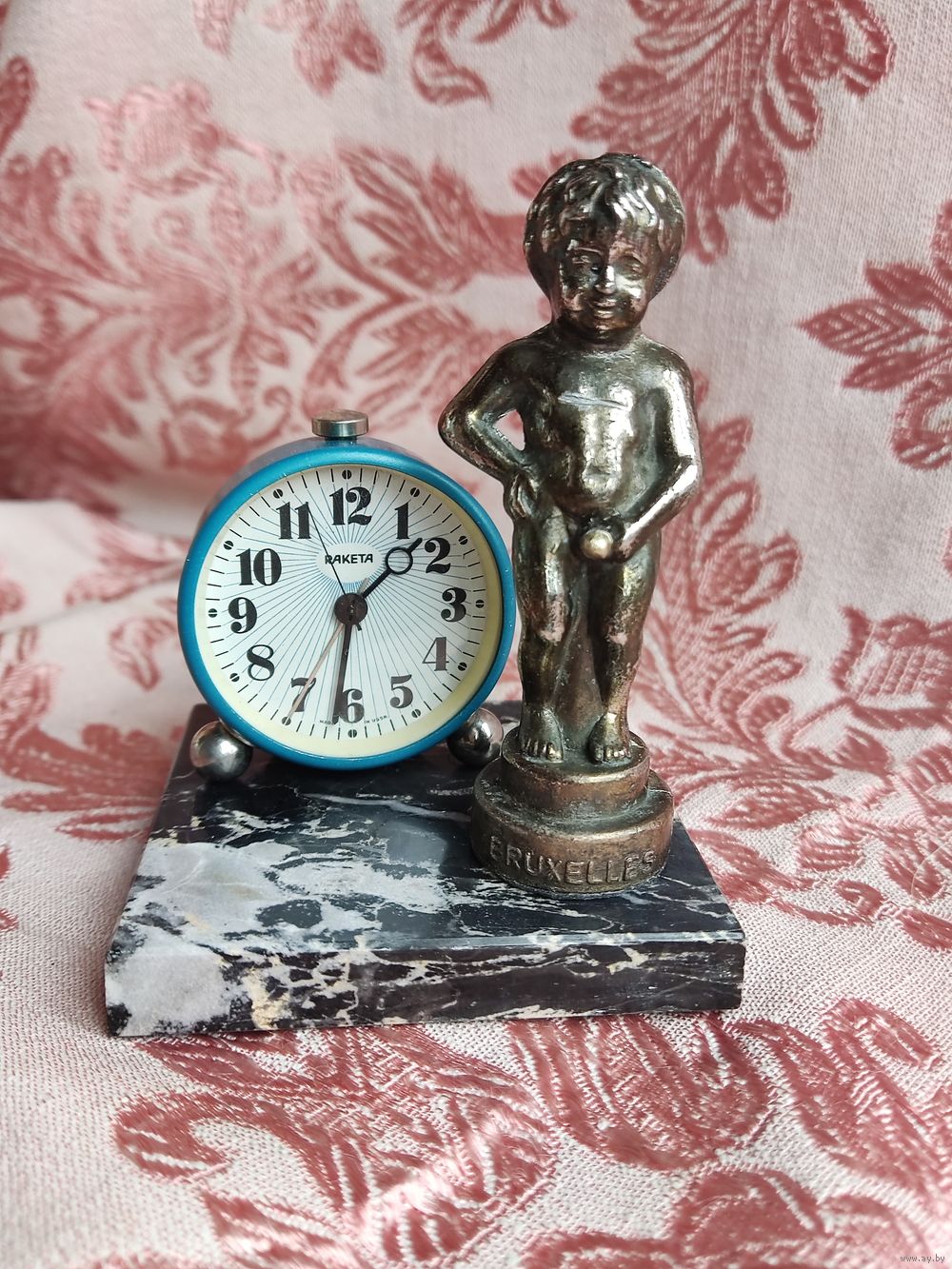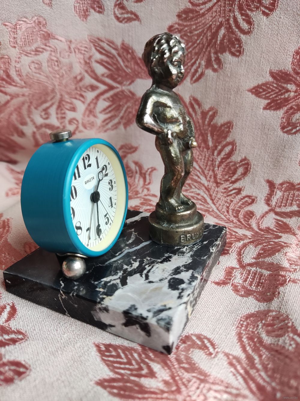 Часы настольные (кабинетные), будильник, механические. Рабочие. Инсталляция: Писючий мальчик "BRUXELEЕS" (Бельгия), бронза, Н=9 см с будильником мех. "Ракета", диам. 4,6 см. Основание – камень оникс (Италия) 7,5 х 7,5 х 1 см. Подкладки из замши. Превосходный подарок!!!