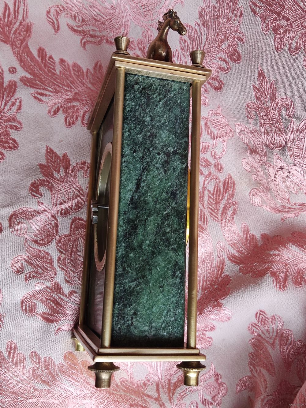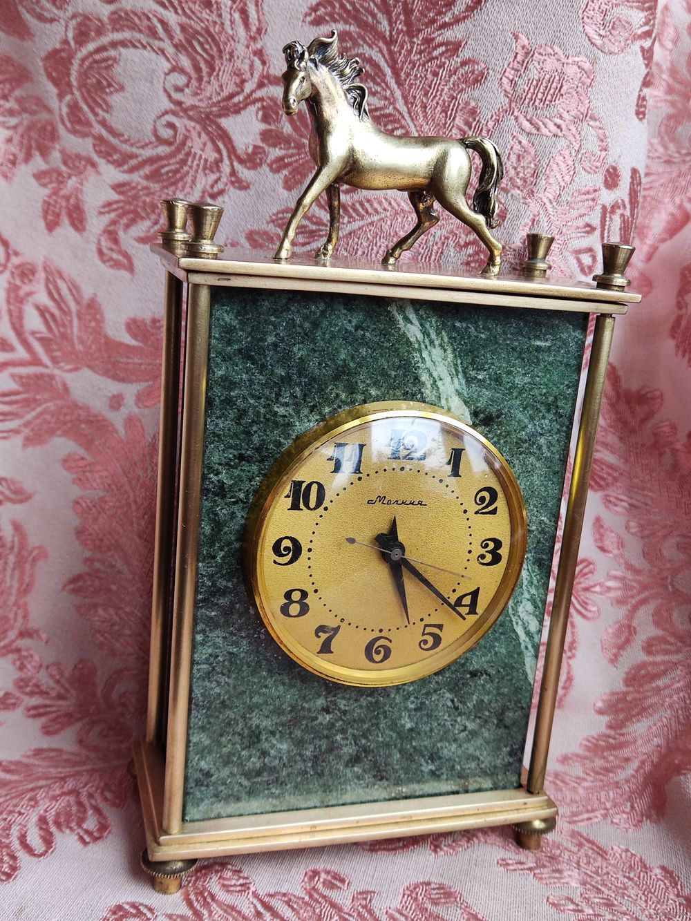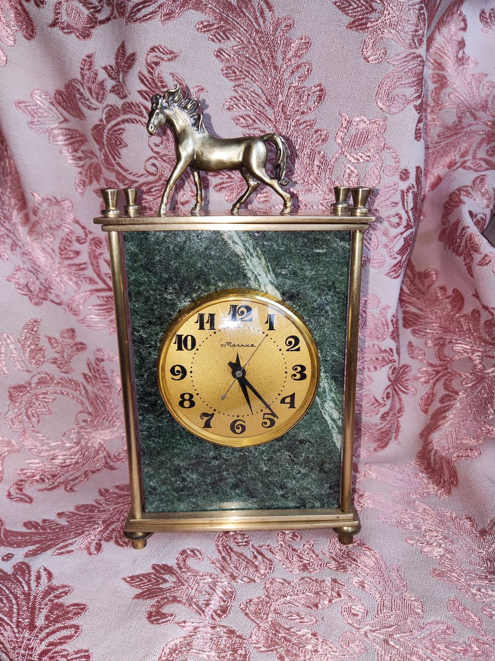 Часы настольные (кабинетные, каминные) механические Молния на камне змеевик. СССР 80-е гг. Рабочие. Бронза/латунь. Высота 22,5 см. Основание 11,5 х 5,5 см. Почищены. Навершие бронзовая статуэтка лошадка. Отличное состояние, уверенный ход, обслужены мастером. Превосходный подарок! Торг!
