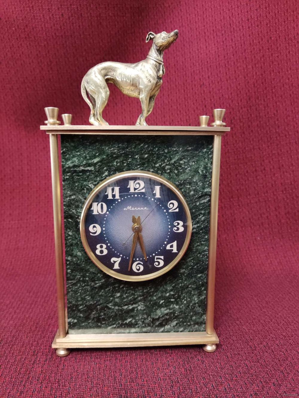 Часы настольные (кабинетные, каминные) механические Молния на камне змеевик. СССР 80-е гг. Рабочие. Бронза/латунь. Высота 22,5 см. Основание 11,5 х 5,5 см. Почищены. Навершие бронзовая статуэтка собачка левретка. Отличное состояние, уверенный ход, обслужены мастером. Превосходный подарок! Торг!