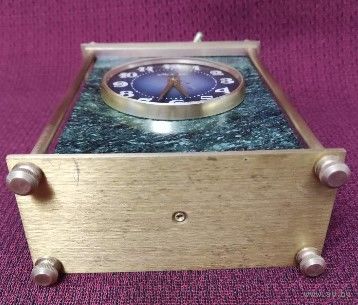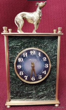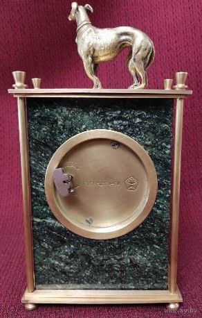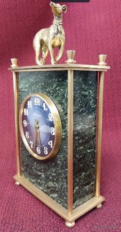 Часы настольные (кабинетные, каминные) механические Молния на камне змеевик. СССР 80-е гг. Рабочие. Бронза/латунь. Высота 22,5 см. Основание 11,5 х 5,5 см. Почищены. Навершие бронзовая статуэтка собачка левретка. Отличное состояние, уверенный ход, обслужены мастером. Превосходный подарок! Торг!