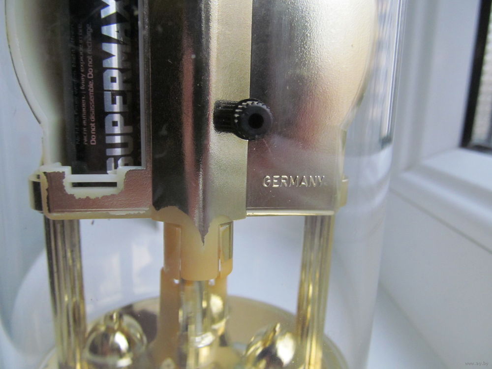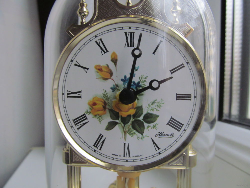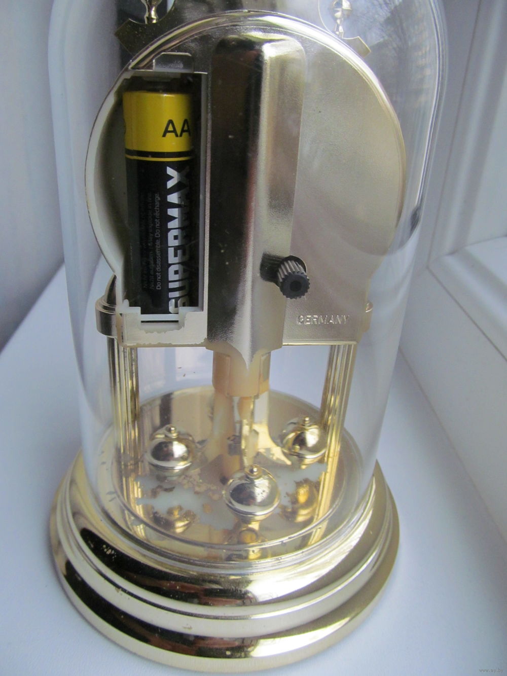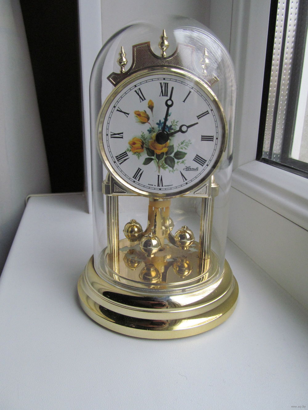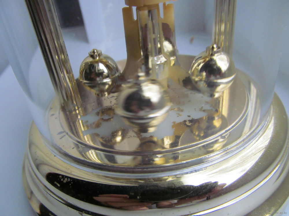 Часы настольные кварцевые Германия. Материал пластик. На ходу. Состояние по фото. Отсутствует крышка батарейного отсека, местами слезла краска. Нет нижнего центровочного кольца маятника.