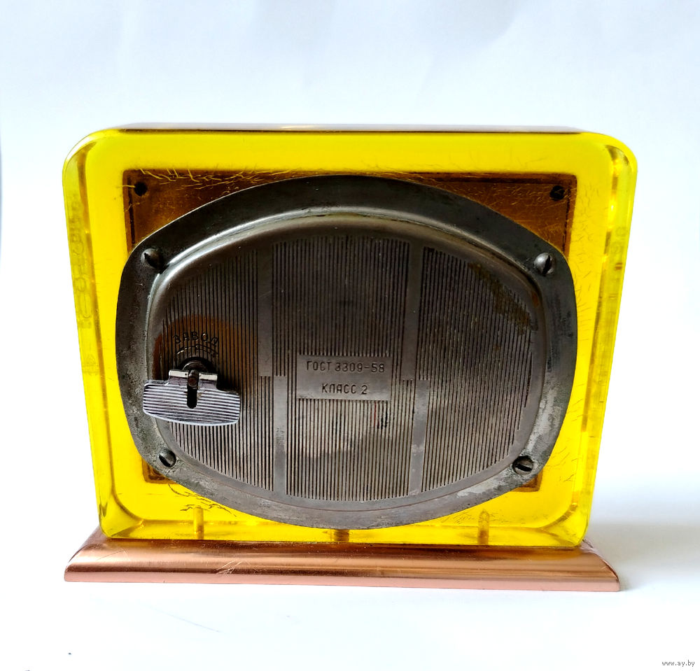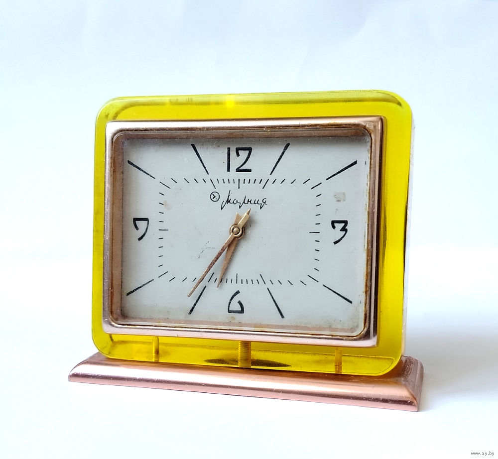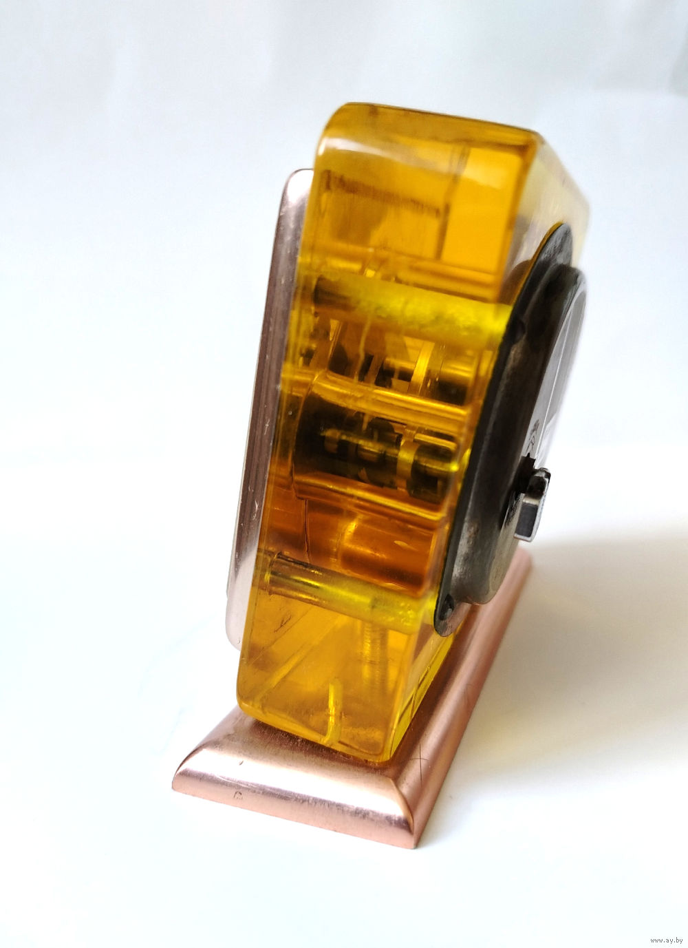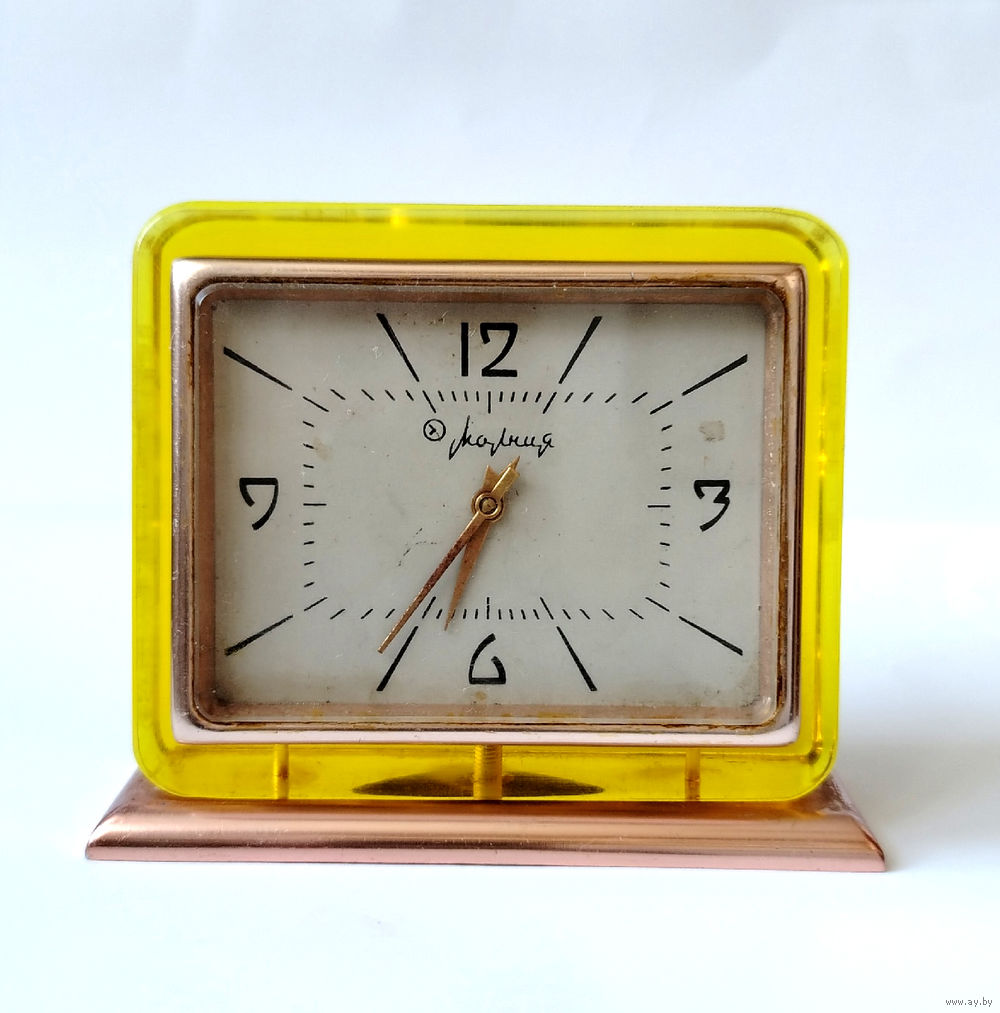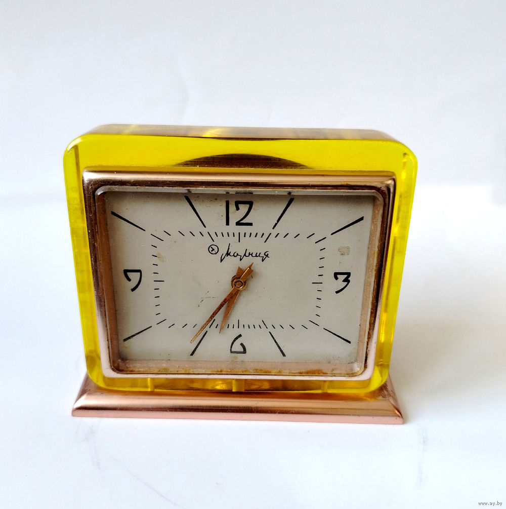 Интересные и редкие настольные часы «Молния», выпущенные на Челябинском часовом заводе «Молния». Прозрачный корпус, выполненный из янтарно-золотистого полимера, выглядит необычно и очень эффектно. При разном освещении он мягко переливается, создавая ощущение тепла и глубины, словно внутри заключён свет. Такое оформление встречается нечасто и именно поэтому эти часы особенно ценятся среди коллекционеров.