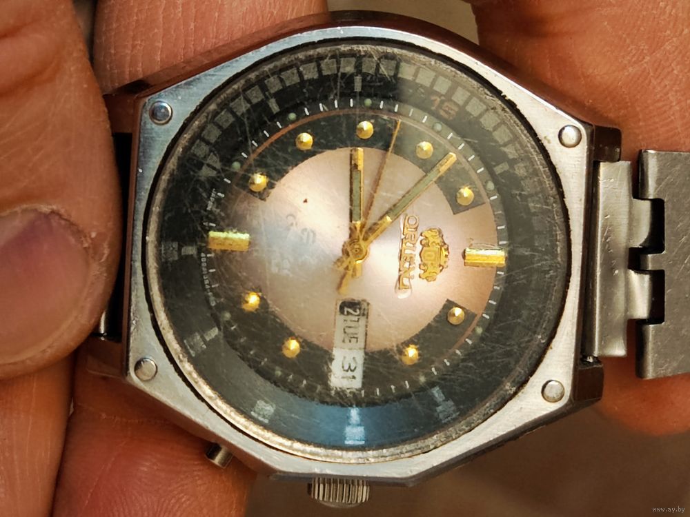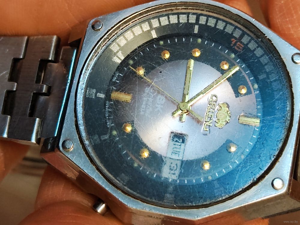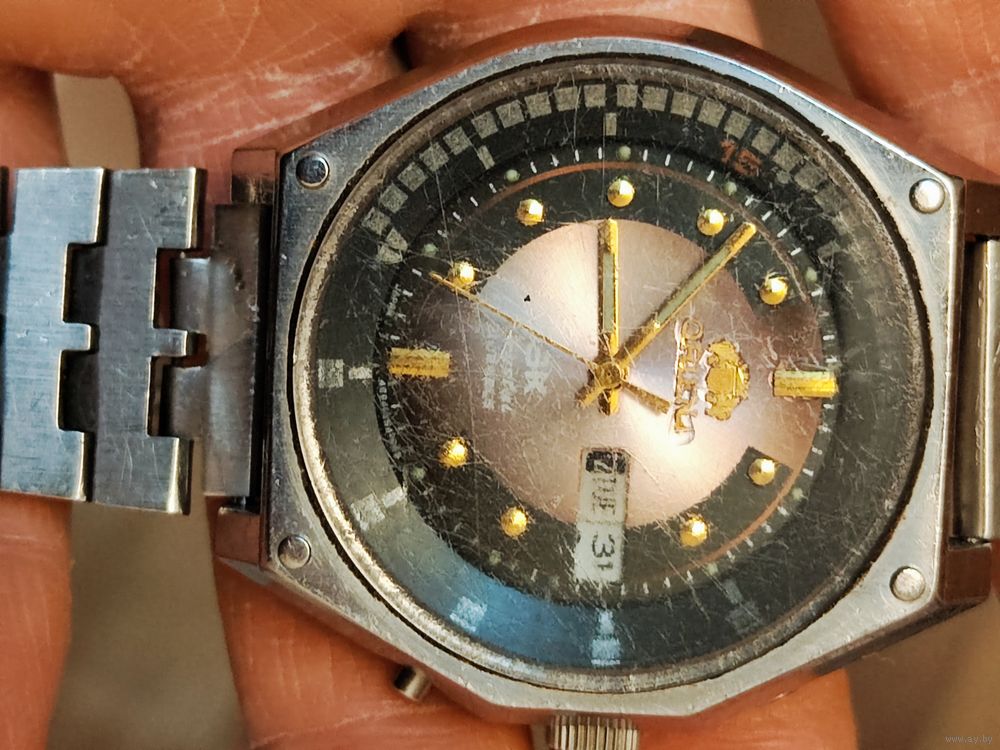 Сегодня начал разгонять пока идут, надпись orient с дефектом, стекло сильно пошарпано, одной заводной головки нет, календарь кнопкой не переводится, при вращении заводной головкой переводятся оба календаря. Браслет оригинальный но в районе ушек помят крайние звенья крепления браслета с часами имеют вмятины