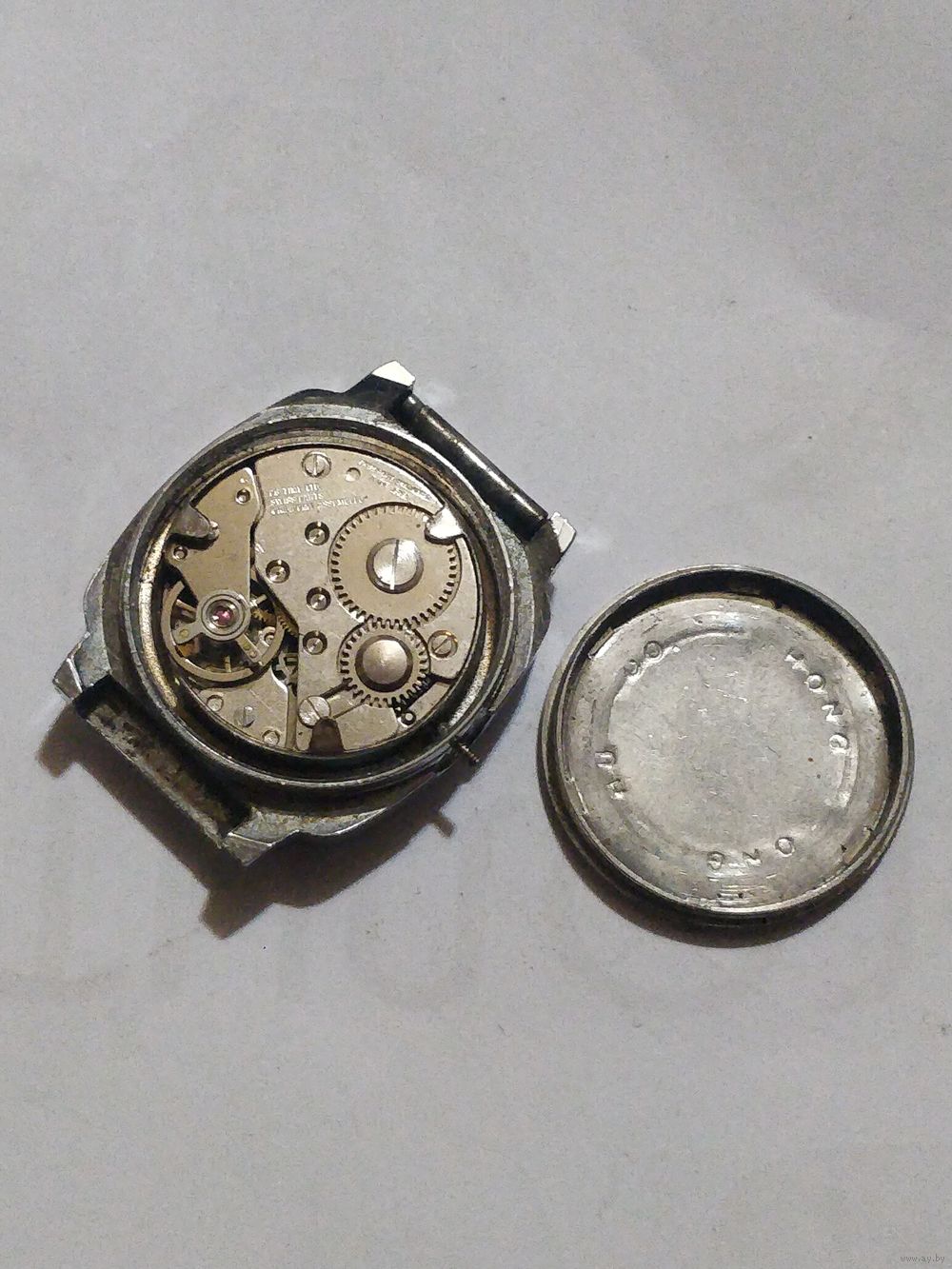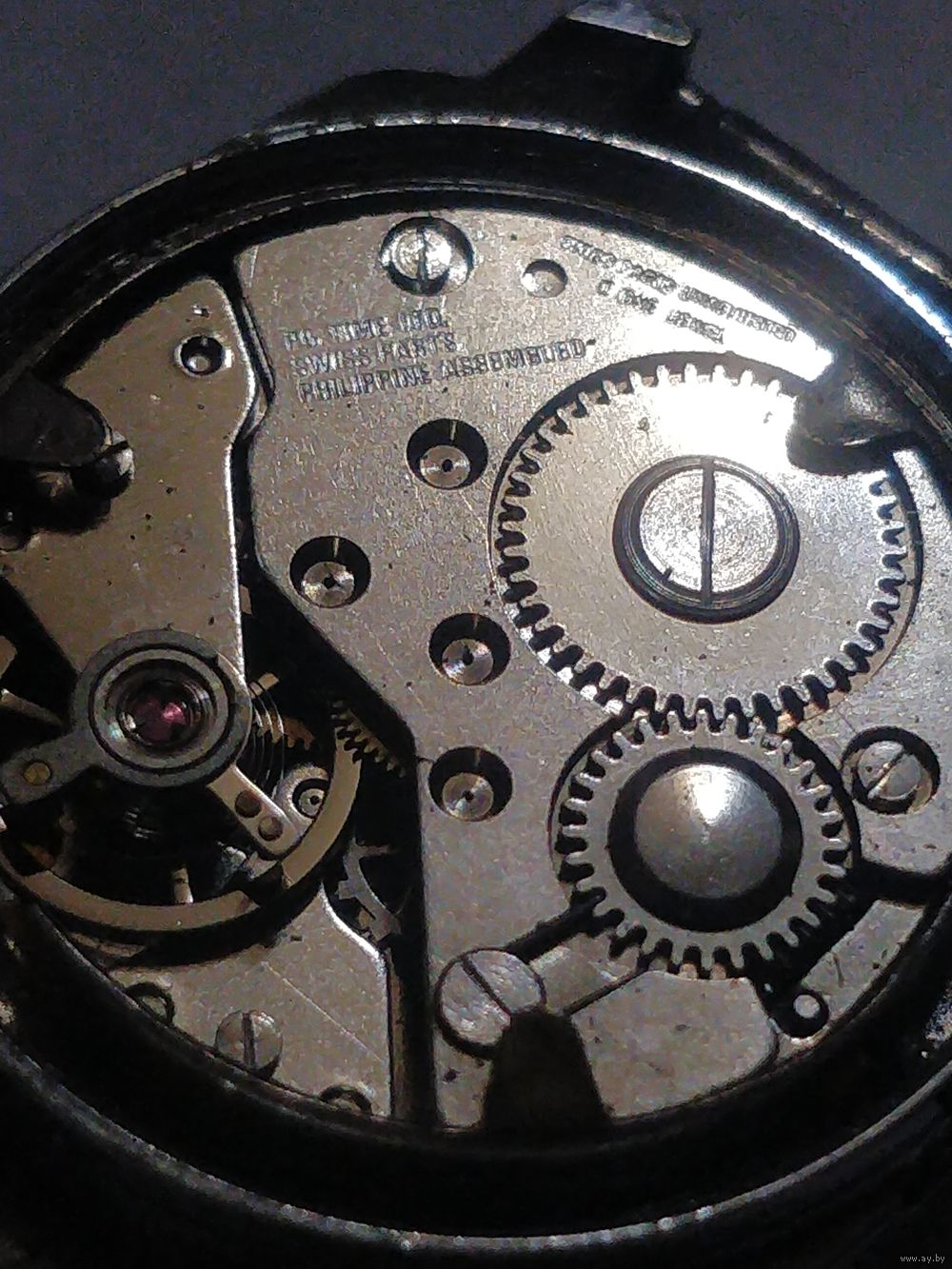 Часы нерабочие.Baumgartner (BFG) калибра 866 [1.19].На мосту механизма видна надпись «Swiss Harts» и «Philippine Assembled». Это указывает на швейцарское происхождение компонентов или дизайна («Swiss Parts»), в то время как окончательная сборка производилась на Филиппинах.