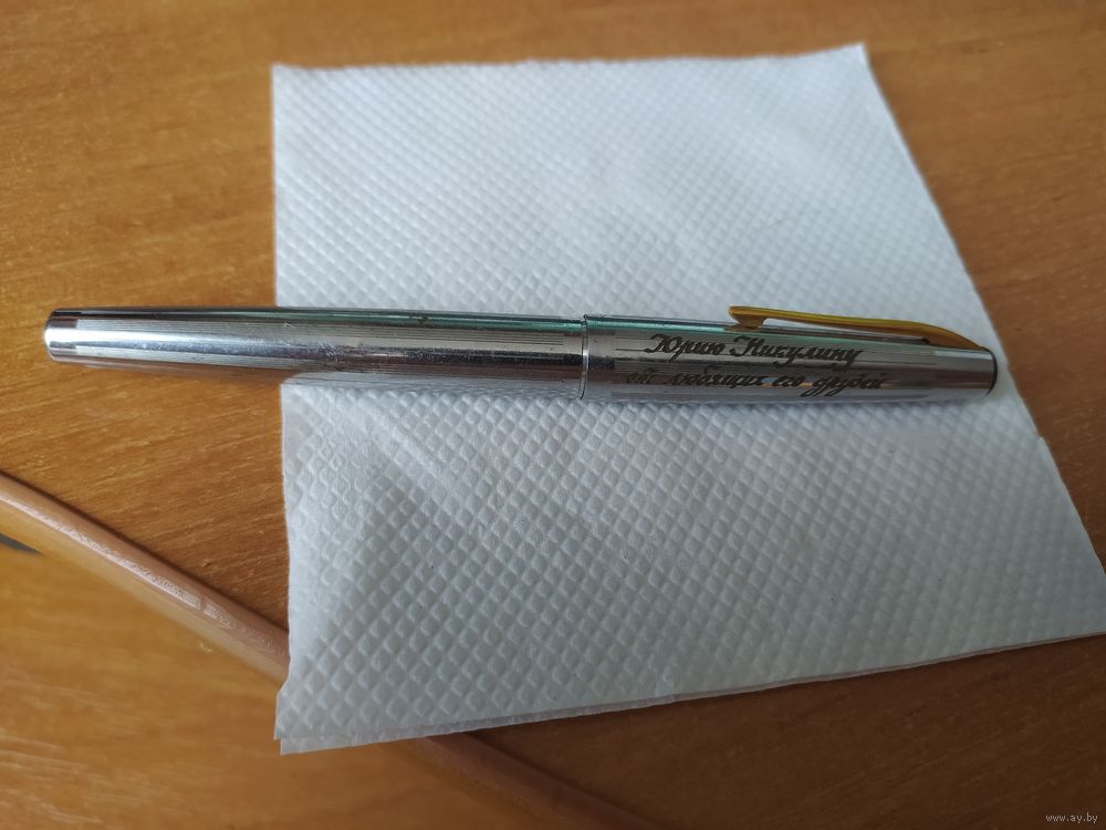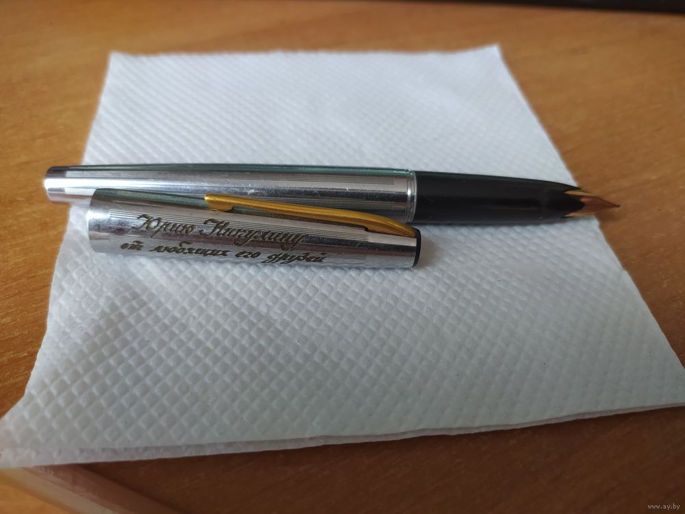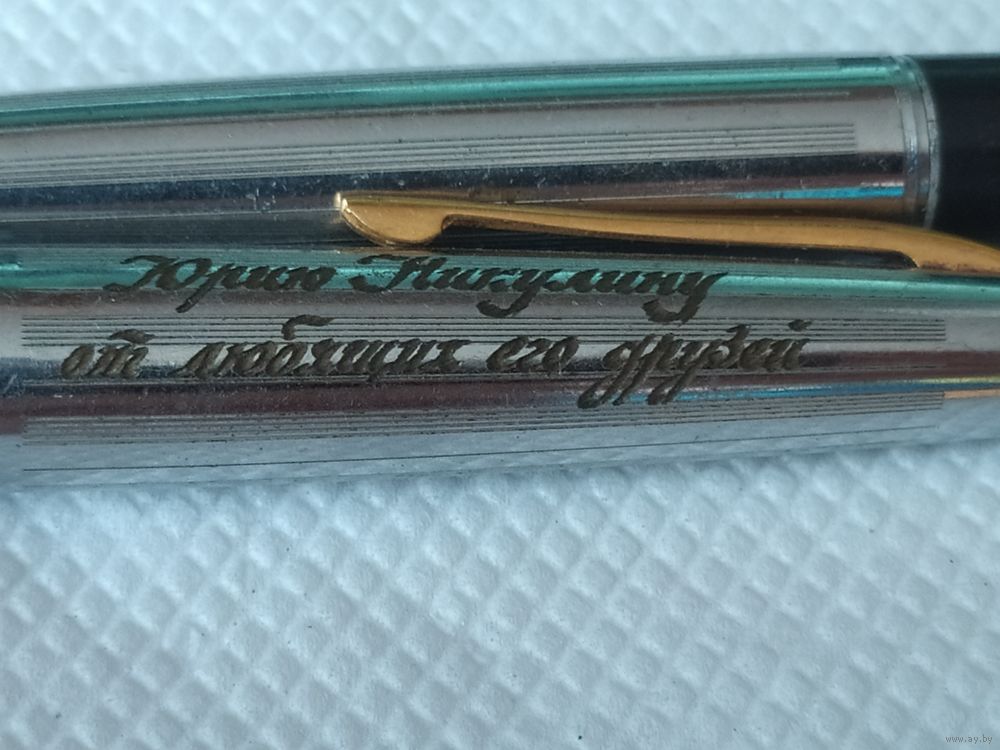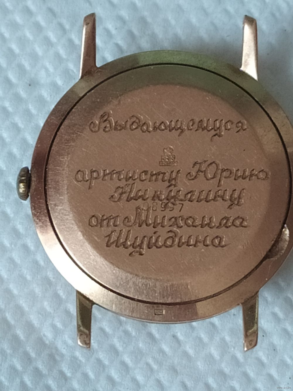 На часах дарственная надпись -" Выдающемуся артисту Юрию Никулину от Михаила Шуйдина" . На перьевой ручке с золотым пером и заколкой дарственная надпись "Юрию Никулину от любящих его друзей". Номер часов 08997 вес корпуса 14,5 грамм,; вес пера 0,5 грамм. Цена стартует с цены металла. 25 лет назад часы тикали, потом перестали.