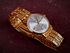 Тонкий корпус из нержавеющей стали, серебристый переливающийся циферблат с фрезерованными тонкими лучами и черными цифрами. Черные стрелки ,секундная золотая.
