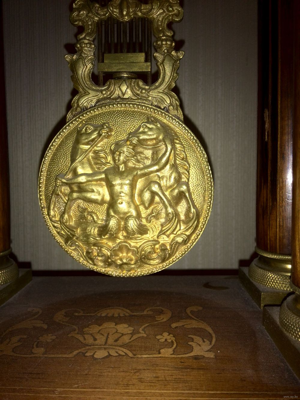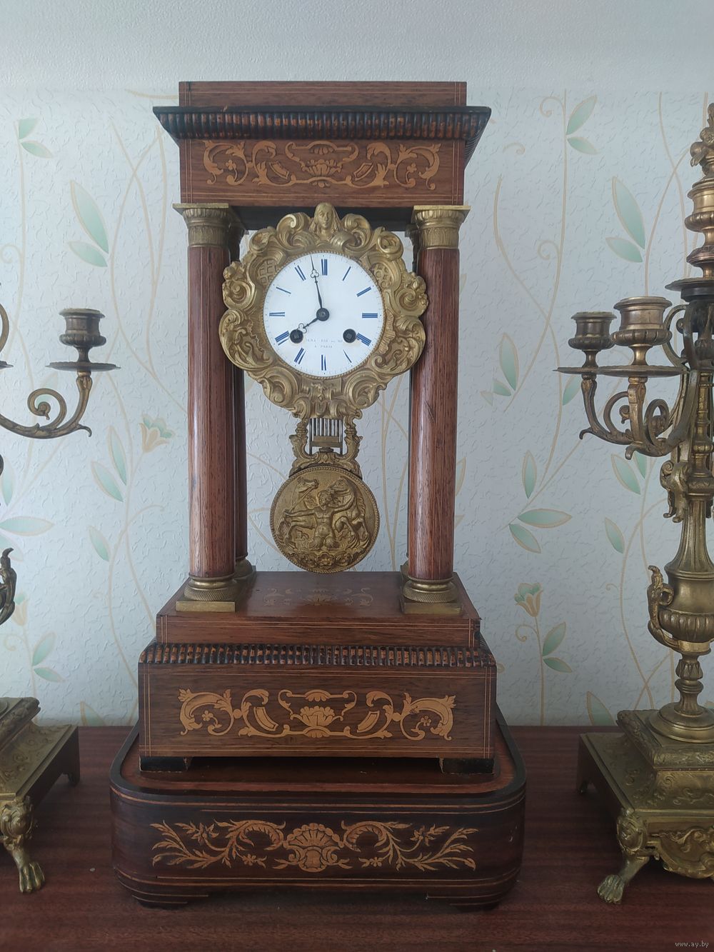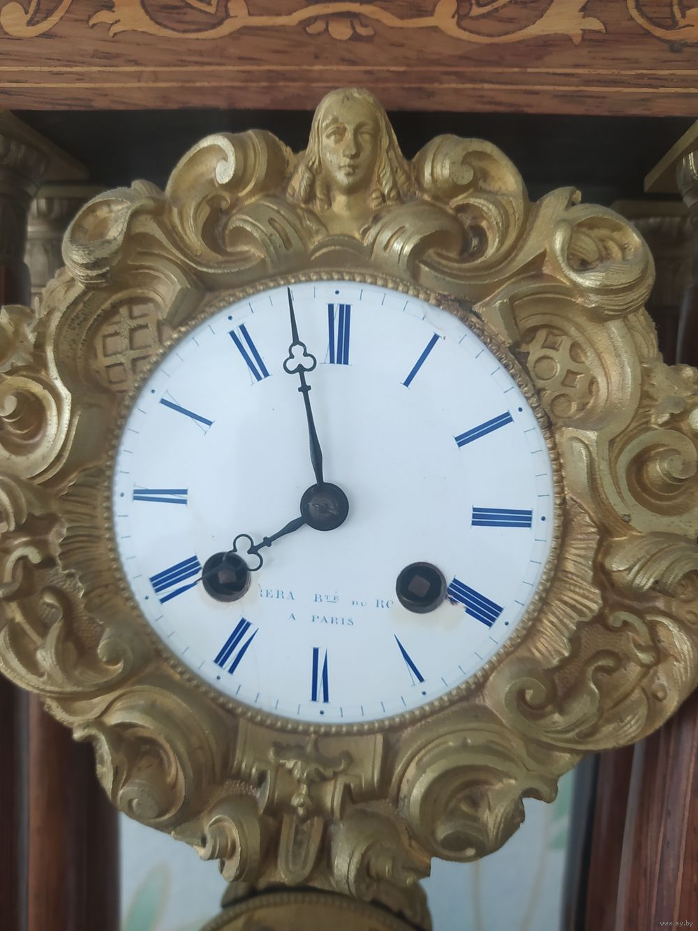 Исправны и на ходу, часовой и получасовой бой, инкрустация шпоном, бронзовые вставки, маятник и окантовка циферблата бронзовое литье, механизм и маятник родные, везде клейма, без вмешательств, ключ есть, но не родной Часы без подставки 46 см., с подставкой +9 см.