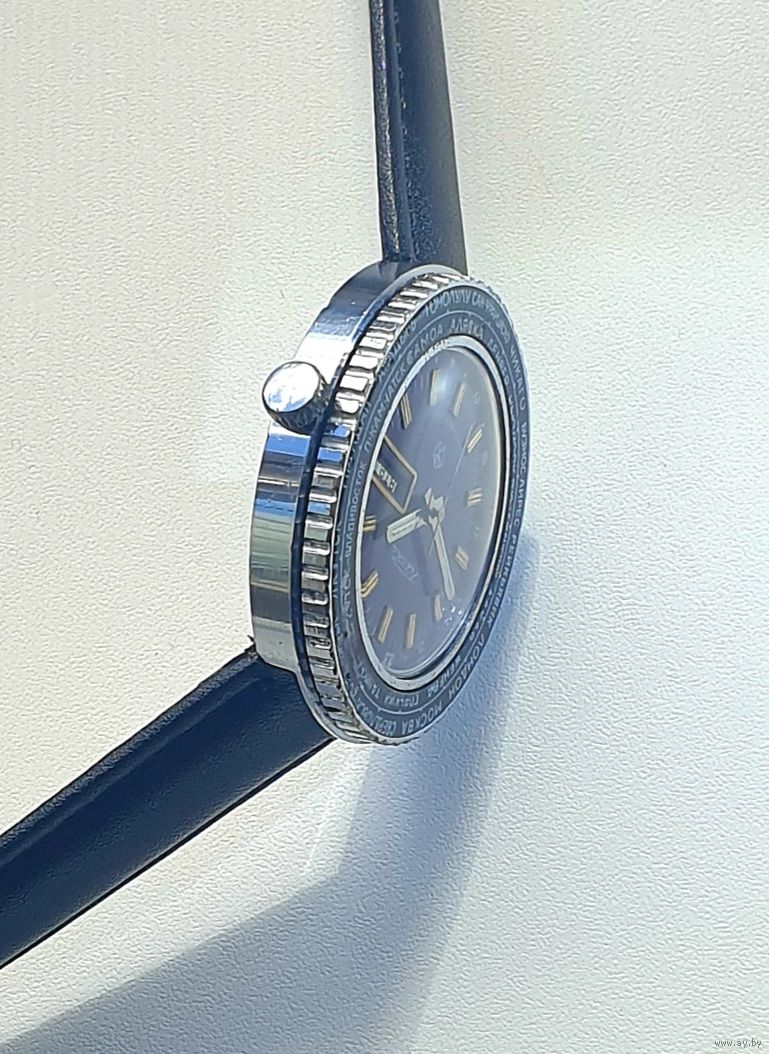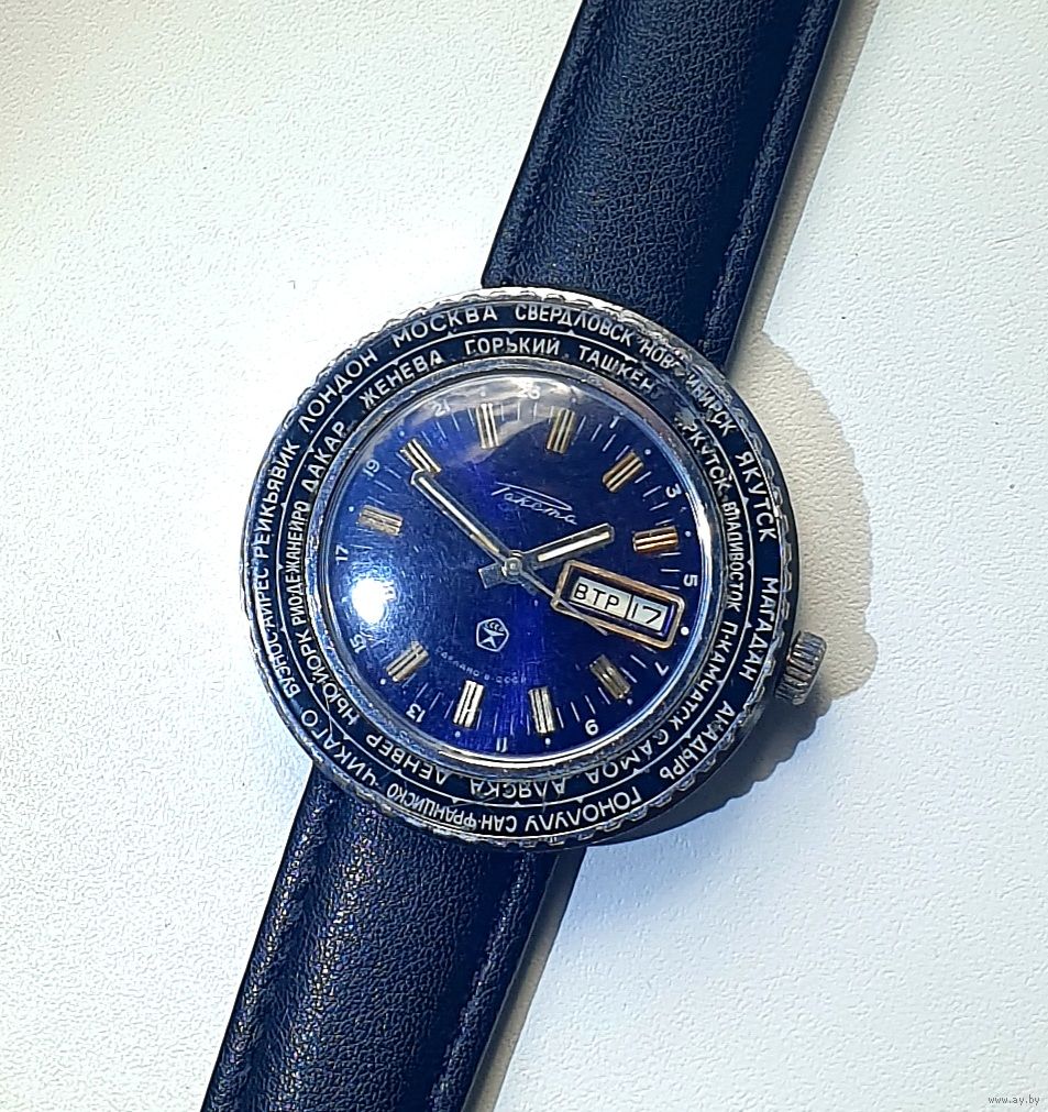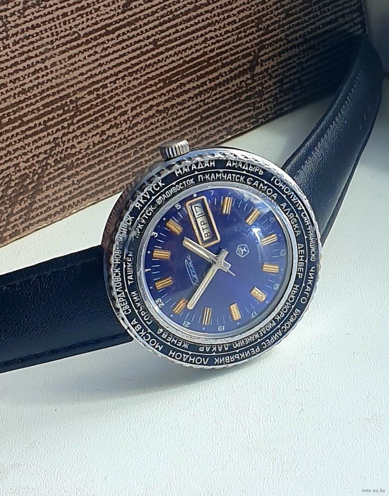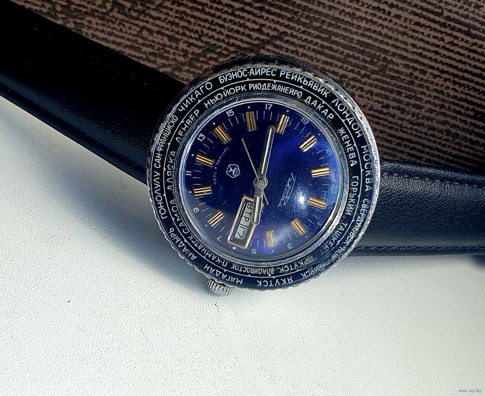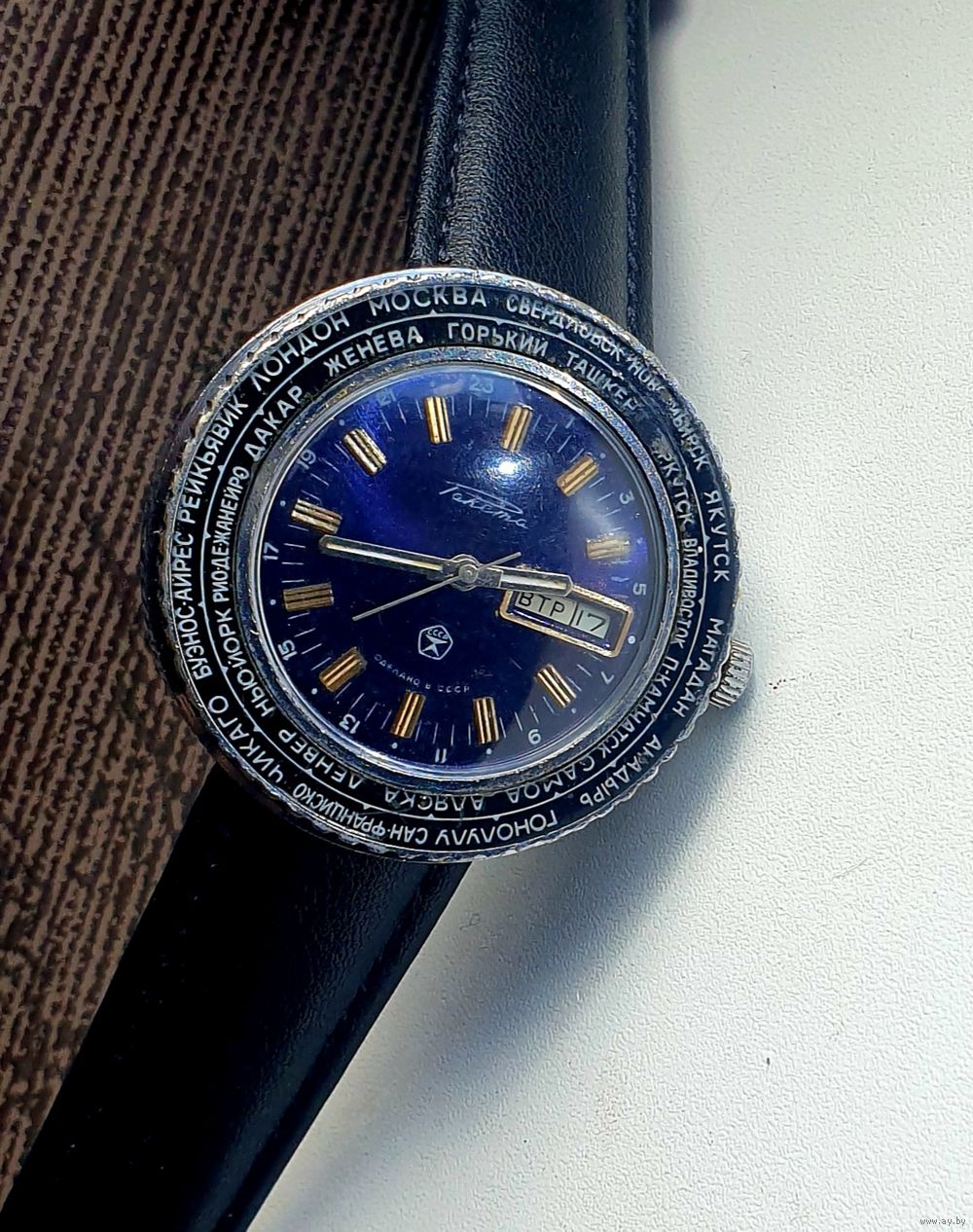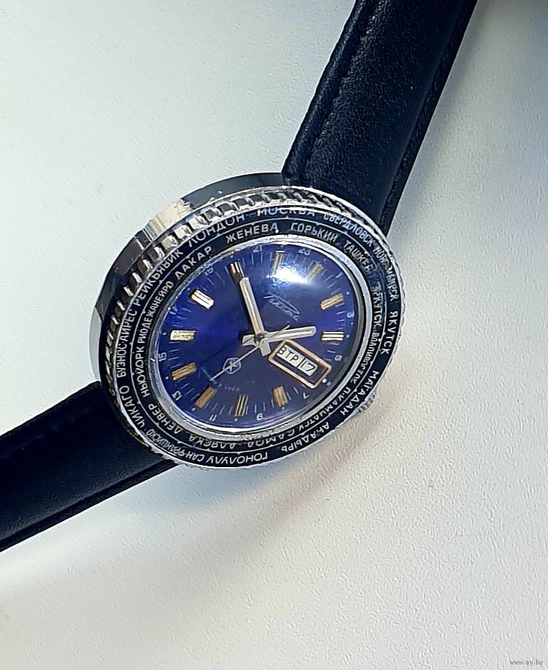 Довольно интересные и стильные часы 80 - х,для путешественников. Очень удобно определять время по шкале городов выставляя из безелем. Часы на ходу в хорошем сохране , календари переключаются , безель вращается не заедает, нов. рем. в комплекте.