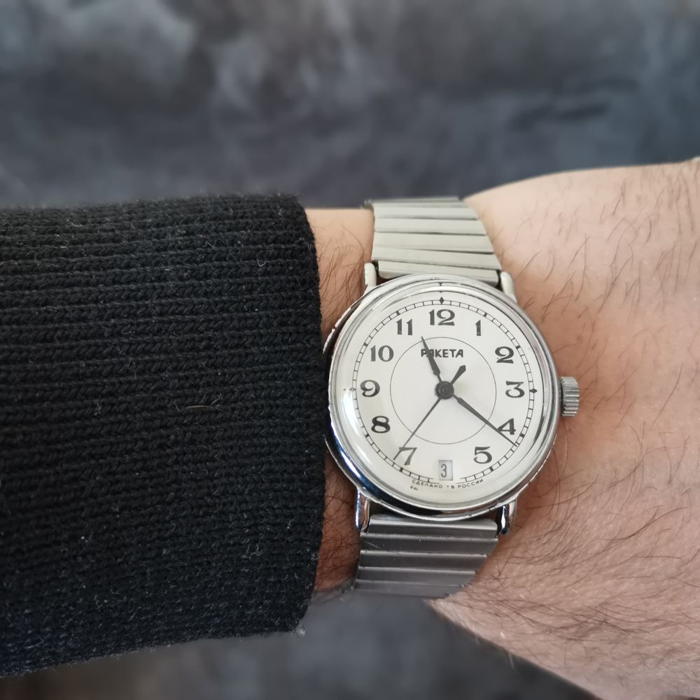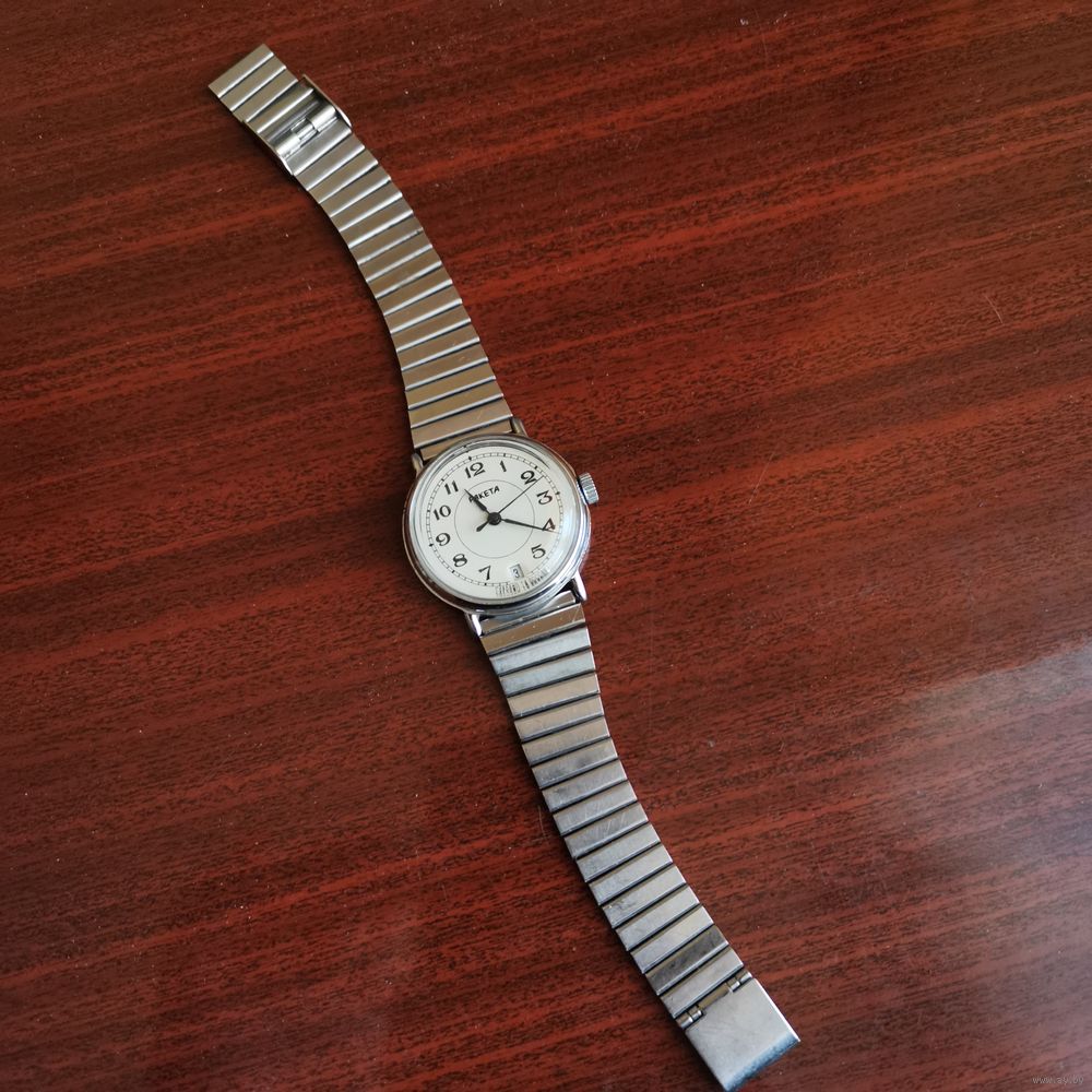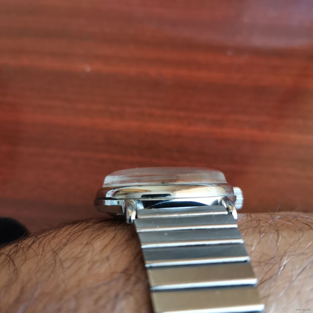 См. фотографии. Отличная сохранность. В нижней части показывают дату. Часы заводятся Идут точно, бодро и уверенно. Добротный металлический браслет в комплекте. | |