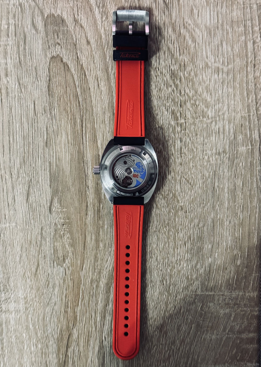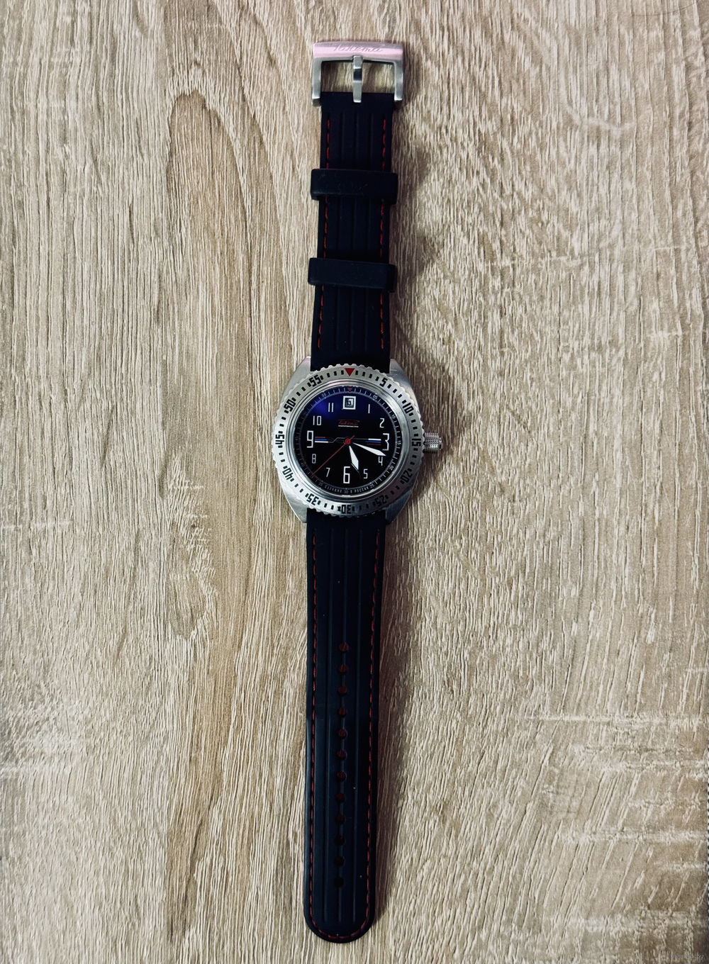 В комплекте: фирменная упаковка (подарочный пакет и коробка); черно-красный силиконовый ремешок (на фото); синий кожаный ремешок (также был в комплекте с часами, в двух местах чуть-чуть начала облазить кожа, не критично, предоставлю фото по запросу).