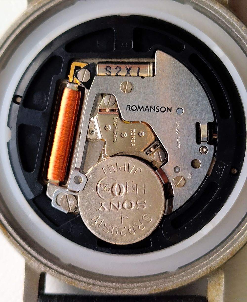 Кварцевый механизм часов марки Romanson. Внутри установлен калибр производства швейцарской компании Ronda с одним камнем (1 Jewel).