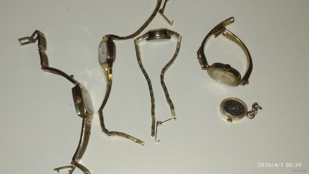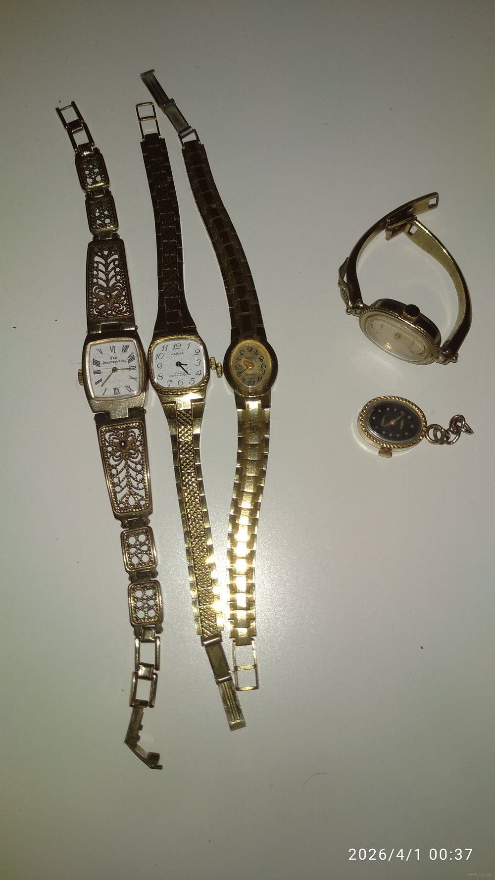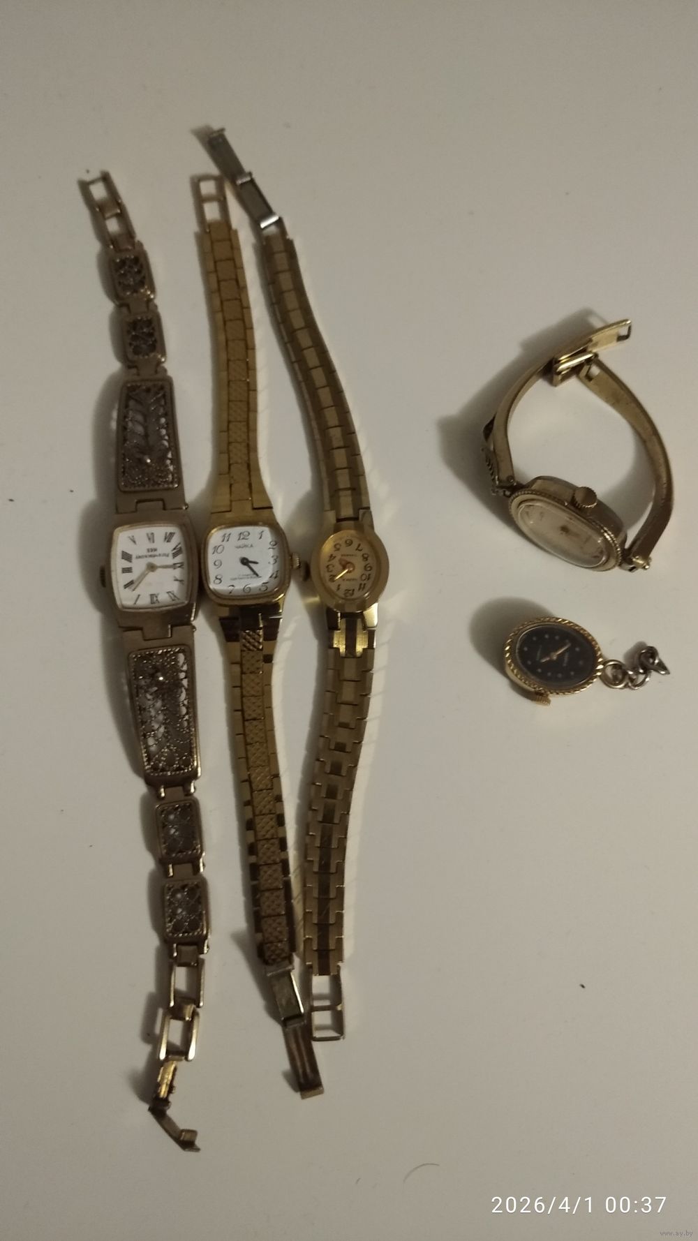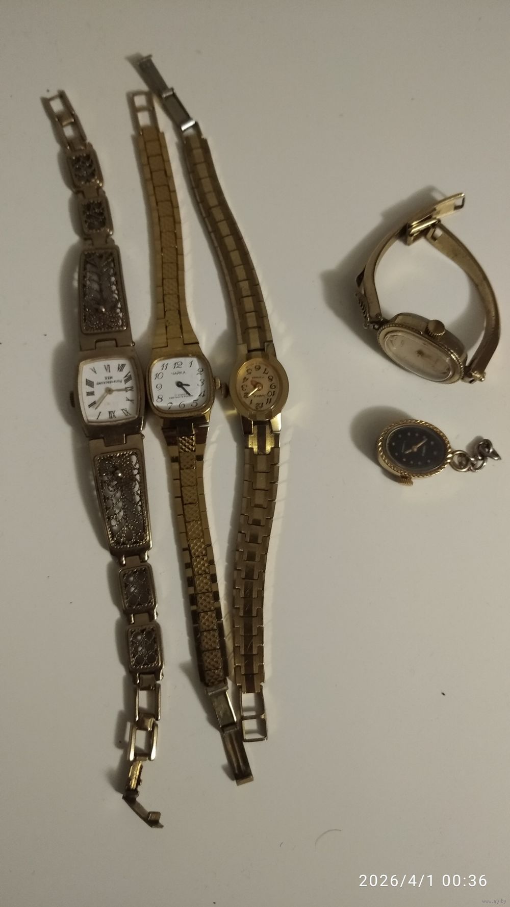Трое часов с клеймами. Двое без клейма а именно маленькая чайка без браслета и луч с остатками браслета