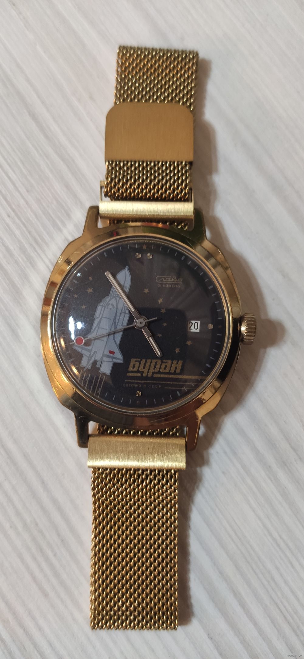 Часы Слава "Буран" сделано в СССР, 1988 года выпуска. Механизм: 2414 (механика, ручная сборка). На 21 рубиновом камне.