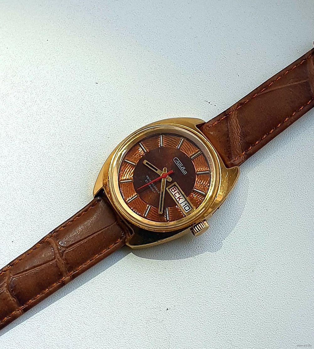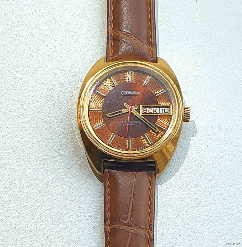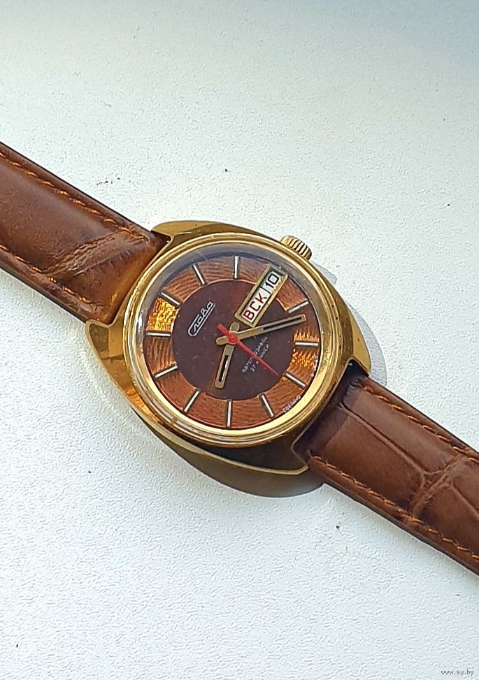 Часы Слава - грампластинка , с автоподзаводом с двумя календарями , всё переключается , кнопка работает , в комплекте с нов. рем.