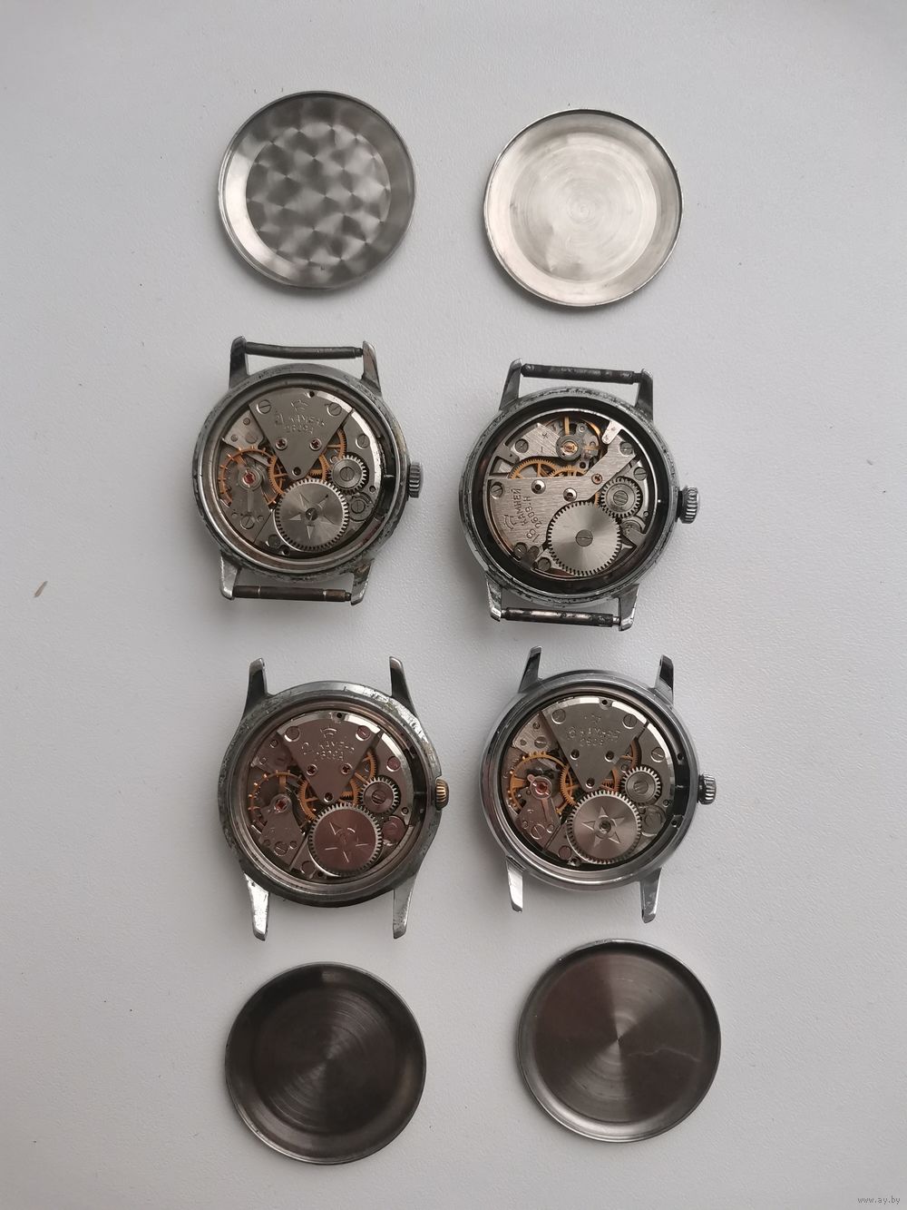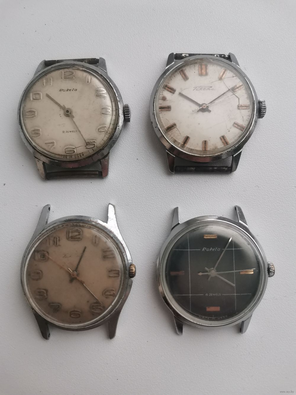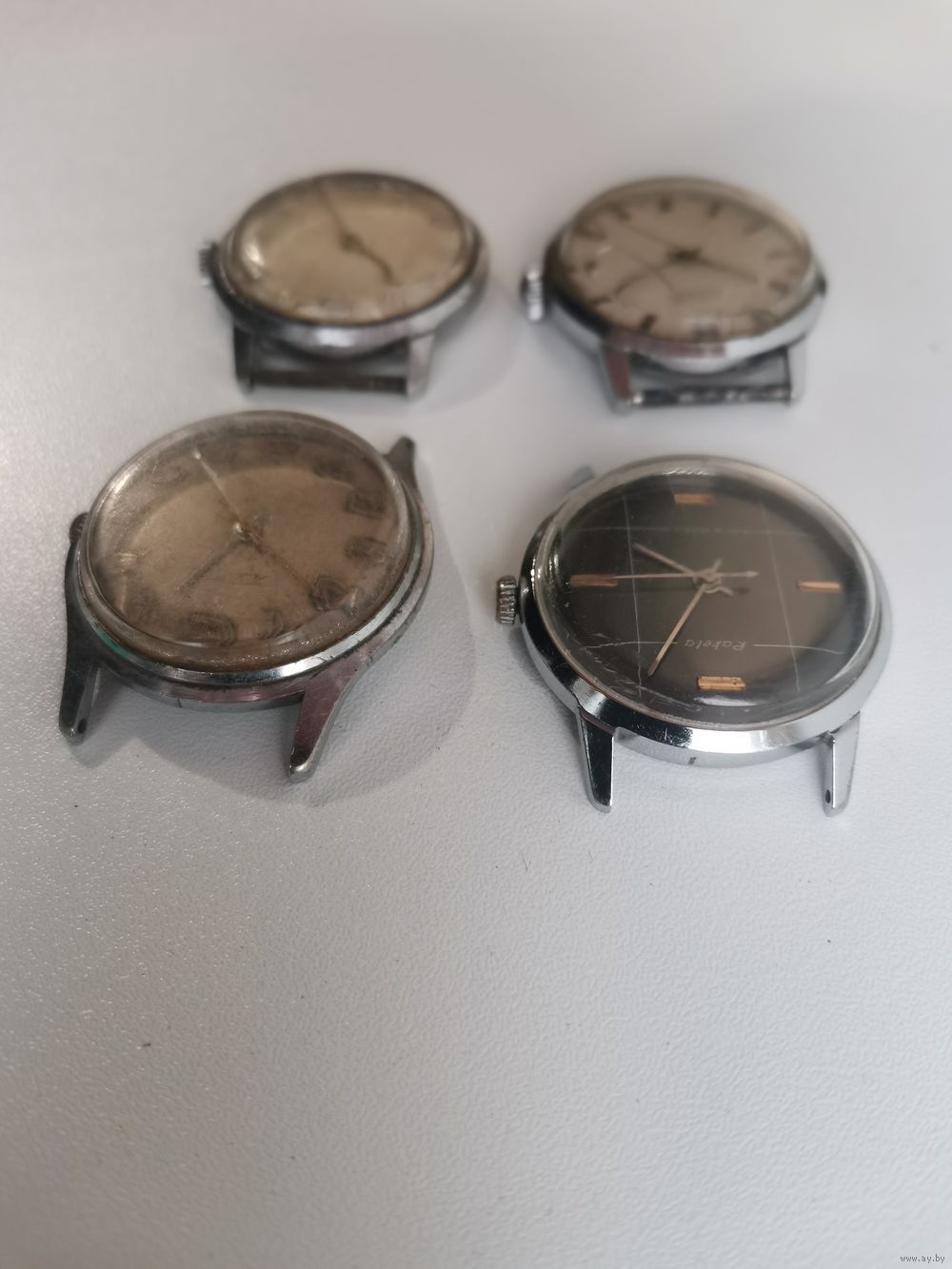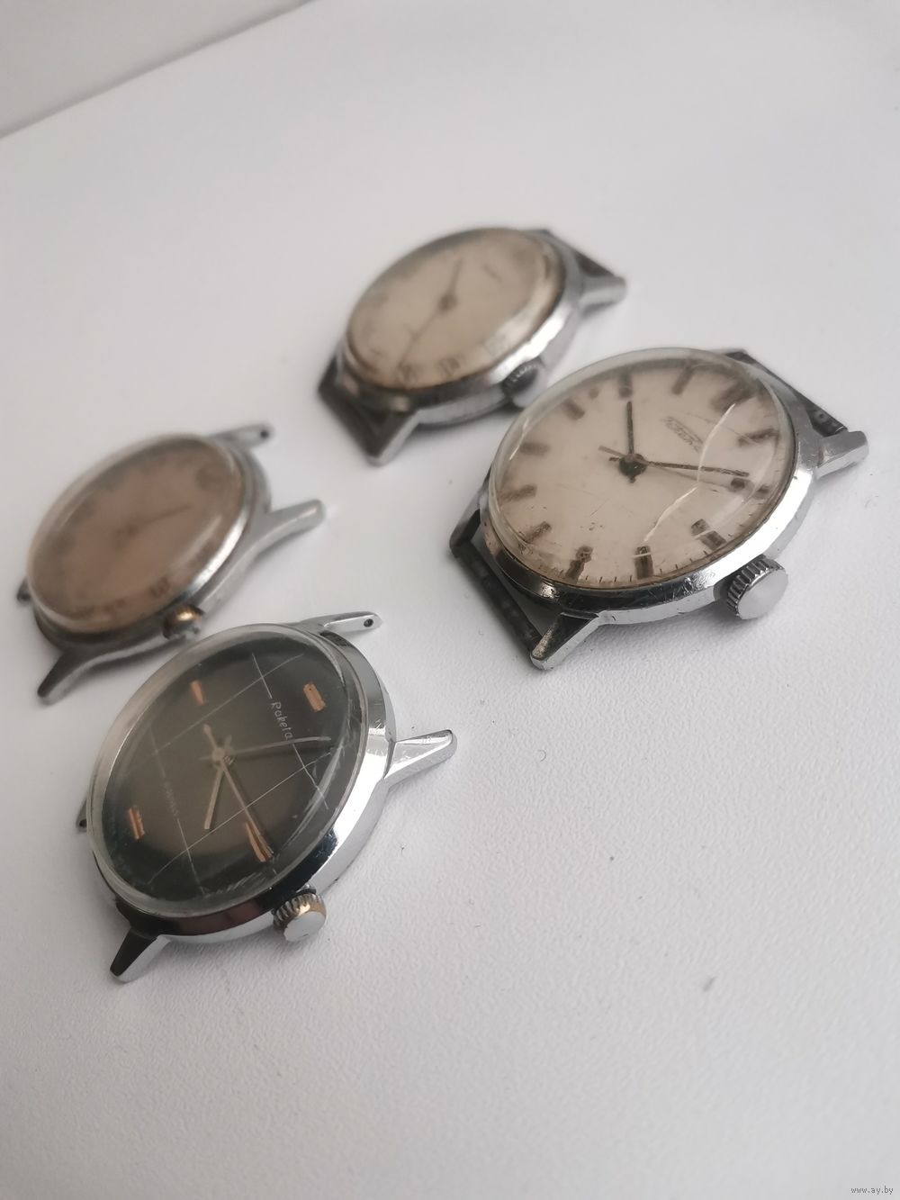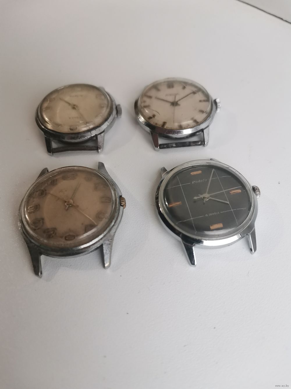 | См. фотографии. Двое верхние на первом фото на бодром. У всех балансы целые. Чёрный циферблат шикарный и его корпус. | |