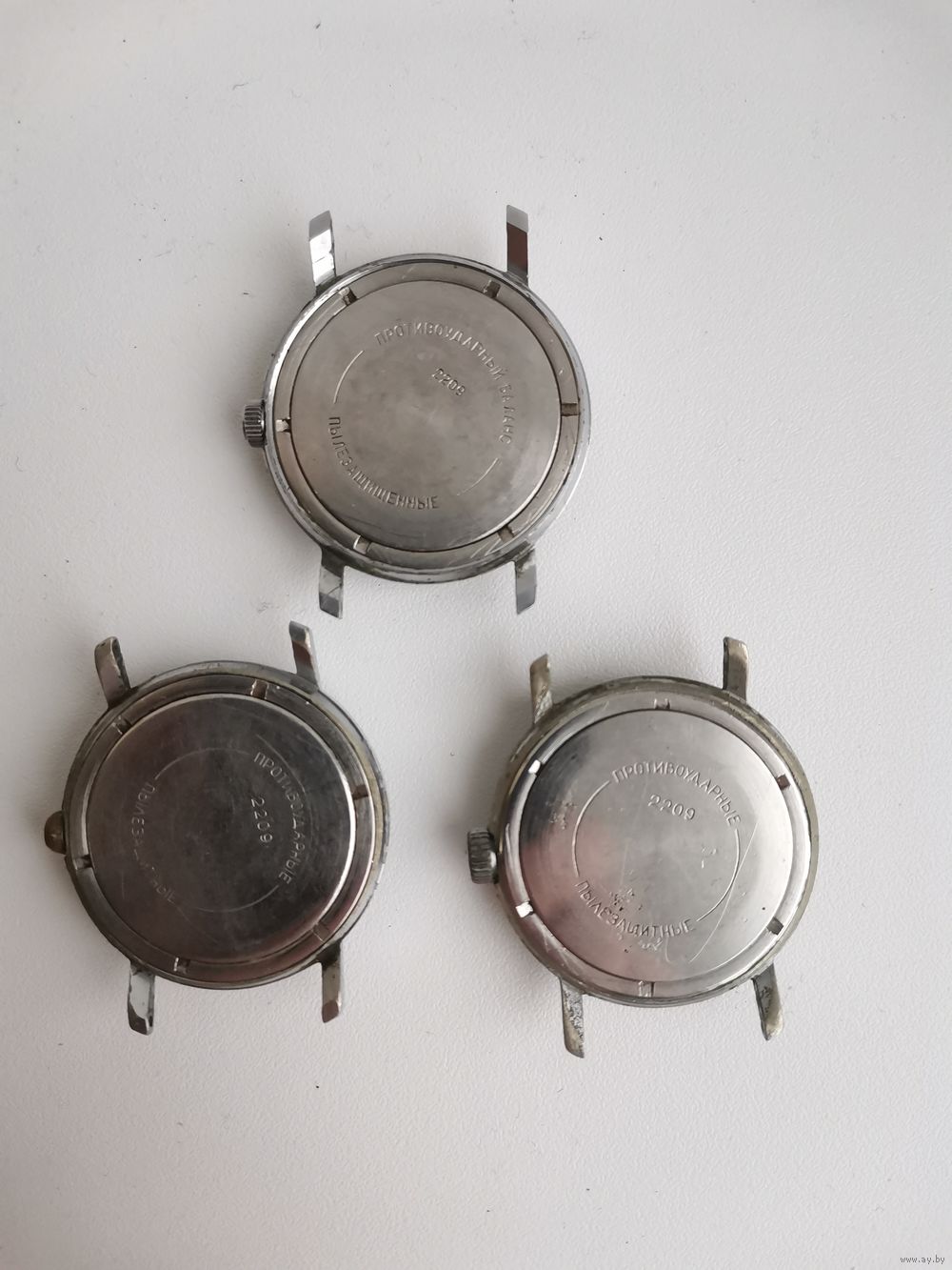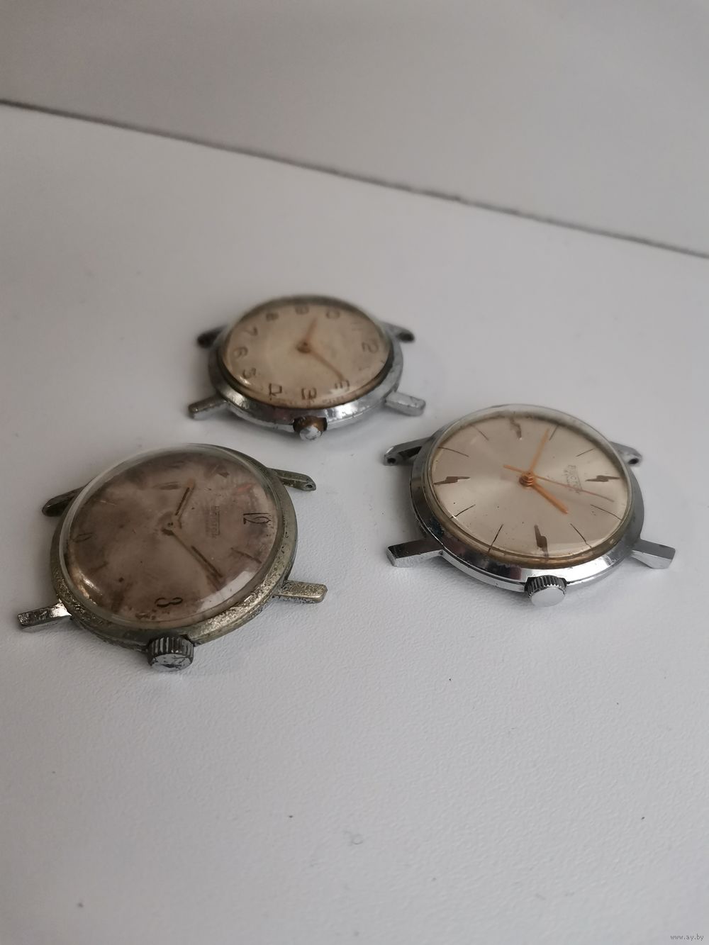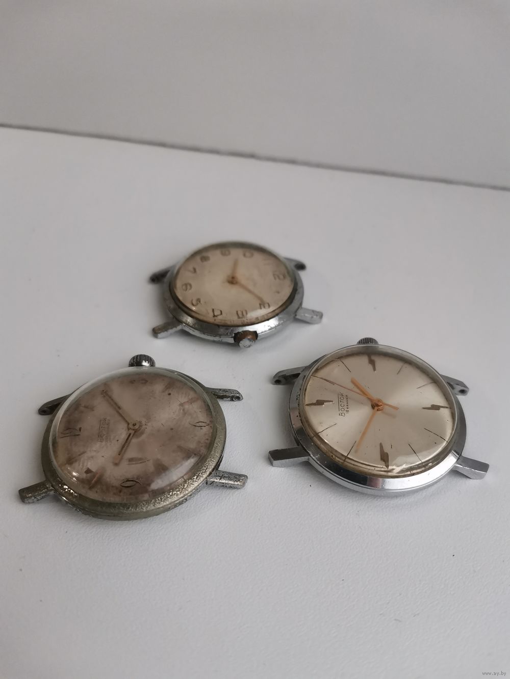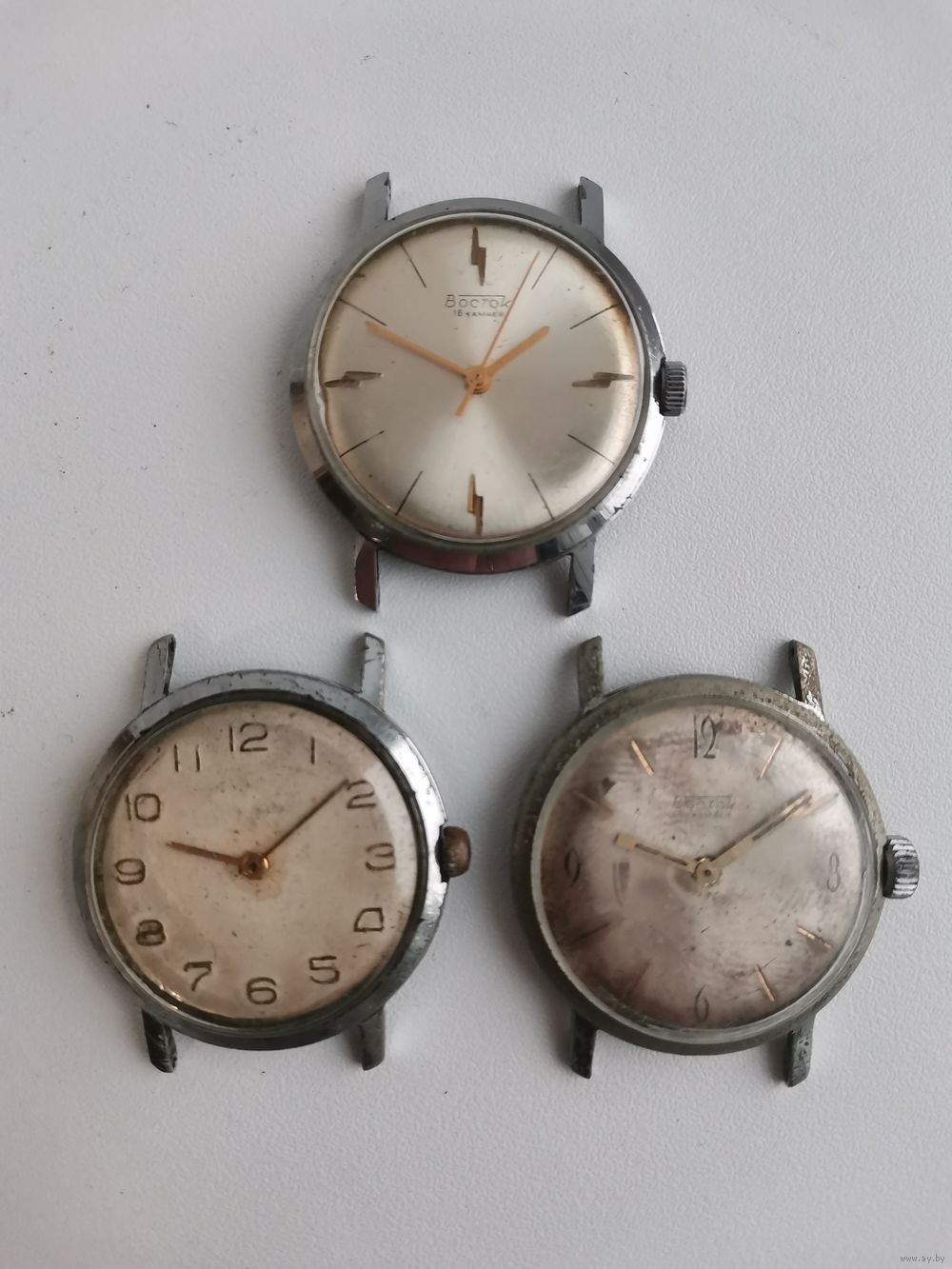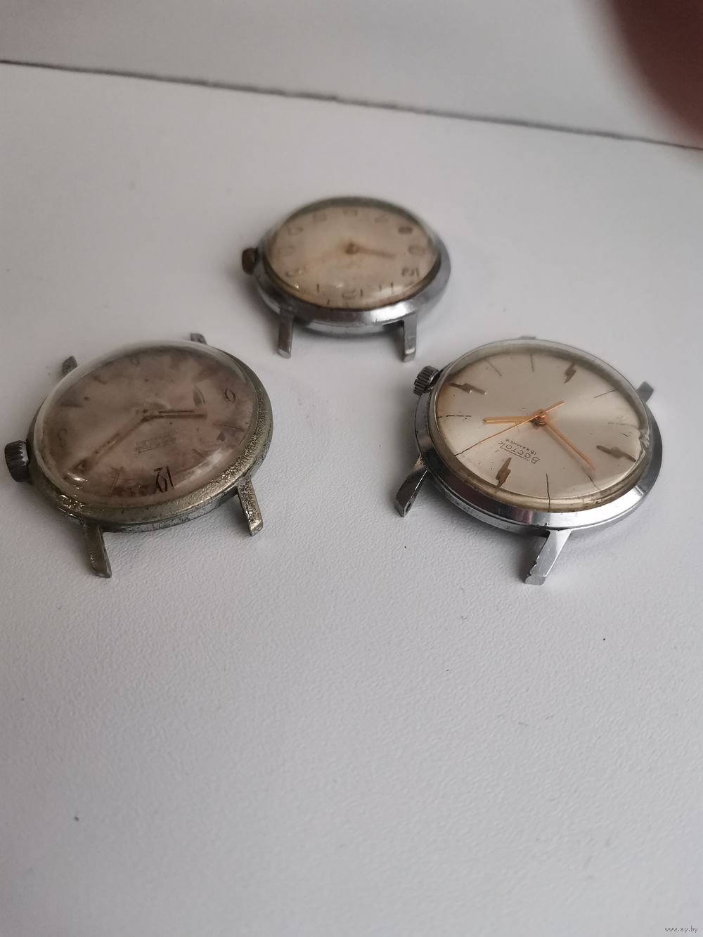 | См. фотографии. Двое на ходу в тех корпусах, что похуже. В лучшем корпусе не на ходу, но неплохой циферблат. Все балансы целые. | |