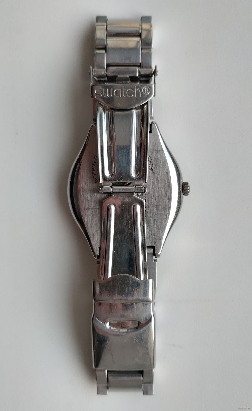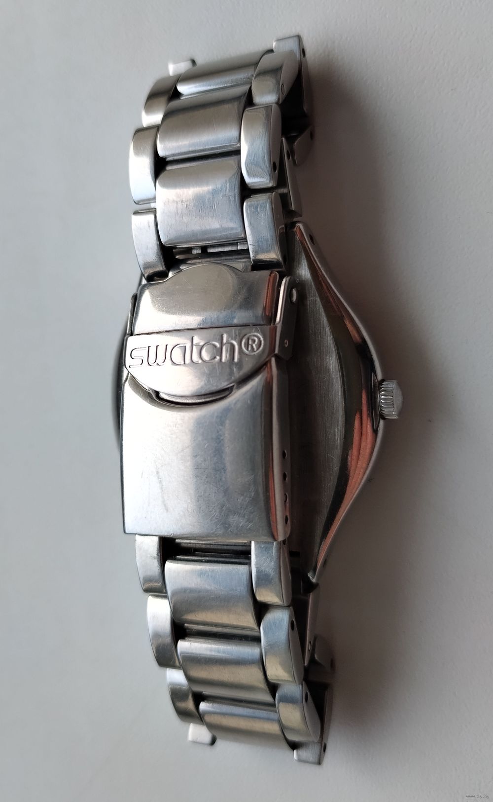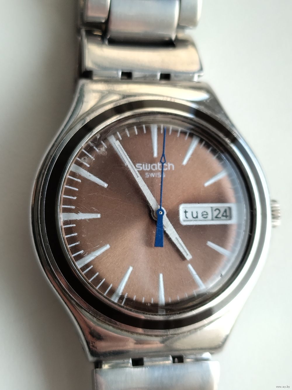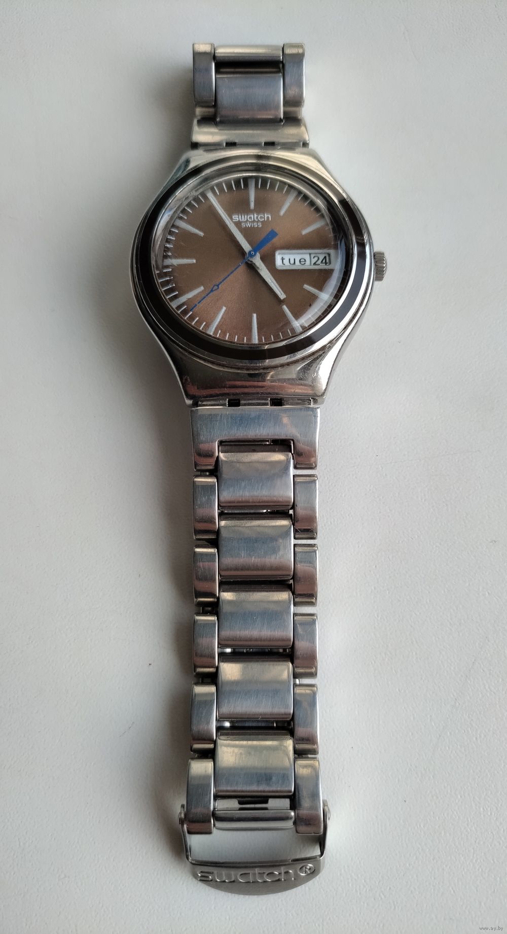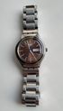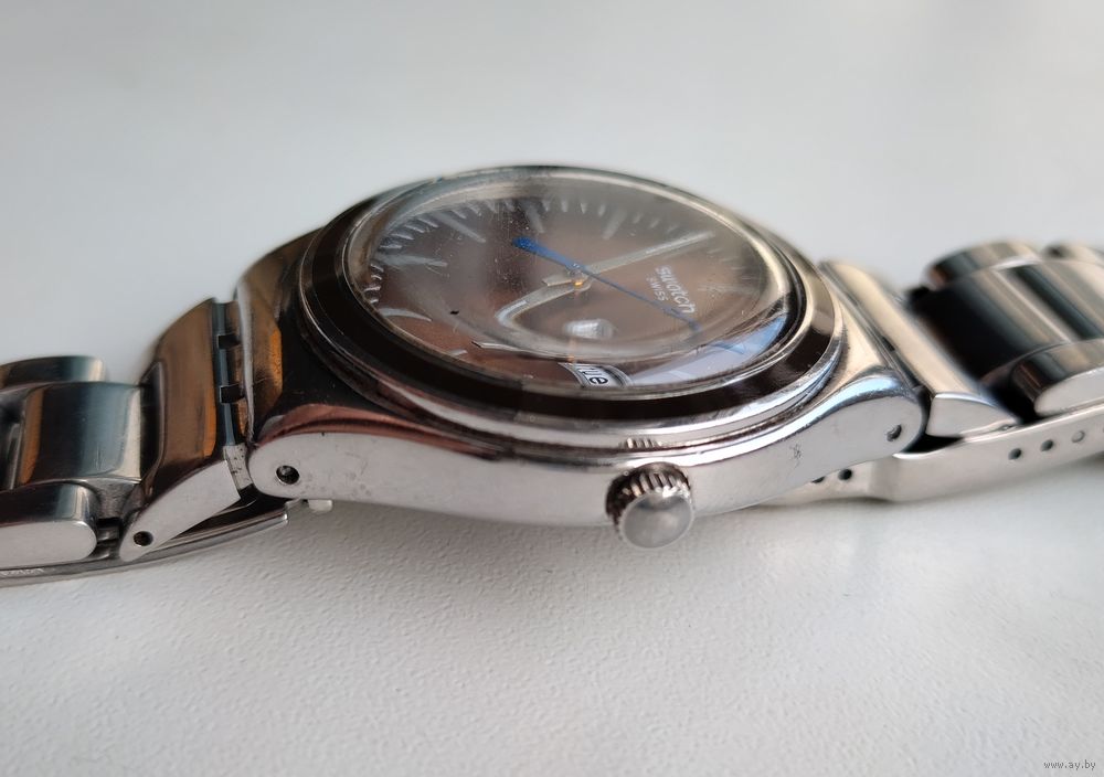 Швейцарские наручные часы Swatch из коллекции Irony. Судя по визуальным характеристикам (коричневый циферблат с эффектом «солнечные лучи», белые индексы, индикация дня недели и даты, синяя секундная стрелка), эта модель идентифицируется как Swatch Irony Brown Suit (артикул YGS748).