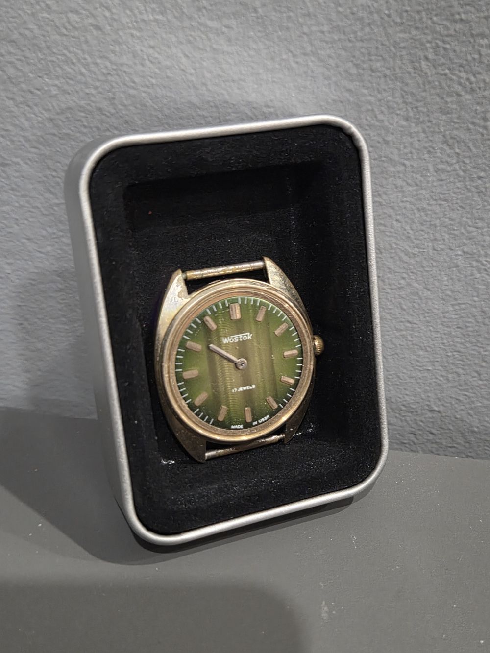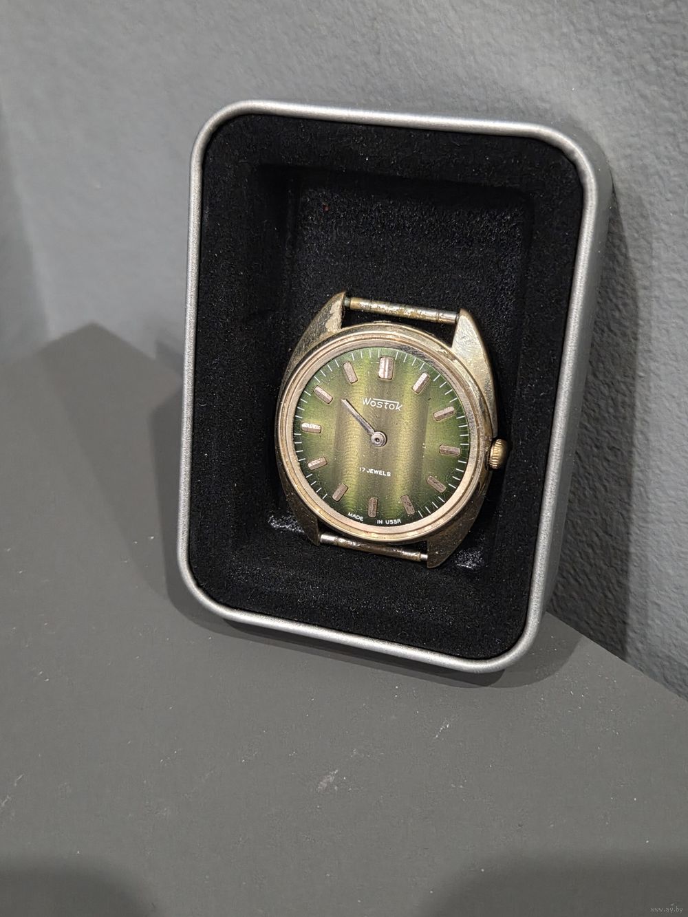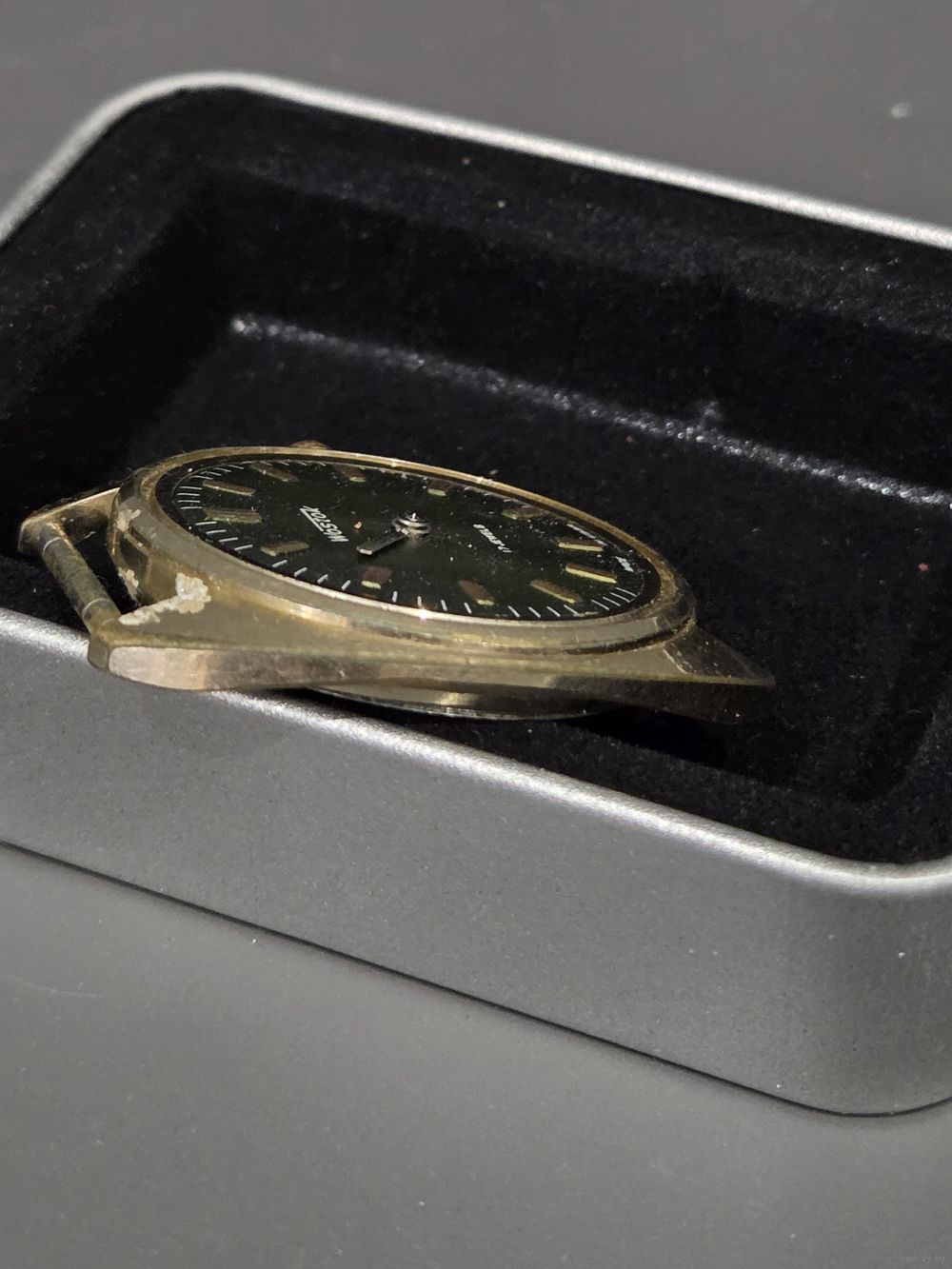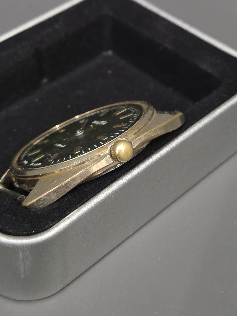 Часы на ходу. Нет минутой стрелки, по часовой стрелке ход точны. Нет стекла. Корпус и циферблат в очень хорошем состоянии. Под восстановление или на запчасти. Часы из личной коллекции. Коробочка в комплекте.