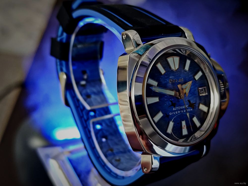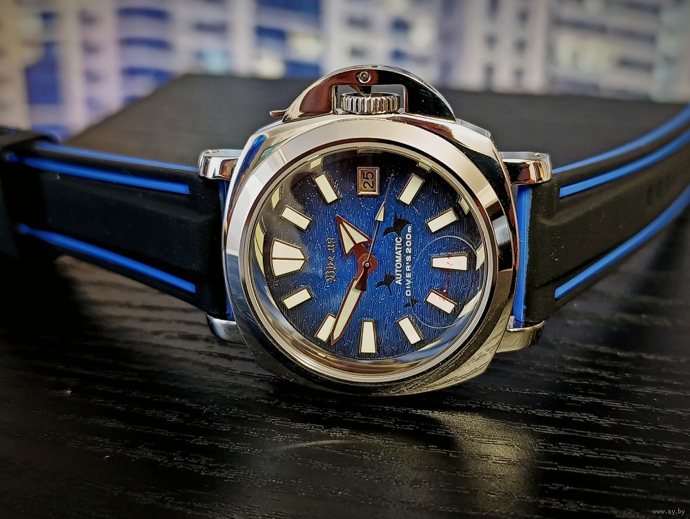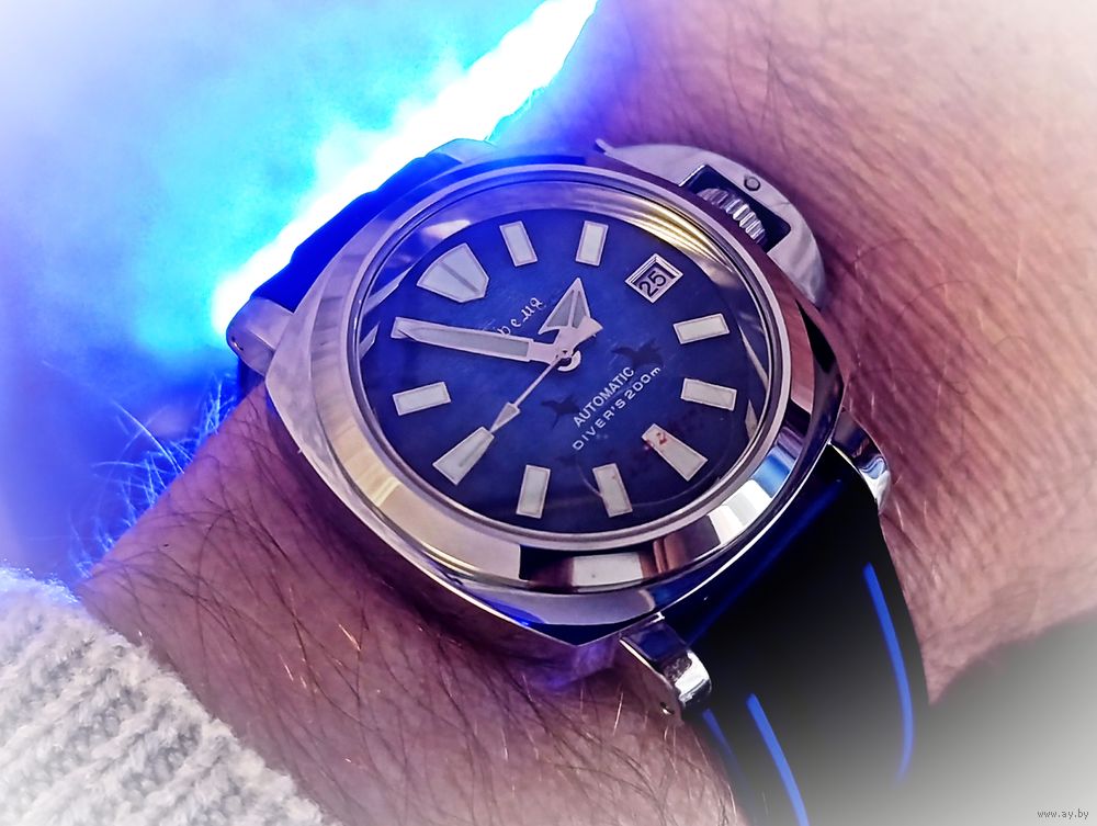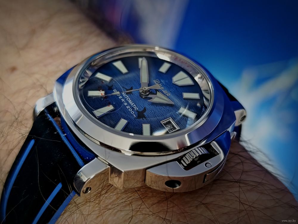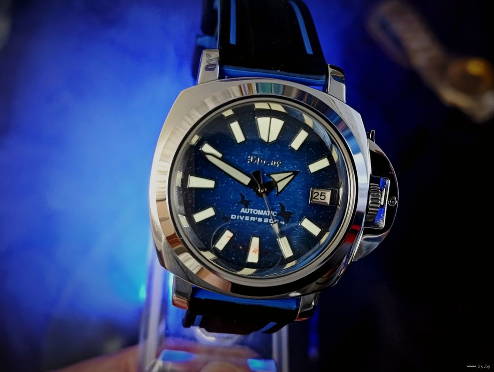 Чёрно-синий гильошированный циферблат с датой календаря .