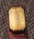 Циферблат цвета шампанского заключен в прямоугольный металлический корпус золотистого цвета.